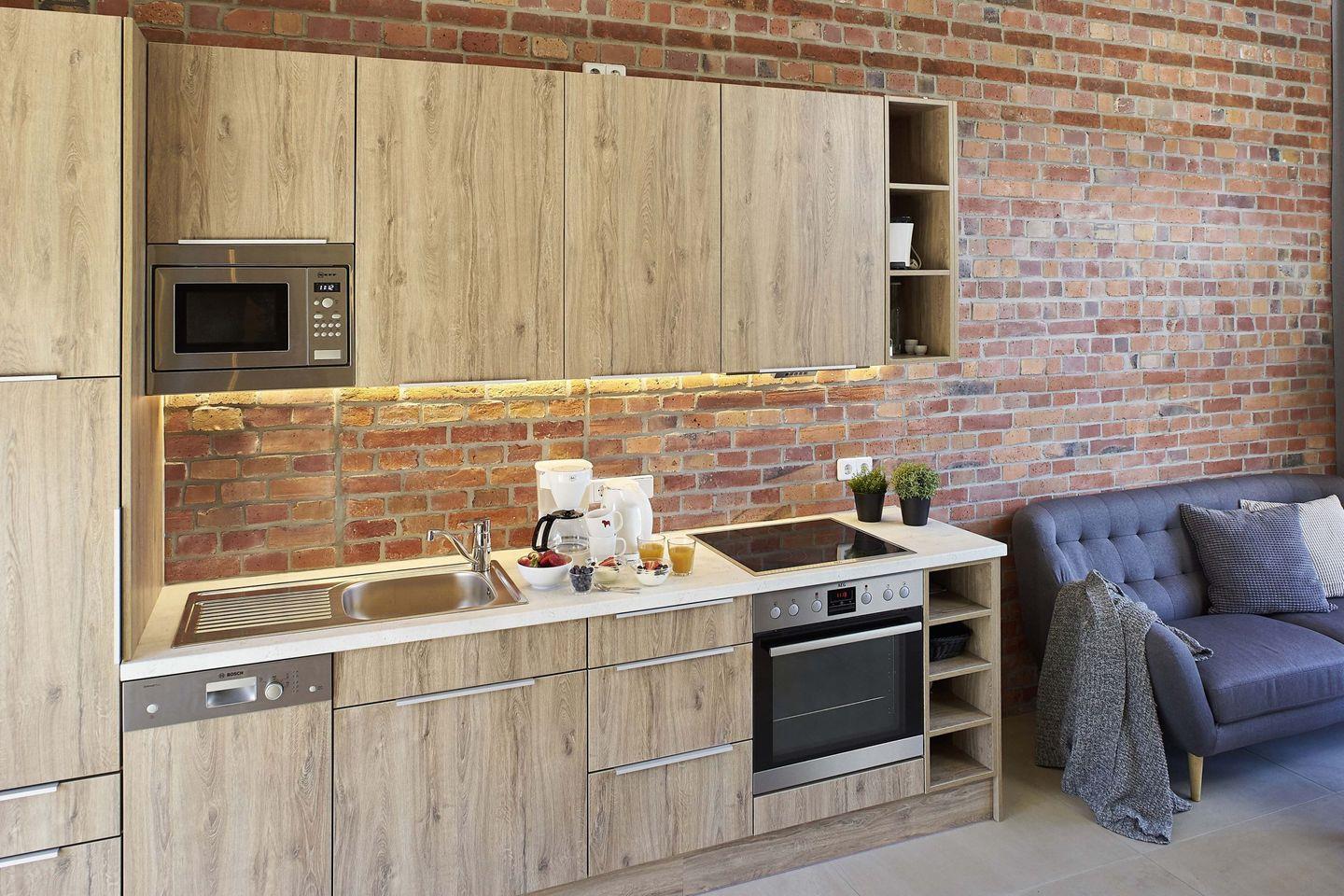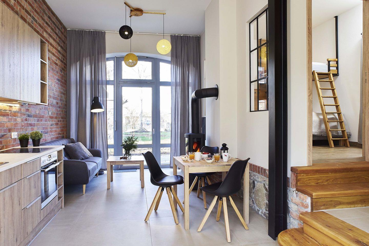 Der lichtdurchflutete Wohn- und Küchenbereich mit 2 großen verglasten ehemaligen Toren gibt ein sehr schönes Raum- und Wohlfühlgefühl, das durch den holzbefeuerten Kamin abgerundet wird. Eine moderne, gut ausgestattete Küche mit Spülmaschine, Herd, Backofen, Mikrowelle, Kühlschrank mit Gefrierfach, gemütliches Sofa, Essecke, Smart-TV und Musikanlage tragen zur Gemütlichkeit bei.
