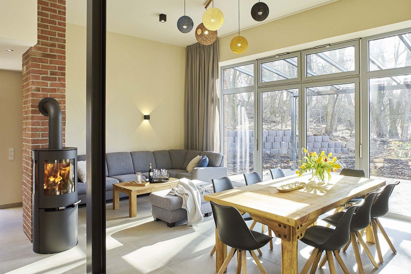 Eine moderne, sehr gut ausgestattete Küche mit Spülmaschine, Backofen, Herd, Mikrowelle, großer Kühlschrank mit Gefrierfach, das Wohnzimmer mit Essecke, gemütlichem Ecksofa, Smart-TV, Teufel-Musikanlage und ein holzbefeuerter Kaminofen sorgen für gemütliche Stunden und runden das Wohlfühlerlebnis ab.