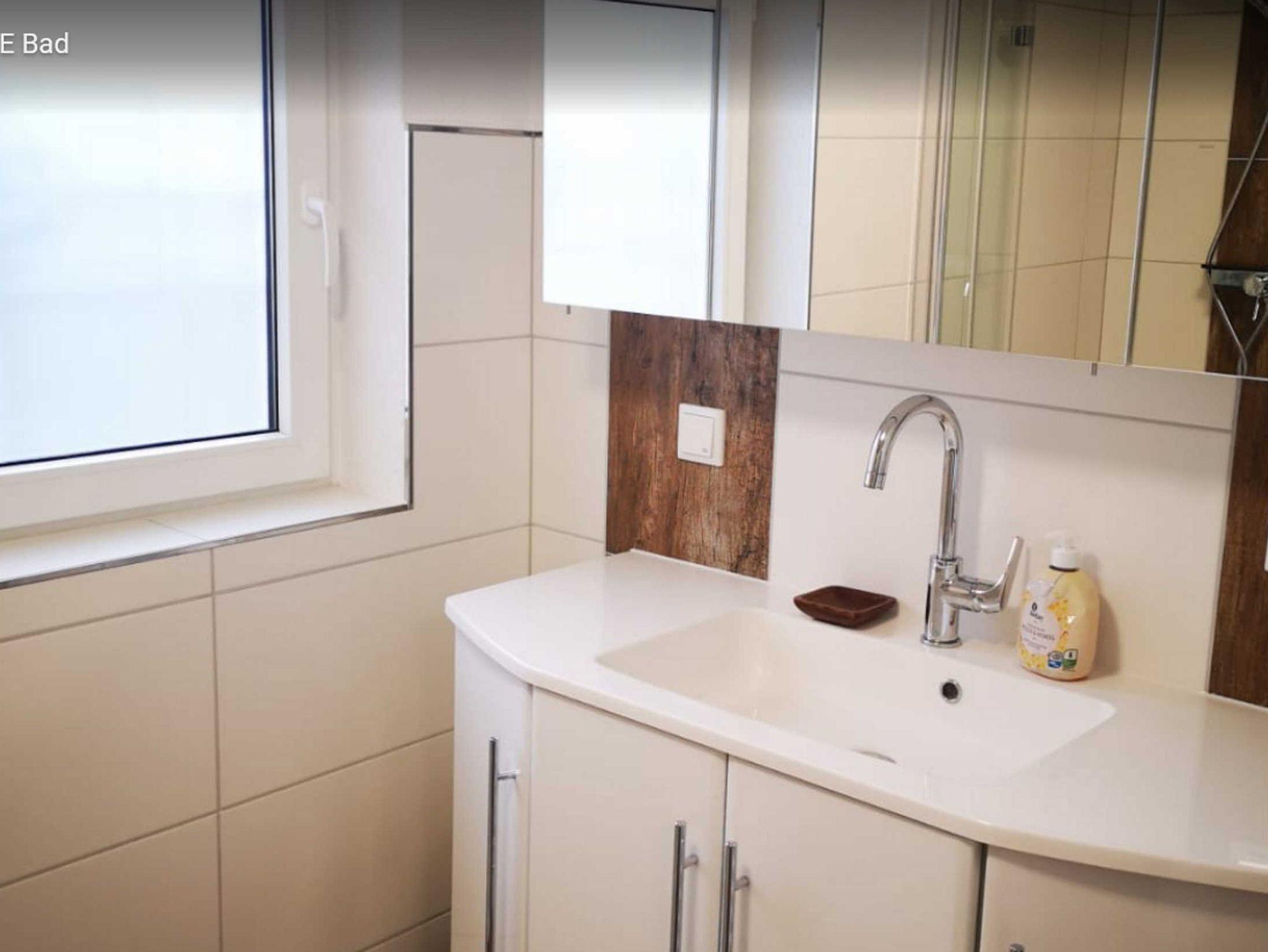 Das Tageslicht-Duschbad besteht aus einer 70 x 100 cm großen ebenerdigen Duschkabine mit Glastüren, einem WC, einer Handtuch-Wandheizung, einem Waschtisch mit zwei Schubladen und Wandspiegel und einem offenen Regal. Ein Haartrockner und ein Vorleger vor der Dusche gehören zur Ausstattung, Handtücher sind im Mietpreis inklusive.