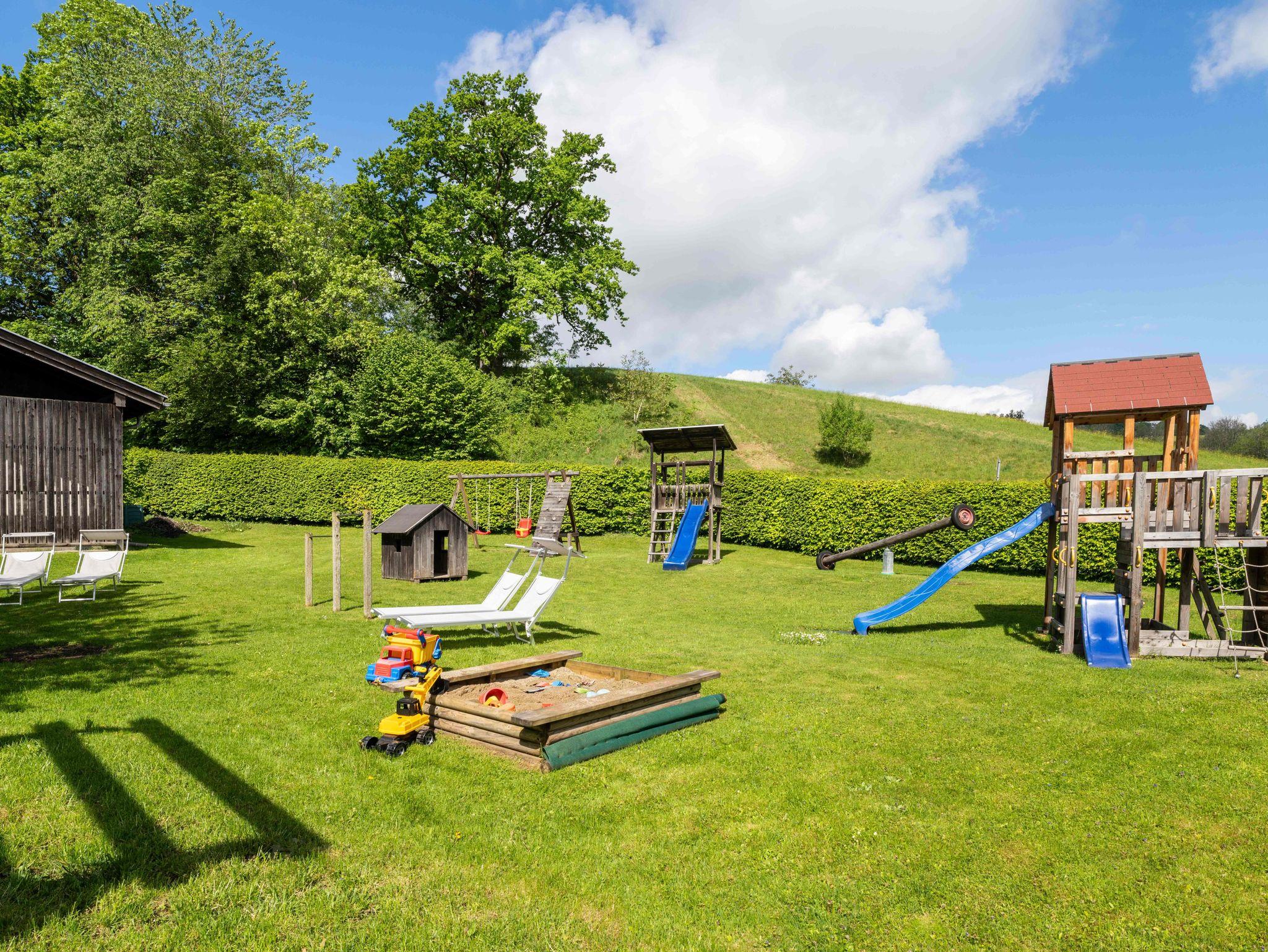Während sich die Kinder auf dem Trampolin, der Schaukel oder im Sandkasten austoben, genießen Eltern entspannte Stunden unter freiem Himmel – umgeben von der traumhaften Naturkulisse des Chiemgaus.
