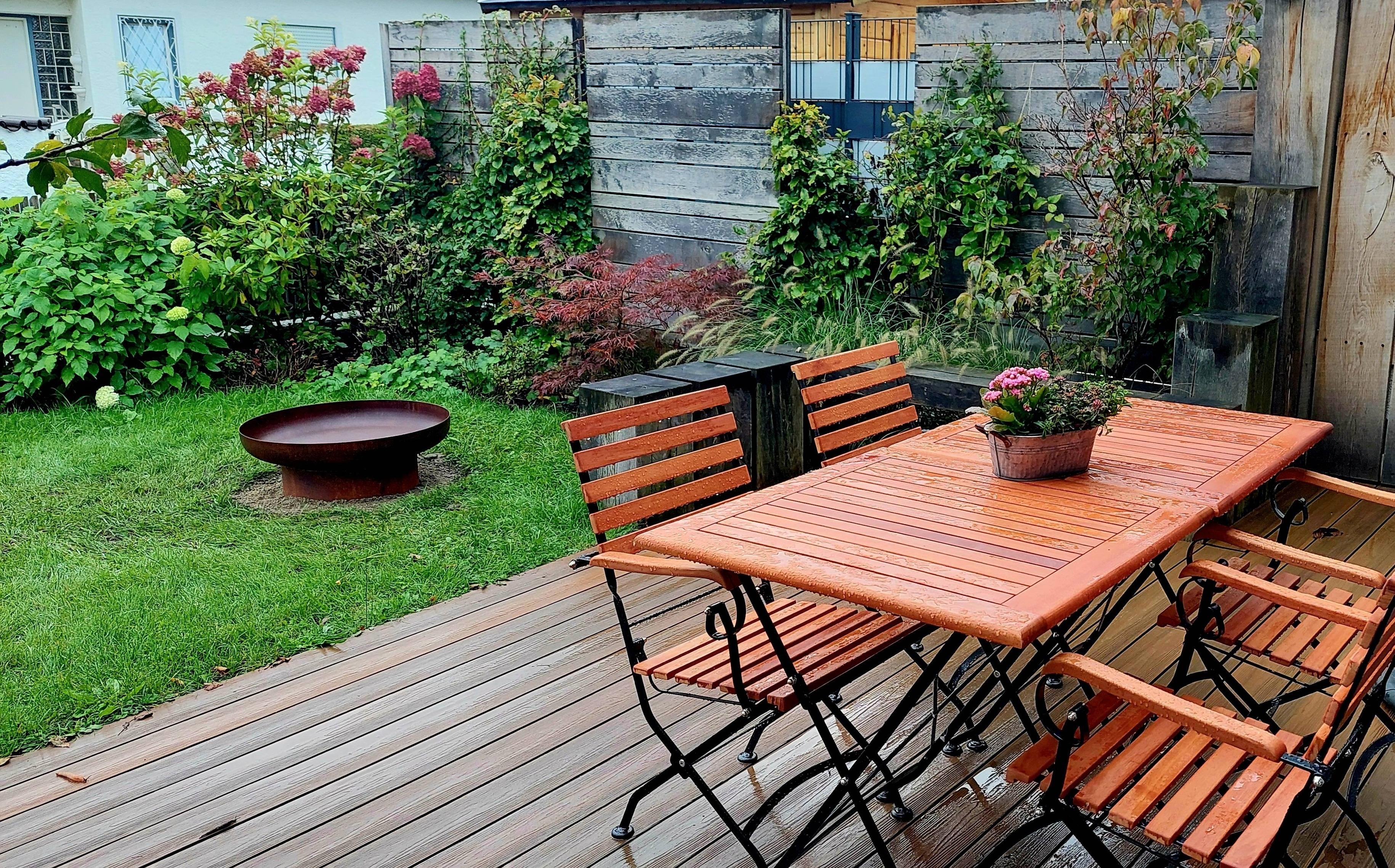 Das Haus bietet einen eigenen Garten mit Terrasse, Tisch und Stühlen sowie eine Grill- und Feuerschale für gesellige Abende.