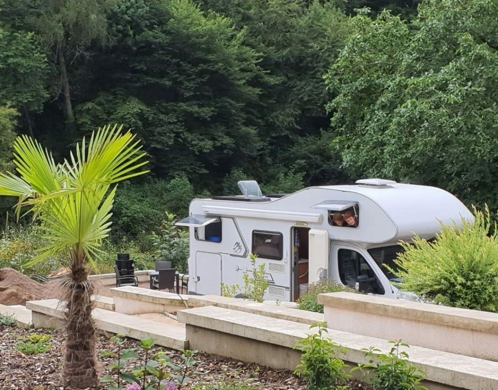 Unter dem Aspekt, das Sie sich wohl fühlen sollen, wurde auch in die Aussenanlage gestaltet. Owohl sich das Grundstück in starker Hanglage befindet, erwartet Sie ein grosszügiger Parkplatz.. Dort finden sogar Wohnmobile und Transporter Platz. Vom Parkplatz aus erreichen Sie stufenlos das Haus.