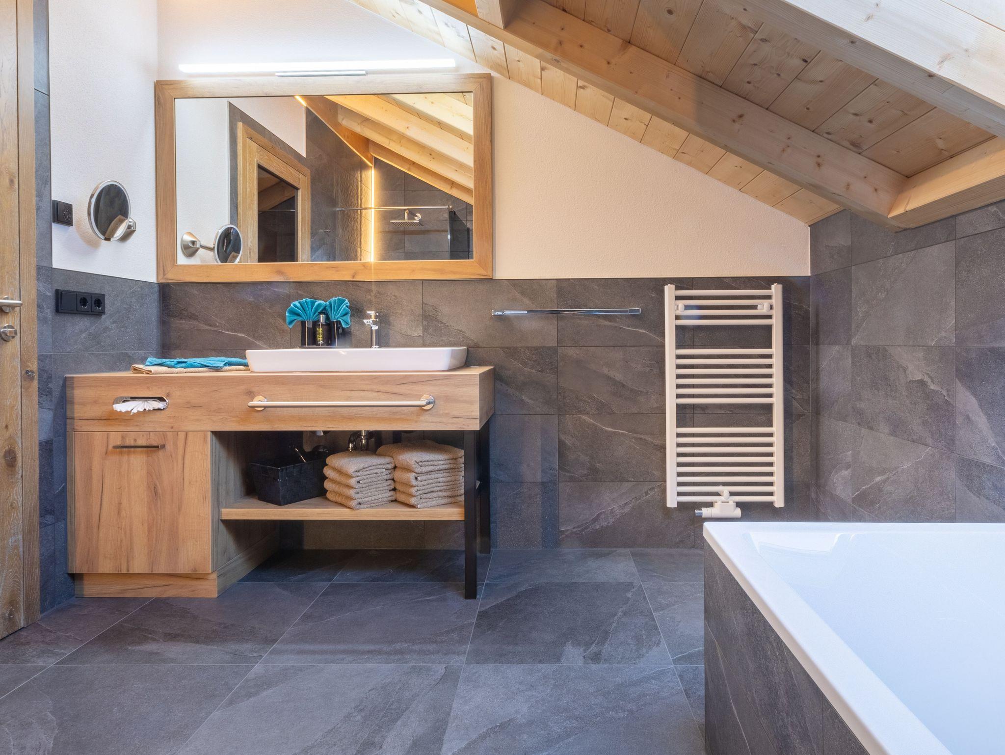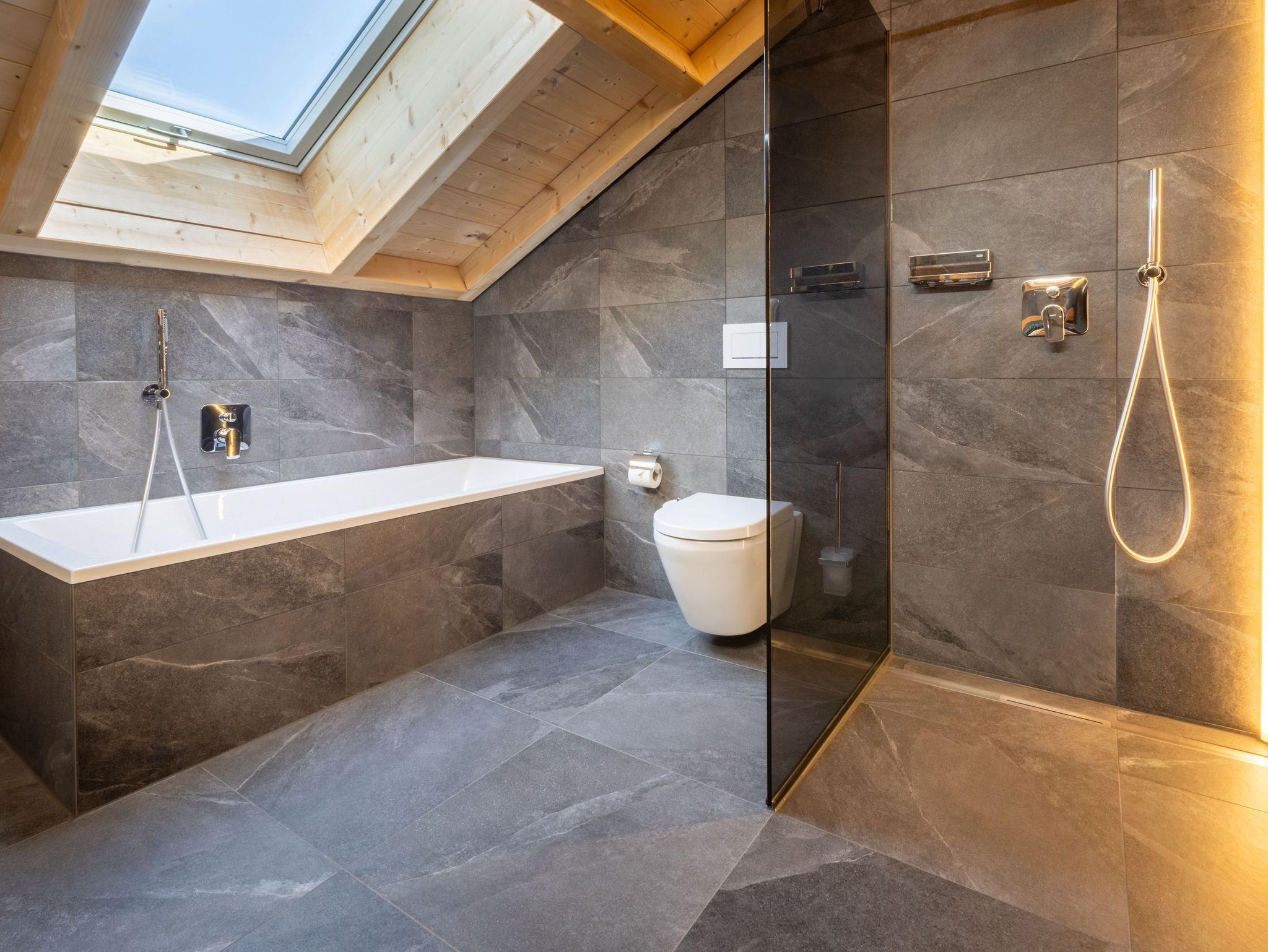 Das gemütliche Dreibettzimmer verfügt über komfortable Boxspringbetten, die für erholsame Nächte sorgen. Das Badezimmer ist luxuriös ausgestattet und bietet sowohl eine Badewanne als auch eine Regendusche sowie ein WC.