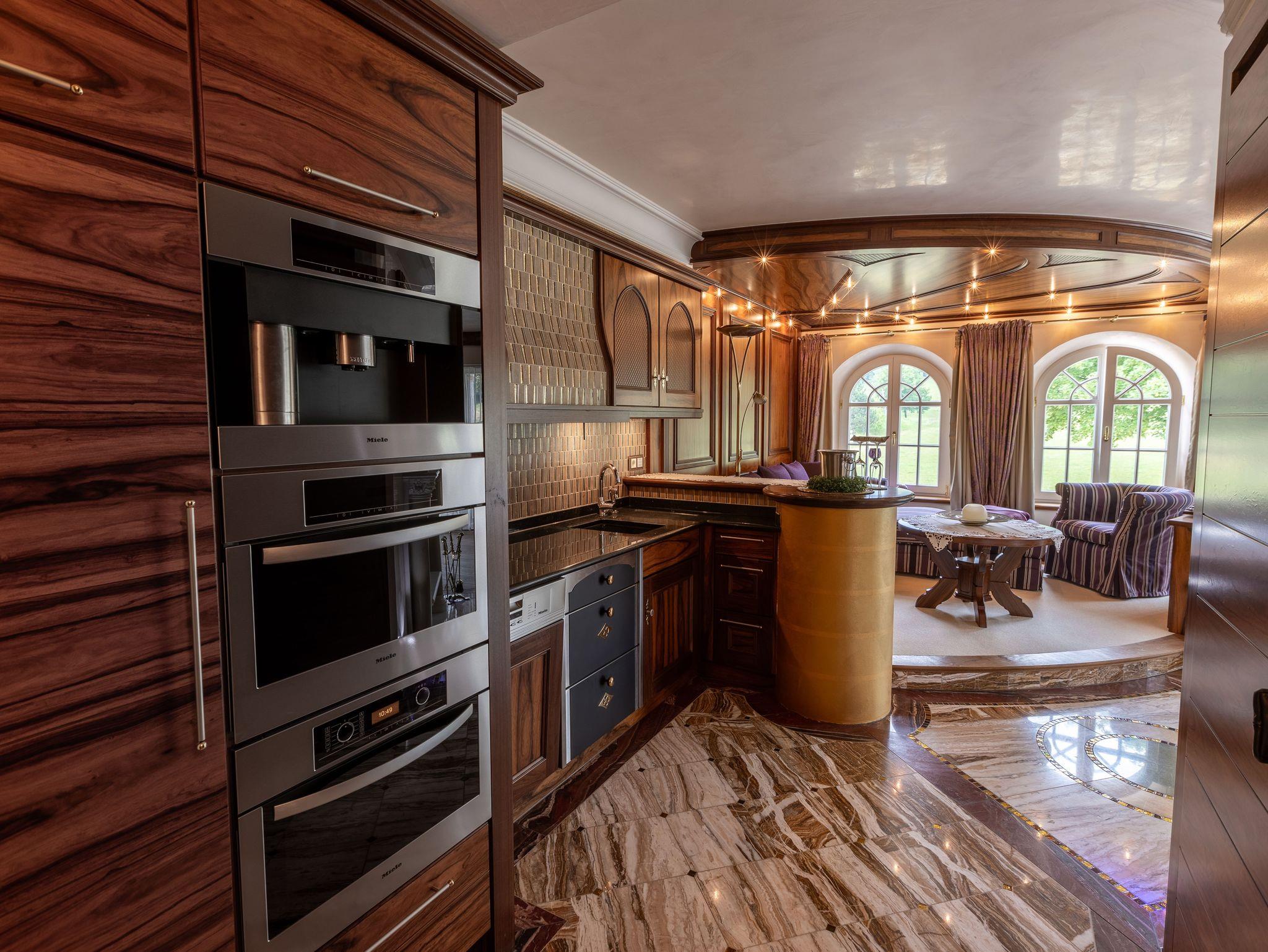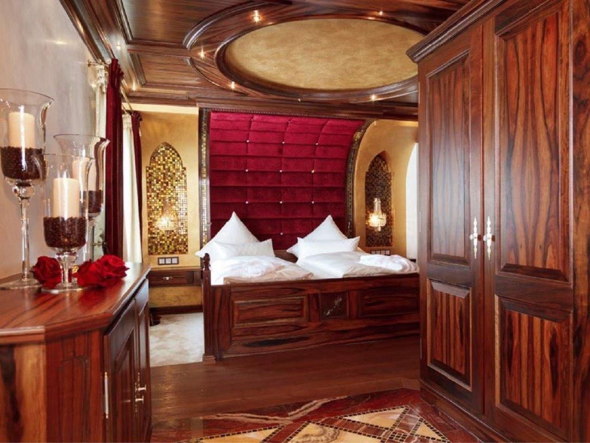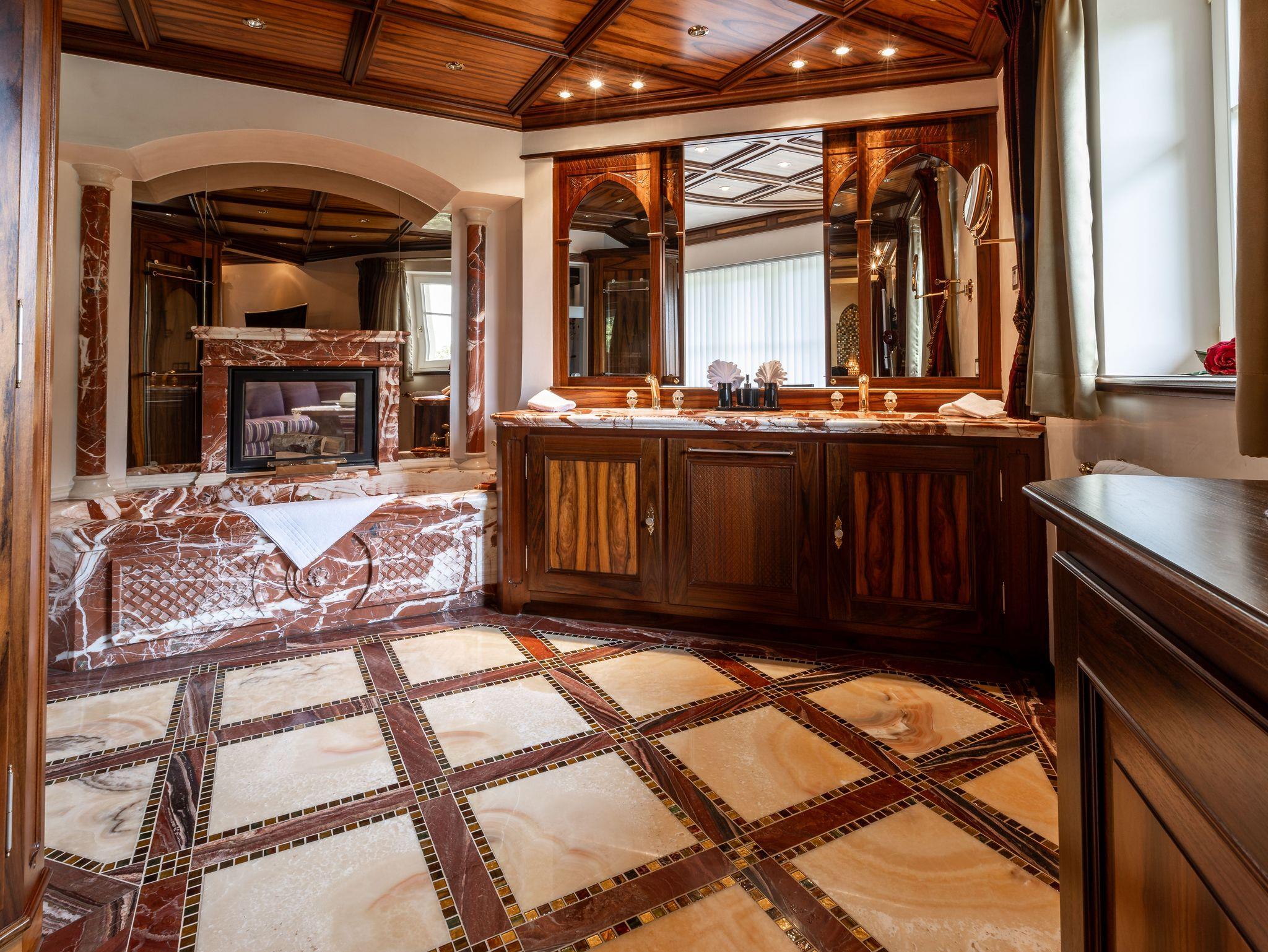 Die Einrichtung der Suite ist im klassischen König-Ludwig-Stil gehalten und verbindet traditionelle Elemente mit modernem Komfort.