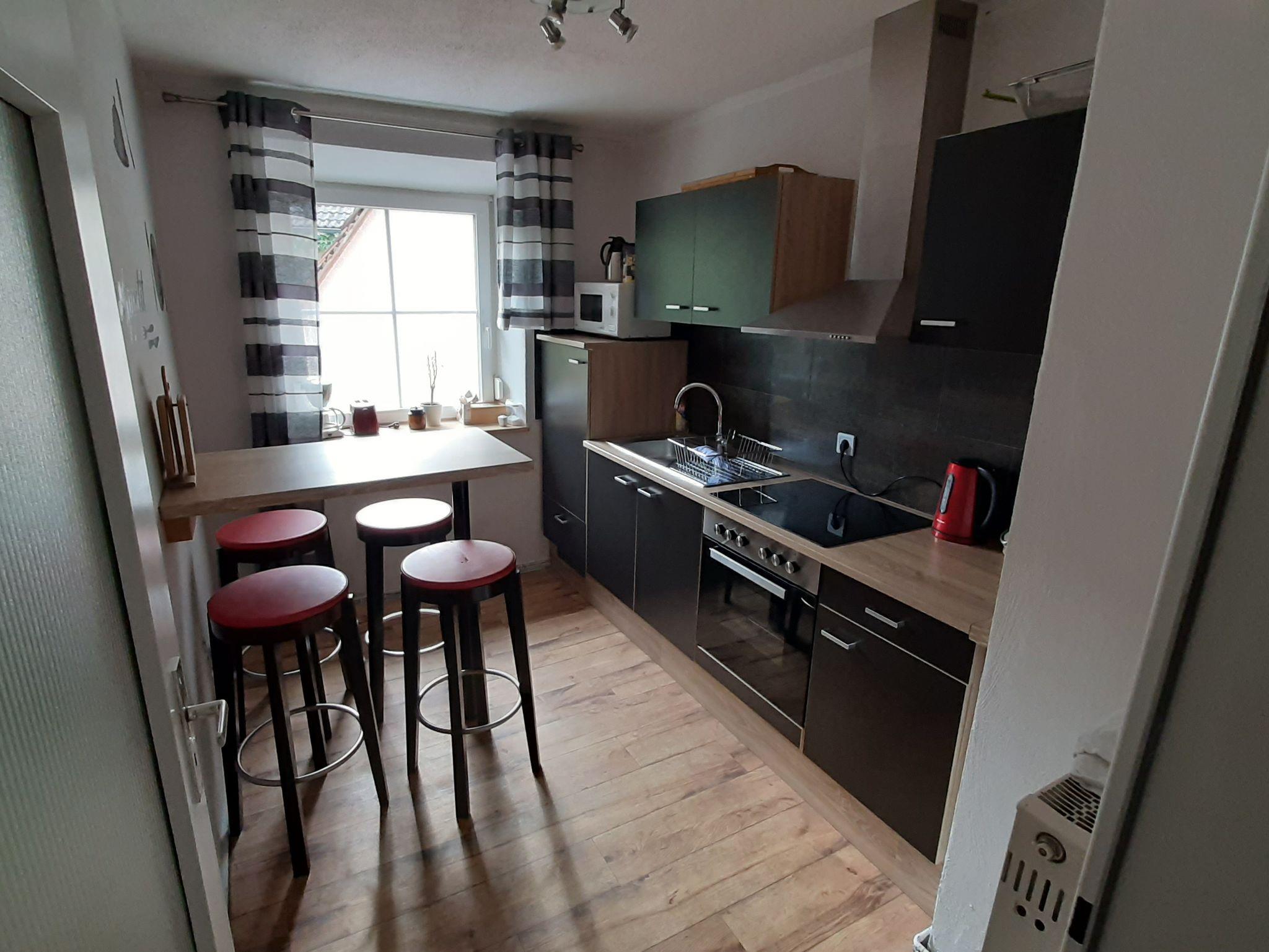 Die Küche ist komplett ausgestattet: Herd, Kühl- und Gefrierschrank, Kaffeemaschine, Kaffeepadmaschine (Kaffeepad und Tee für den ersten Morgen sind vorhanden) Wasserkocher, Toaster, Küchenutensilien wie Töpfe, Geschirr, Besteck, Gläser und Schüsseln zur optimalen Nutzung.