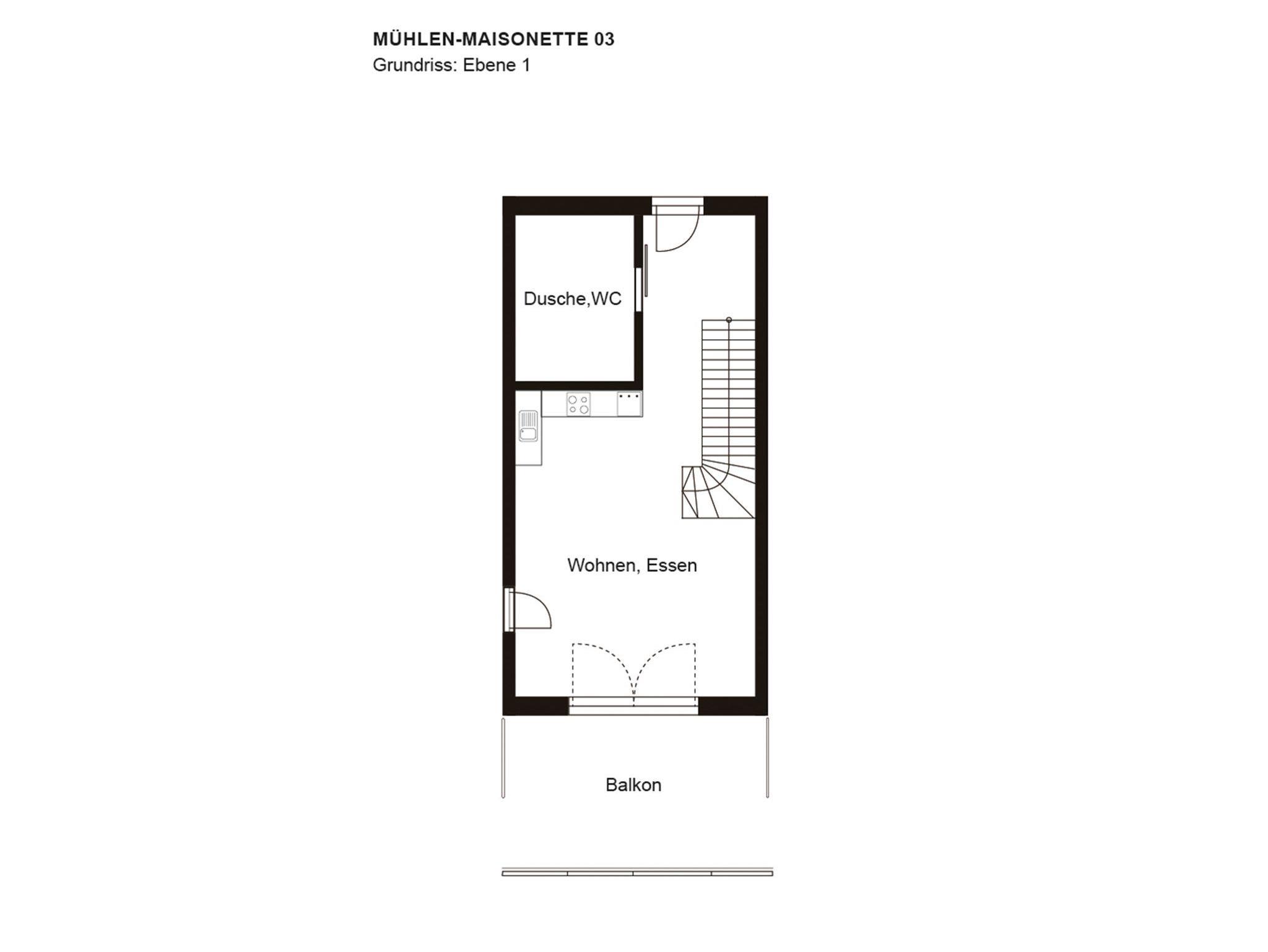 unterer Ebene: Küche mit Essplatz, Wohnzimmer, DU/WC, Balkon