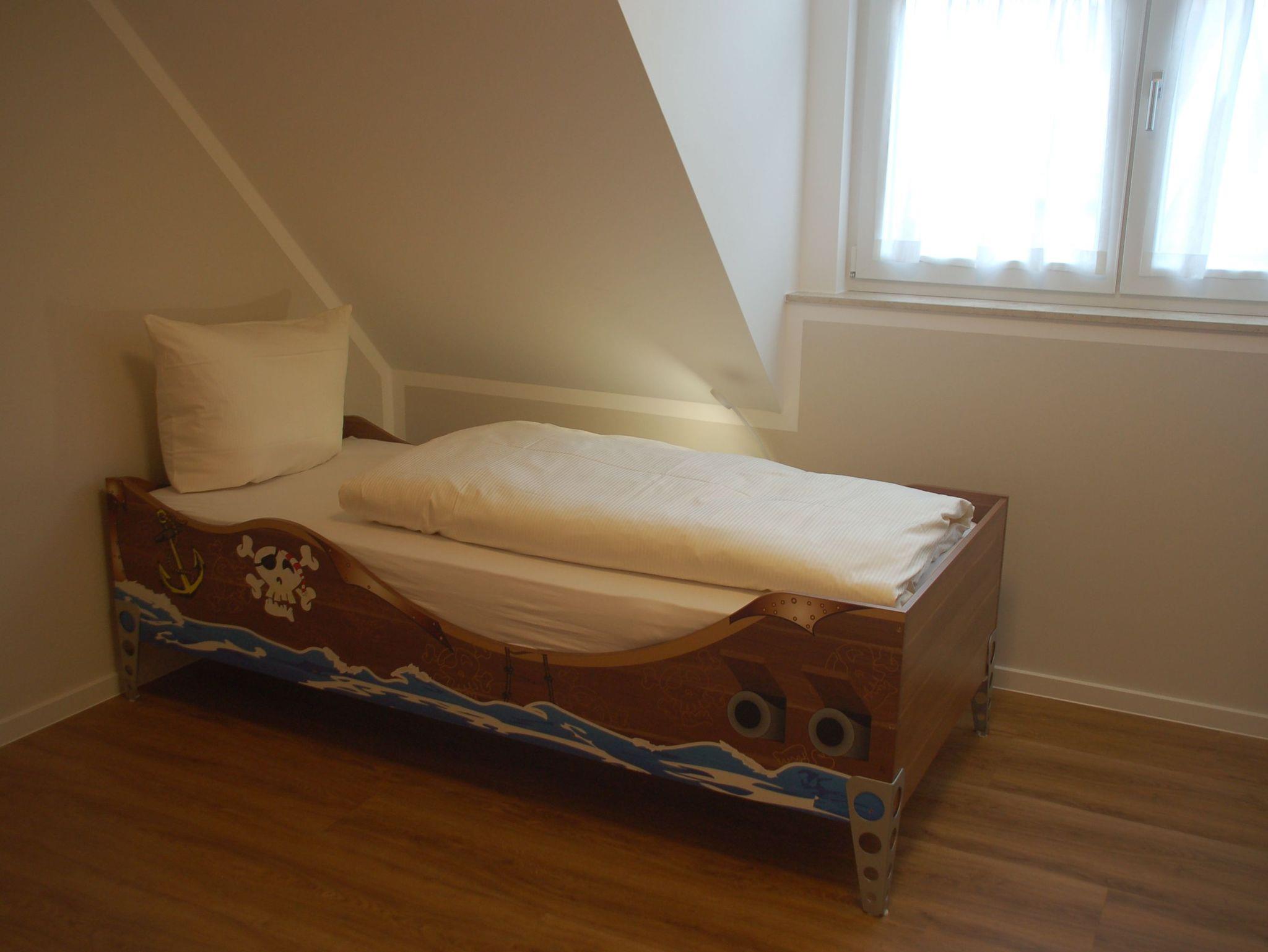 Im Kinderschlafzimmer freuen sich unsere kleinen Gäste auf ein Piratenbett (200 x 90 cm). Ein zweites Bett mit ebenfalls 200 x 90 cm komplettiert die Kinderzimmerausstattung.