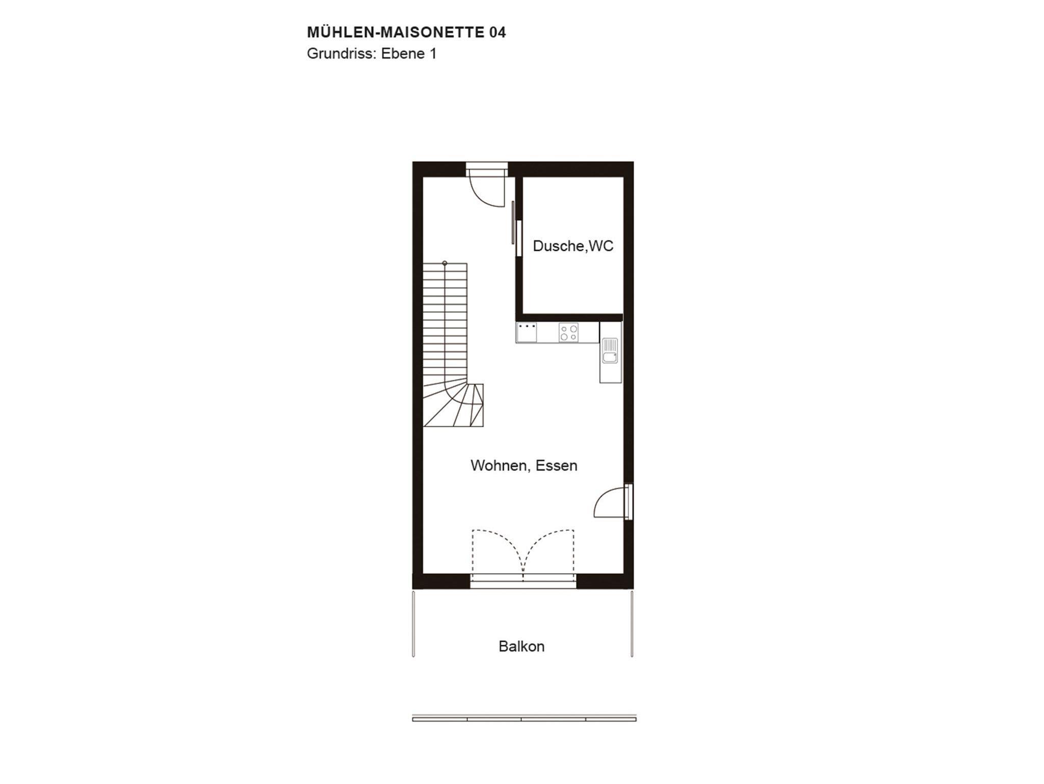 unterer Ebene: Küche mit Essplatz, Wohnzimmer, DU/WC, Balkon