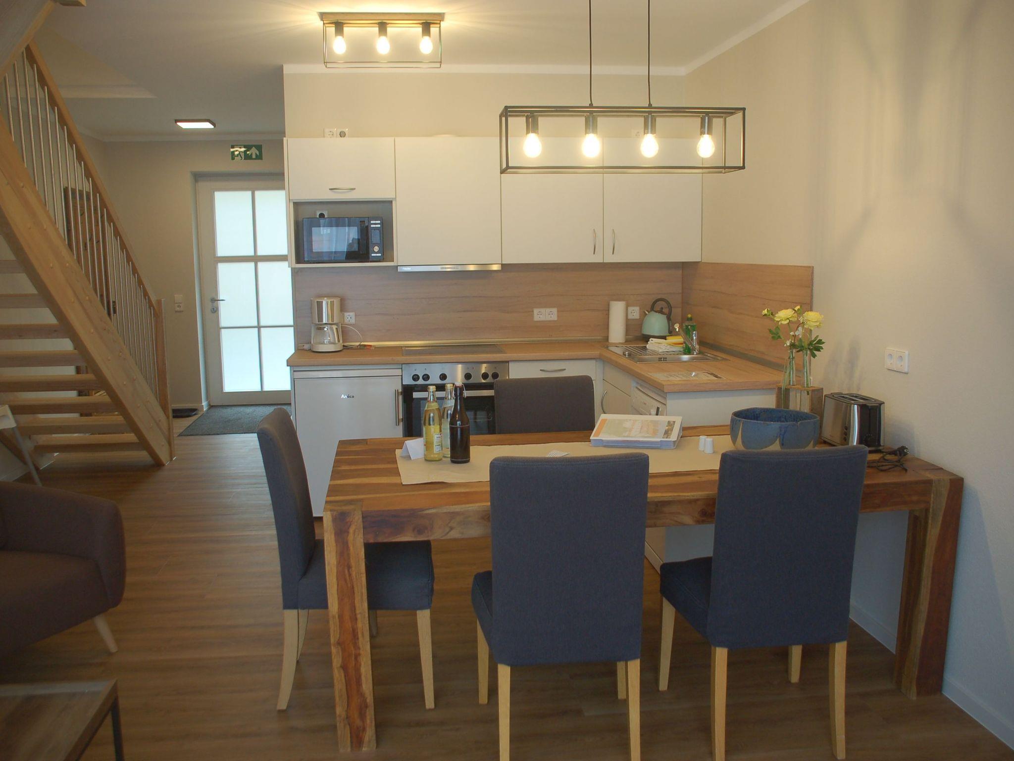 Die Maisonette Wohnungen erstrecken sich über zwei Ebenen. Im unteren Bereich befindet sich ein großzügiges Badezimmer mit schwellenloser Dusche und WC. Der große Wohn-/Essbereich ist mit einer komplett ausgestatteten Küchenzeile, einem großen Esstisch und einer gemütlichen Couch bestückt. Ein terrassenähnlicher Balkon in Süd-/West-Ausrichtung rundet die hervorragende Ausstattung ab und lädt sowohl zum Sonne genießen als auch zum Essen im Freien ein. Über eine bequem begehbare Holztreppe aus heimischem Ahorn erreichen unsere Gäste die im oberen Bereich gelegenen zwei Schlafzimmer sowie das separate WC.