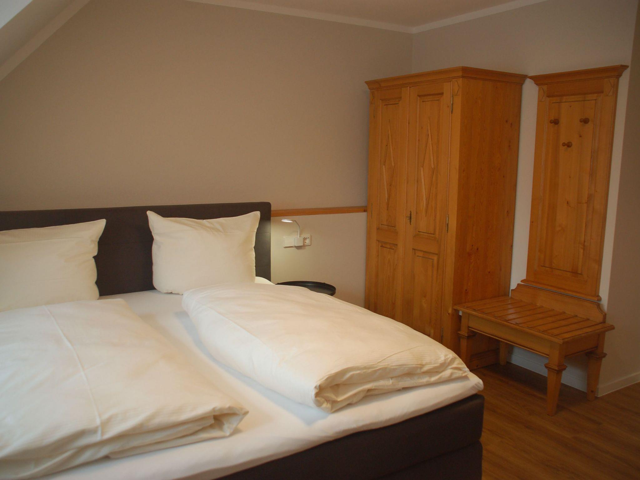 Die Mühlen-Maisonette Wohnung 4 kann über eine Verbindungstür mit der Mühlen-Maisonette Wohnung 3 verbunden werden. Im Elternschlafzimmer erwartet unsere Gäste eine 180 cm breites Boxspringbett sowie ein 140 cm langes Kinder-Gitterbett.