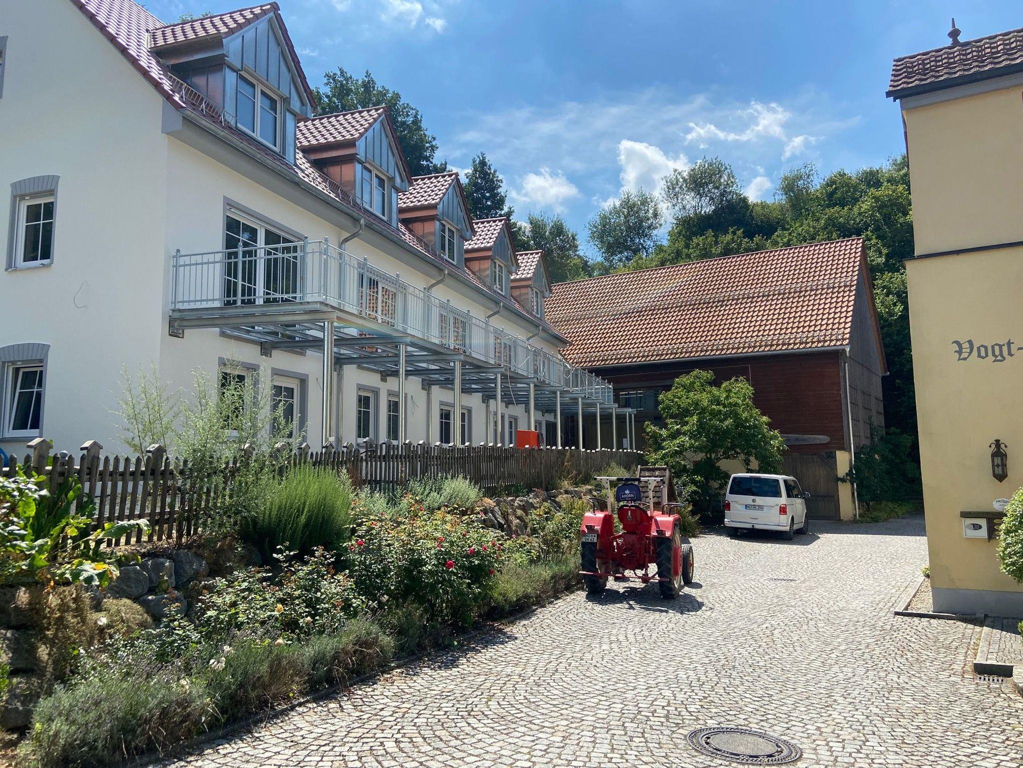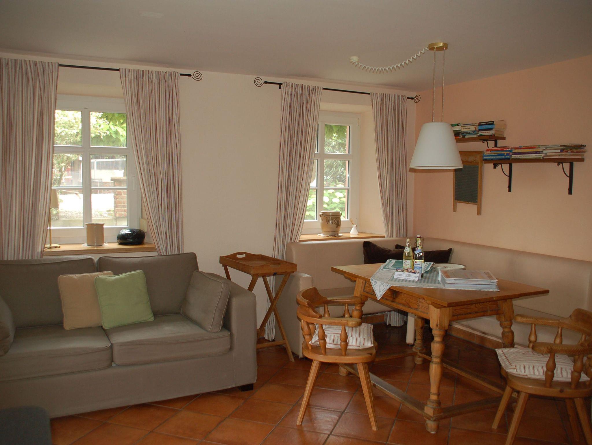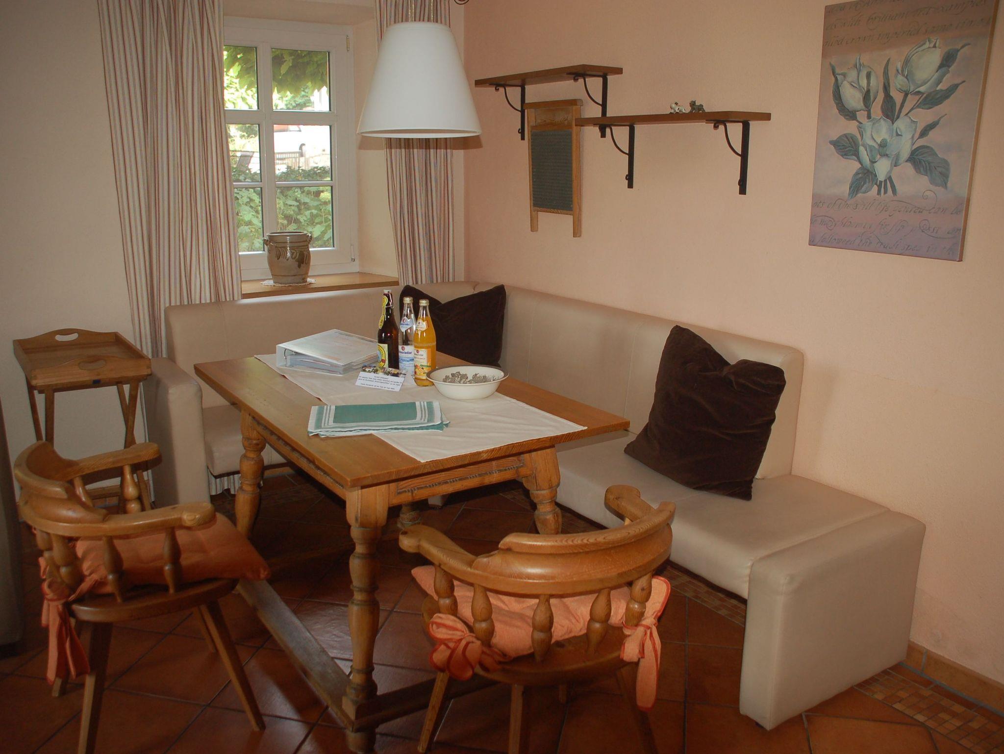 Die im ehemaligen Wohnhaus der Müller gelegene Erdgeschosswohnung verfügt über eine sehr große, zum Teil überdachte Terrasse. Von dieser haben unsere Gäste einen direkten Ausblick auf die durchfließende Biber und den Streichelzoo. Die Süd-West-Ausrichtung der Terrasse gibt die Gelegenheit Sonnenstunden entspannt zu genießen. Im Wohn-/Essbereich verfügt die Wohnung Mühlengarten über eine funktionale und sehr gut ausgestattete Küche mit allen nötigen Elektrogeräten. Auf Wunsch können die Gäste im Mühlenbüro Raclette, Fondue oder Sandwichmaker ausleihen.