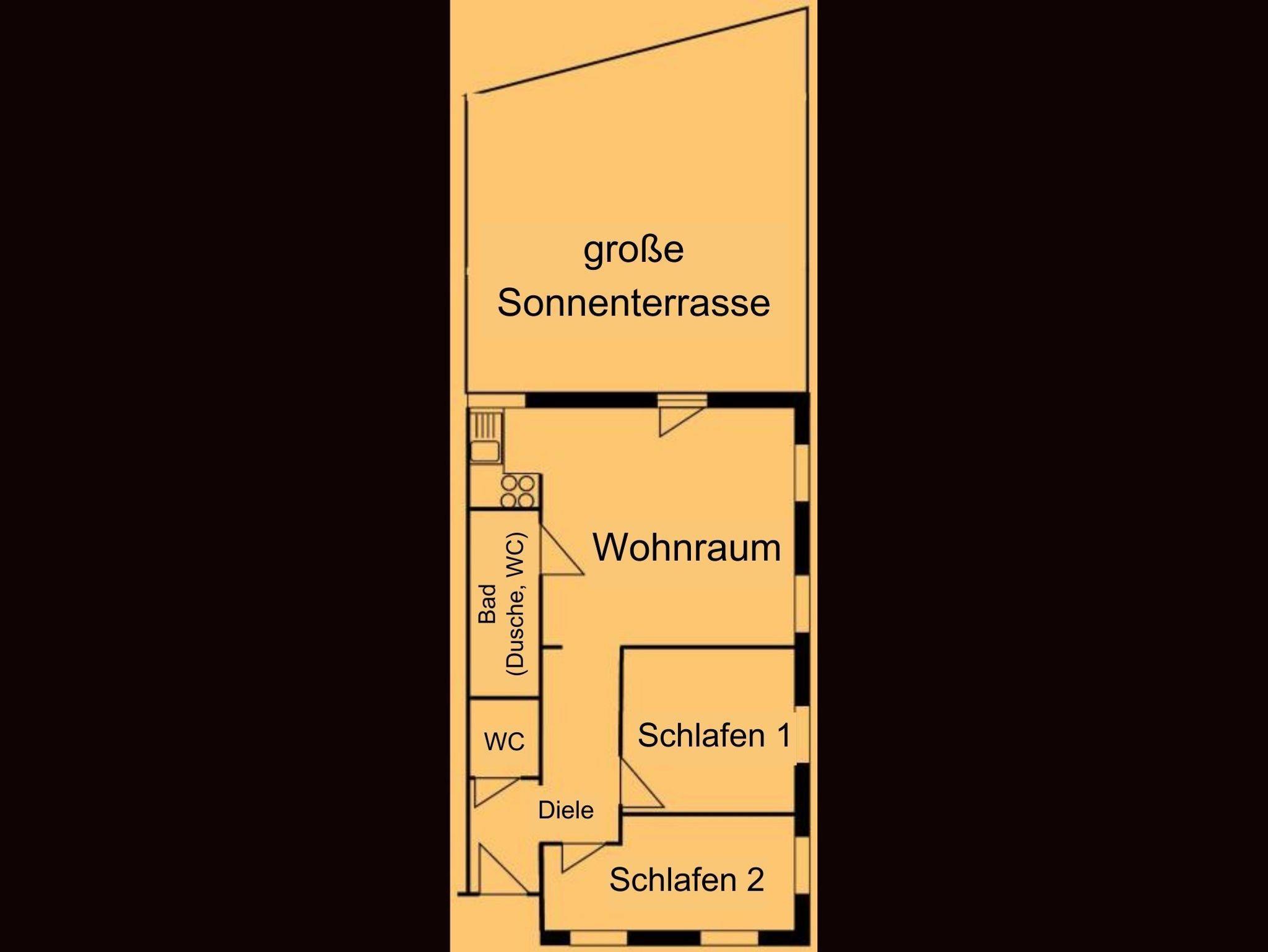 1 Schlafzimmer, 1 Kinderschlafzimmer, Küchenecke mit Essplatz, Wohnzimmer mit Couch, Bad mit Dusche/WC, separates WC, Windfang mit Garderobe, Sonnenterrasse oder Balkon, Kfz-Stellplatz