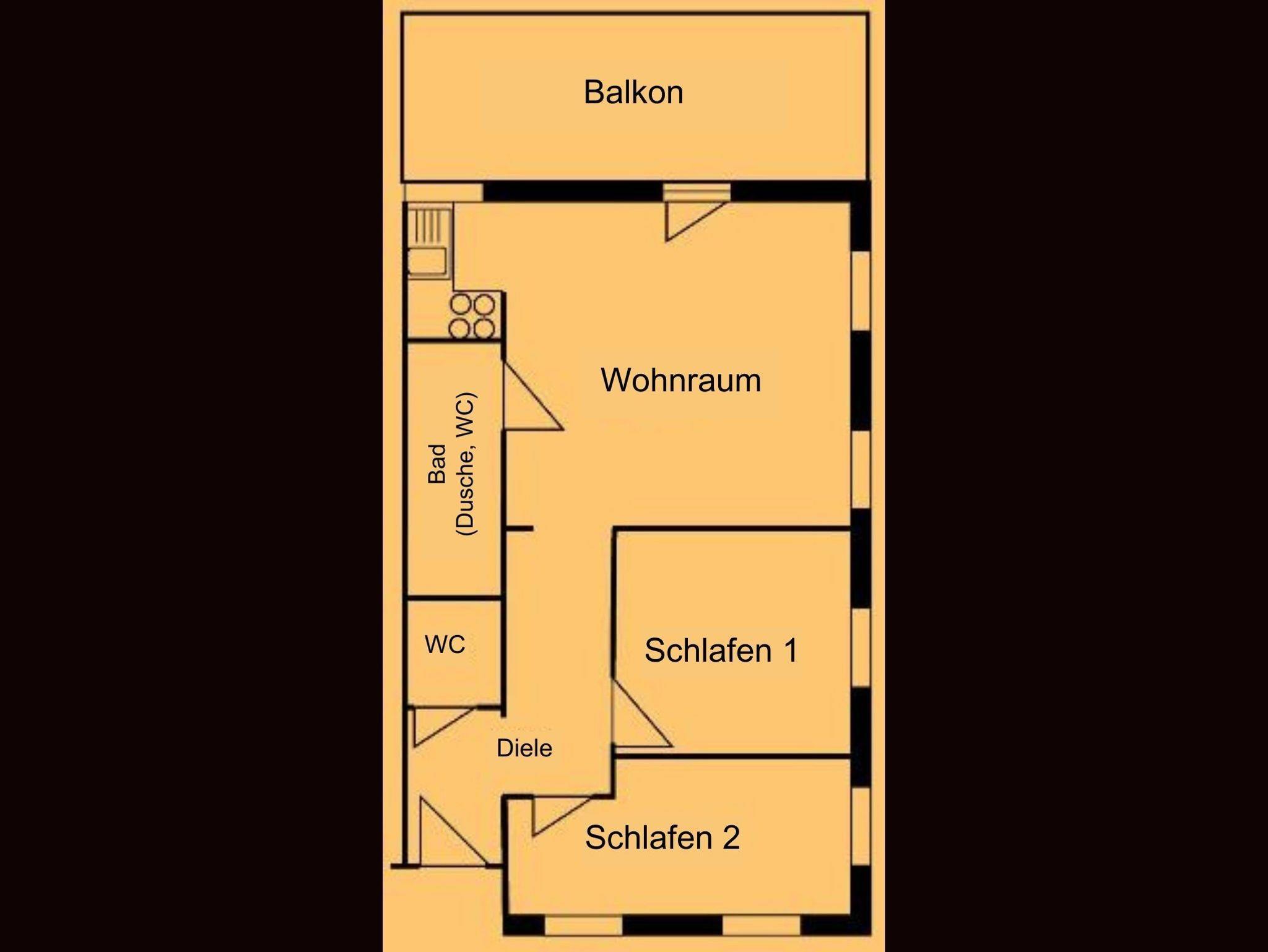 1 Schlafzimmer, 1 Kinderschlafzimmer, Küchenecke mit Essplatz, Wohnzimmer mit Couch, Bad mit Dusche/WC, separates WC, Windfang mit Garderobe, Sonnenterrasse oder Balkon, Kfz-Stellplatz