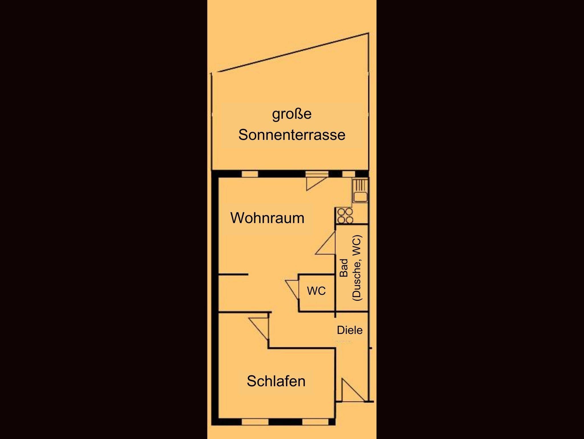 1 Schlafzimmer mit Zustellbett für 1 Kind, Küchenecke mit Essplatz, Wohnzimmer mit Schlafcouch, Bad mit Dusche/WC, separates WC, Windfang mit Garderobe, Balkon oder Terrasse zum Bach, Kfz-Stellplatz