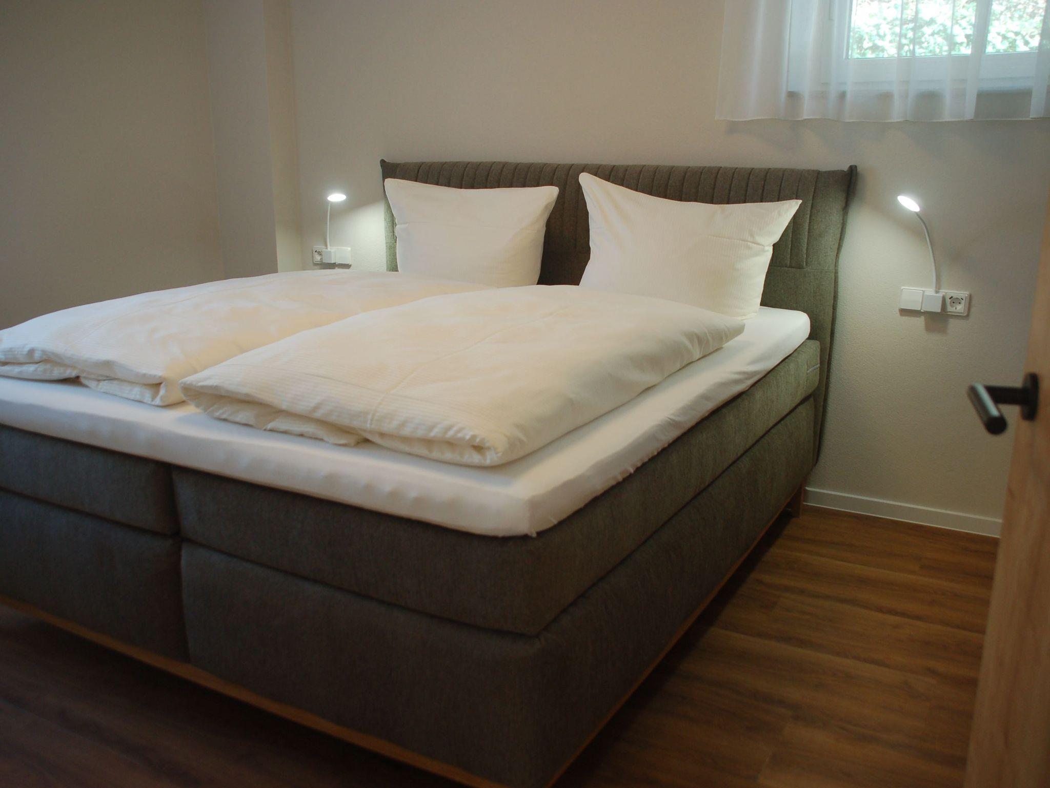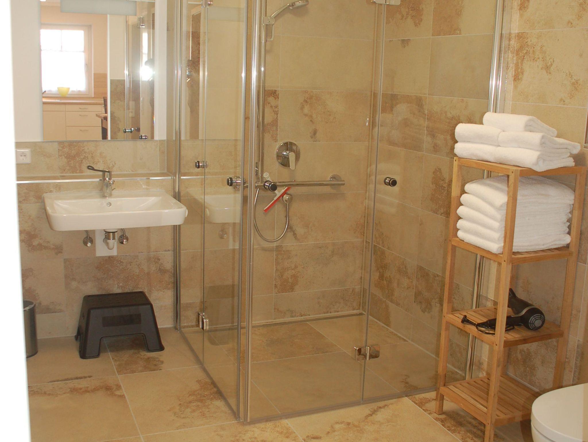 Der große Wohn-/Essbereich ist mit einer komplett ausgestatteten Küchenzeile, einem großen Esstisch und einer gemütlichen Couch bestückt. Das großzügige Badezimmer bietet eine mit dem Rollstuhl befahrbare Dusche sowie einen unterfahrbaren Waschtisch und ein WC. Direkt neben dem Badezimmer befindet sich eine weitere separate Toilette. Im Elternschlafzimmer erwartet unsere Gäste ein 180 cm breites Boxspringbett. Das Kinderschlafzimmer ist mit einem Etagenbett (2 x 200 x 90 cm) sowie einem weiteren Einzelbett (200 x 90 cm) ausgestattet.