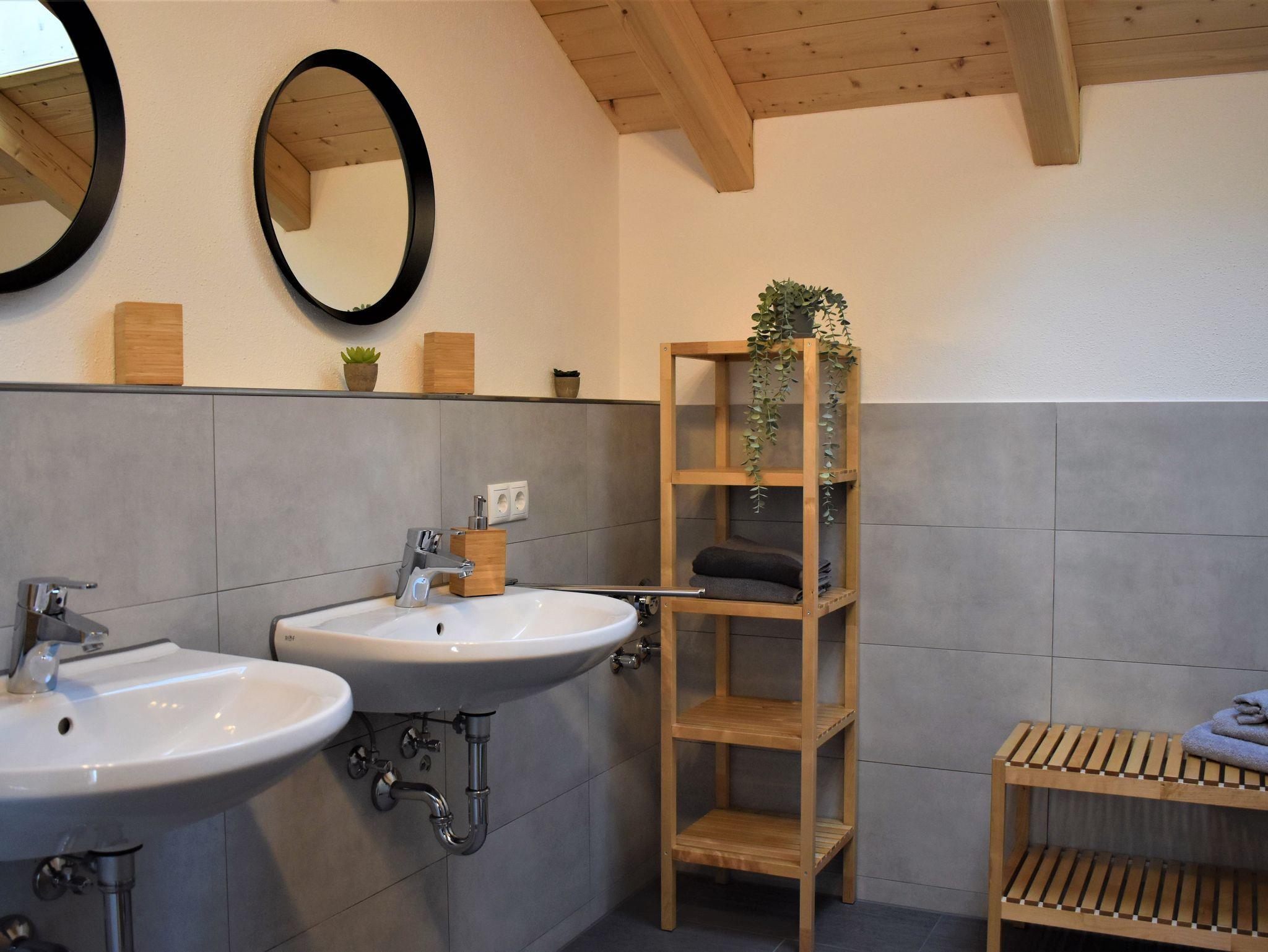 Im großzügigen Bad befinden sich neben der Dusche mit niedrigem Einstieg auch 2 Waschbecken.