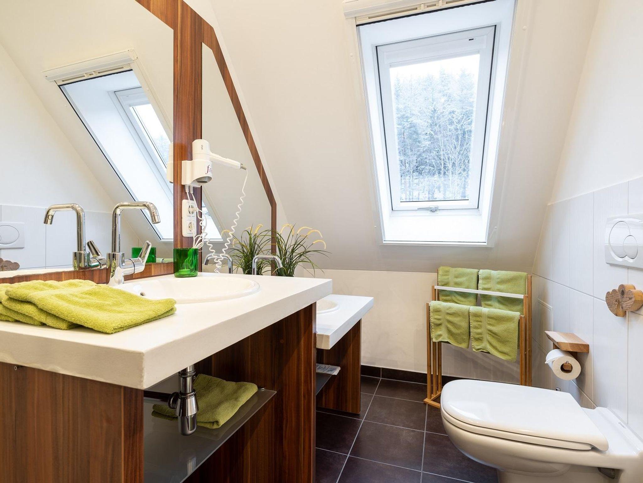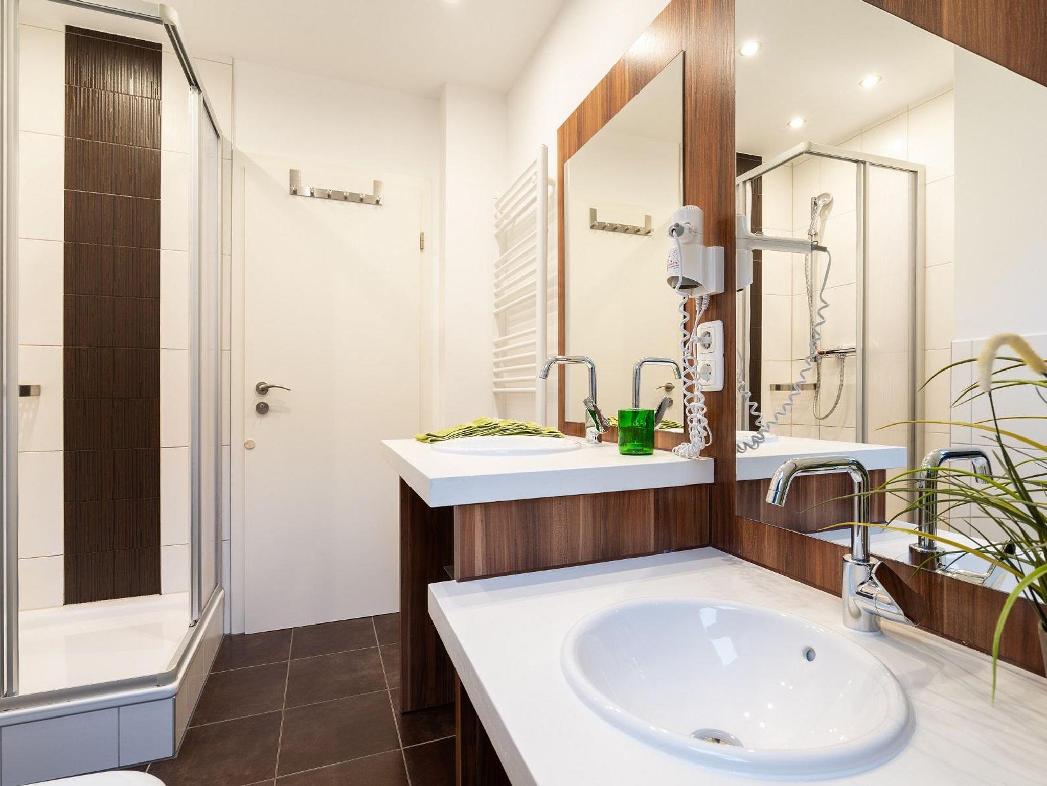 Das Bad hat ein Kinder- und Elternwaschbecken, Dusche, Fön und Tageslicht.