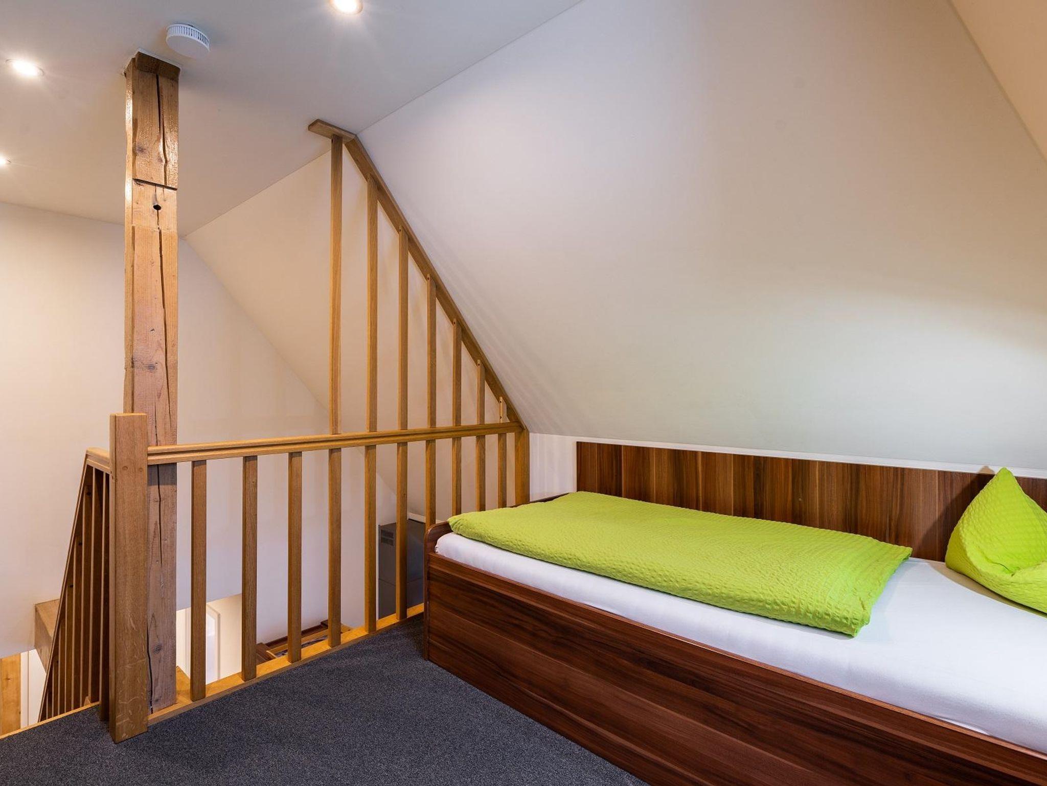 Eine großzügig, helle Ferienwohnung im 2. Stock des Hauses mit 1 separaten Schlafzimmer und einer Schlafgalerie, bietet Platz für 1 - 4 Personen und hat eine Größe von 65m². Der Charme dieser Wohnung stellt das sichtbare Fachwerk und die Galerie zum Schlafen mit der Wohlfühlatmosphäre eines gemütlichen Dachgeschosses dar. Besonderer Wert wurde auf die Sicherheit unserer Kleinsten gelegt und die Treppe mit Schutzgittern versehen. Nichtraucherwohnung, sowie Tierhaarallergie geeignet.