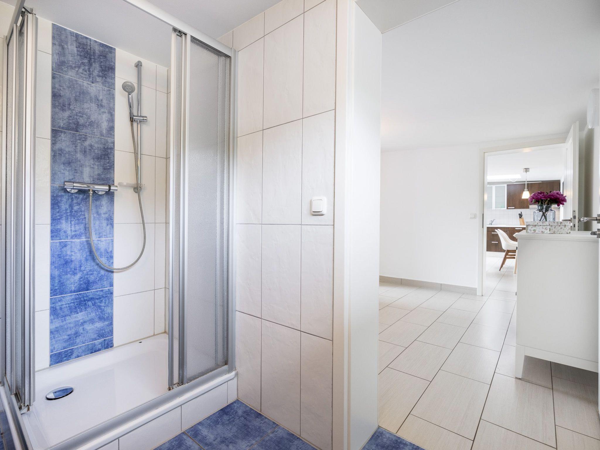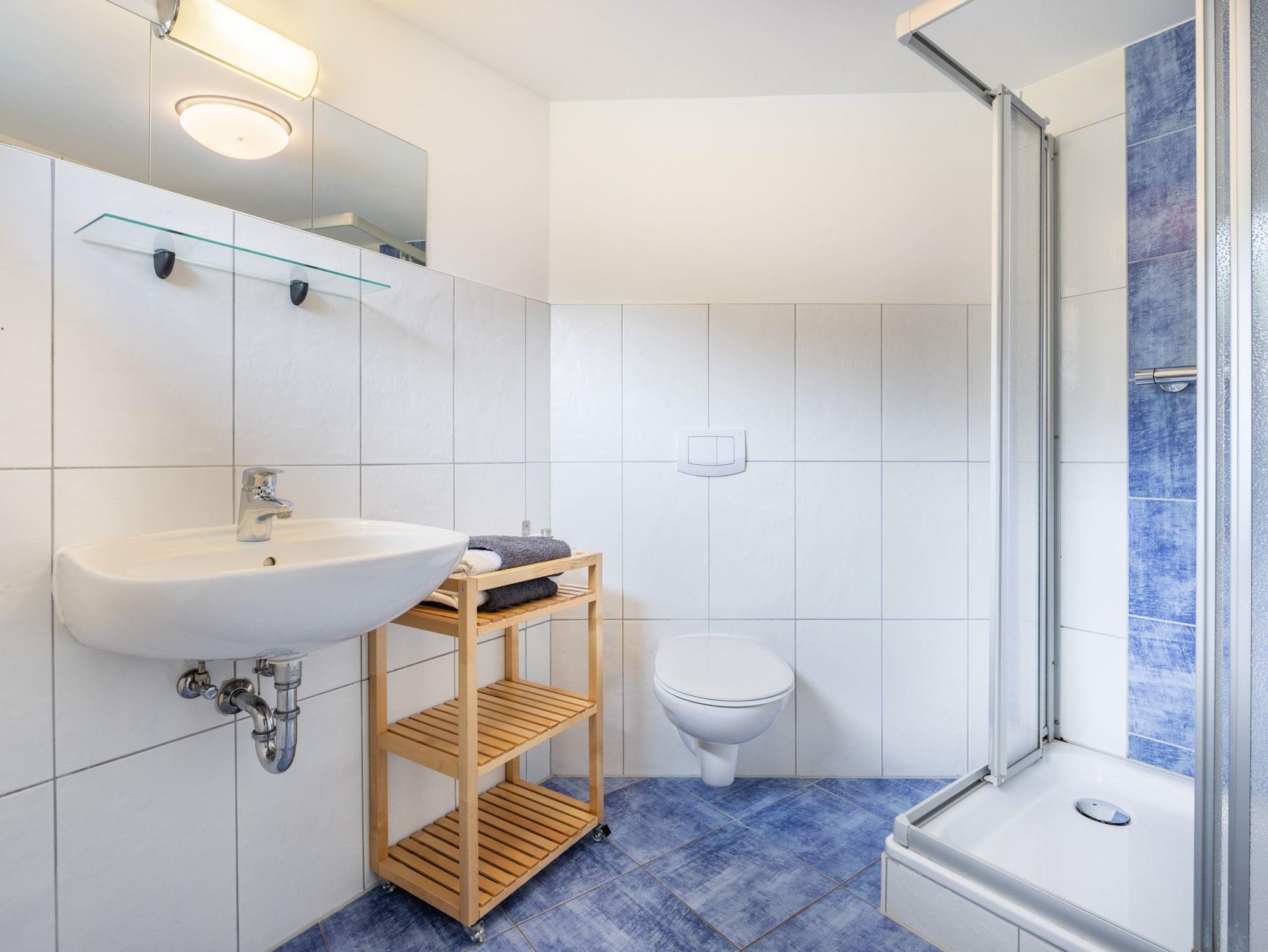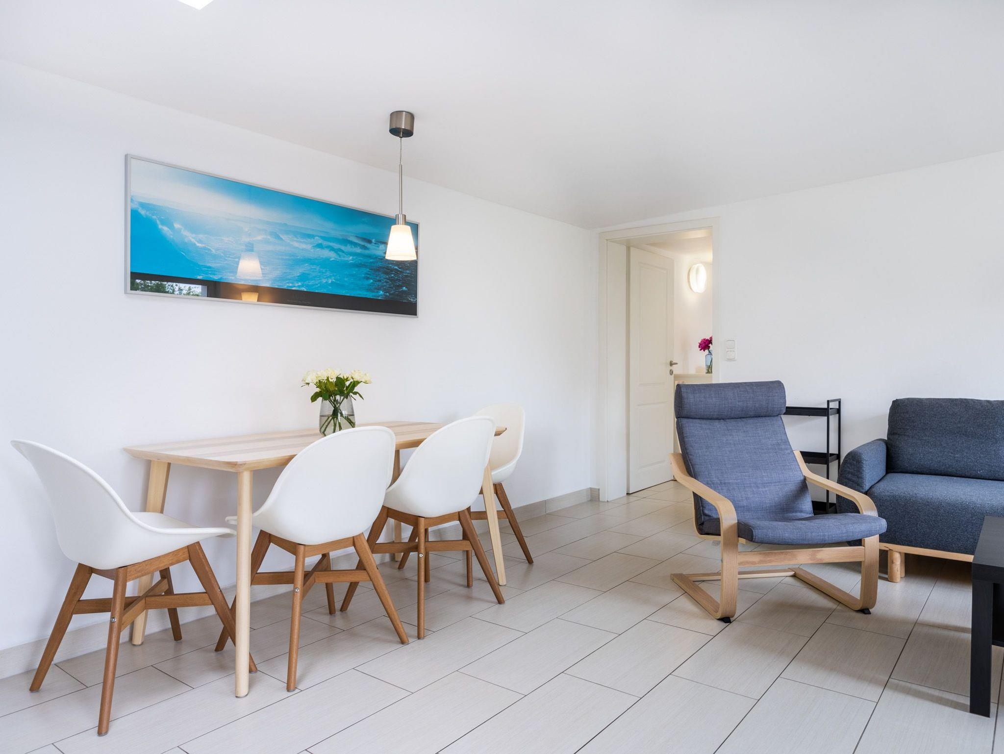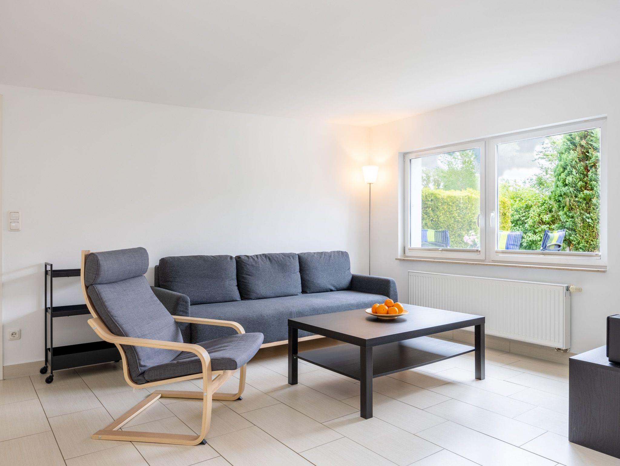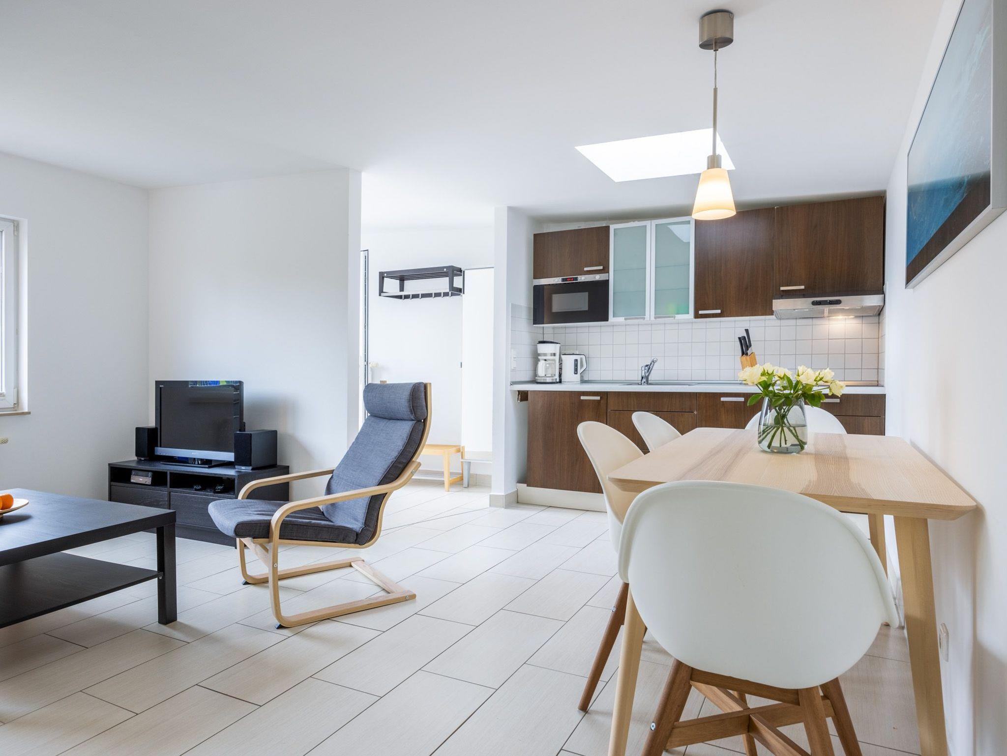 Wohnzimmer mit Sofaecke (Schlafsofa) und TV. Offene Küche mit 4- Platten Herd, Geschirrspüler, Kaffeemaschine, Wasserkocher und Toaster, Esstisch. Schlafzimmer mit Doppelbett und Kommode, Bad mit Dusche und WC.