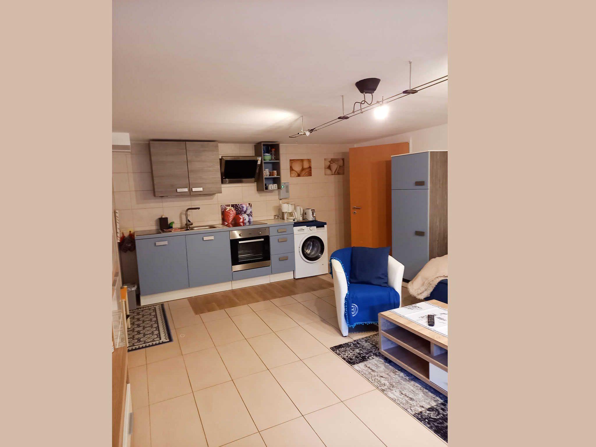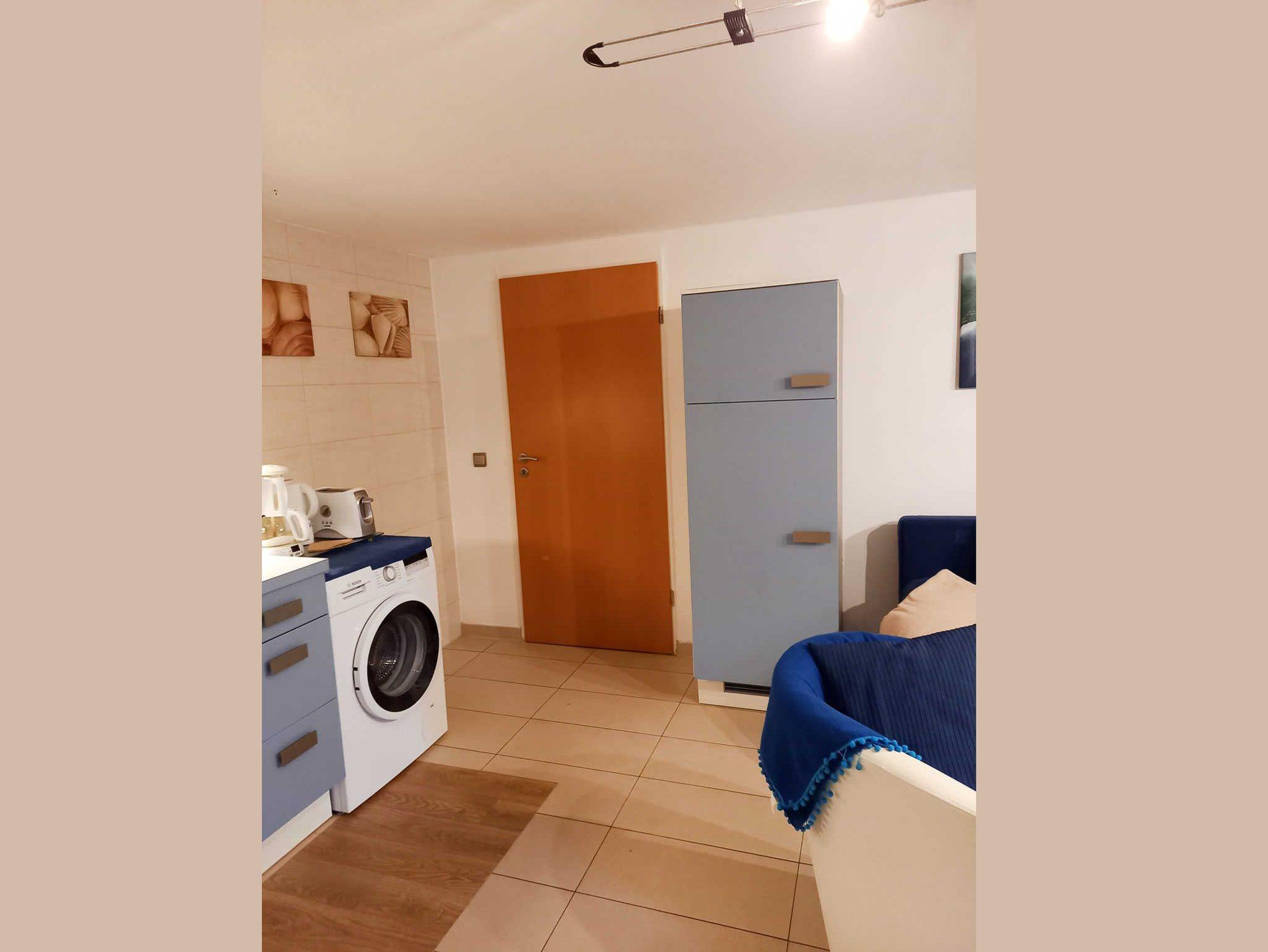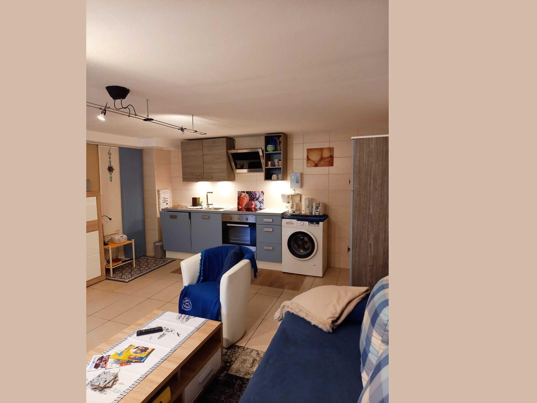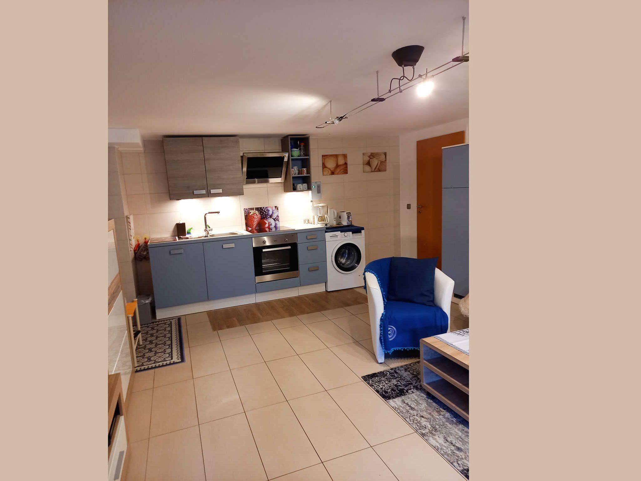 In der Ferienwohnung 2 im Souterrain gibt es ein Schlafzimmer mit getrennt stehenden Betten sowie eine Küchenzeile mit Geschirrspülmaschine und Münzwaschmaschine im Wohnbereich integriert.