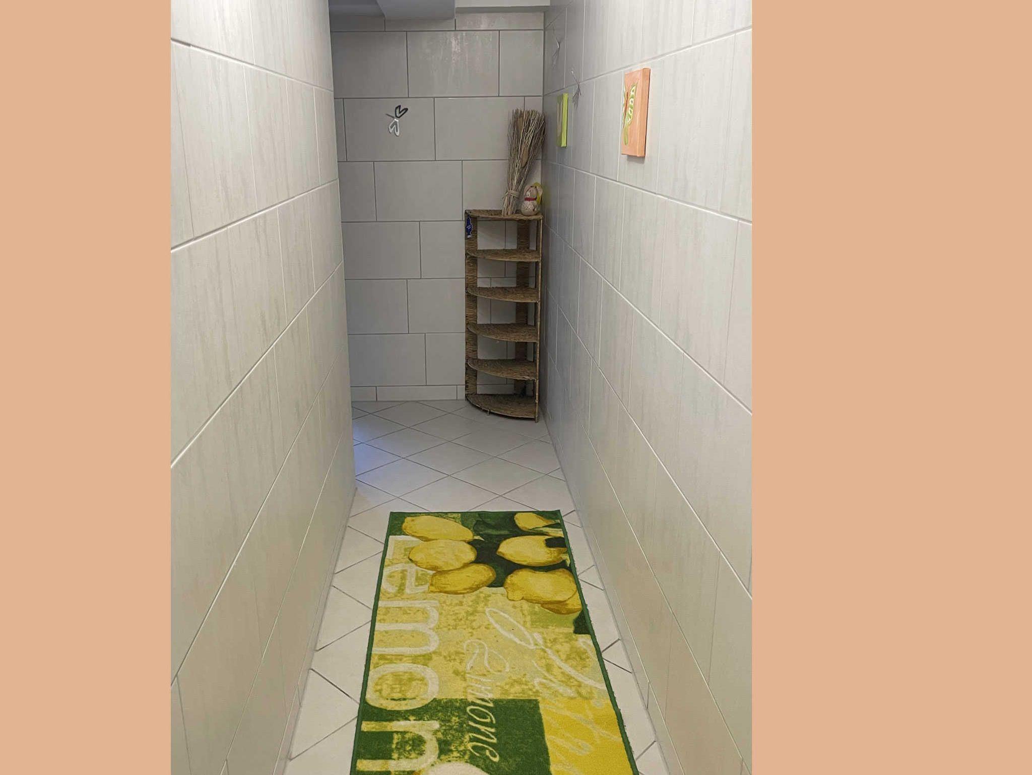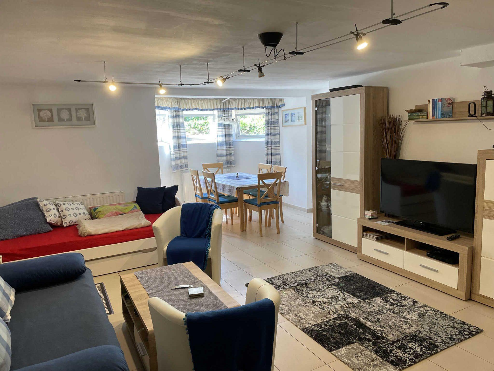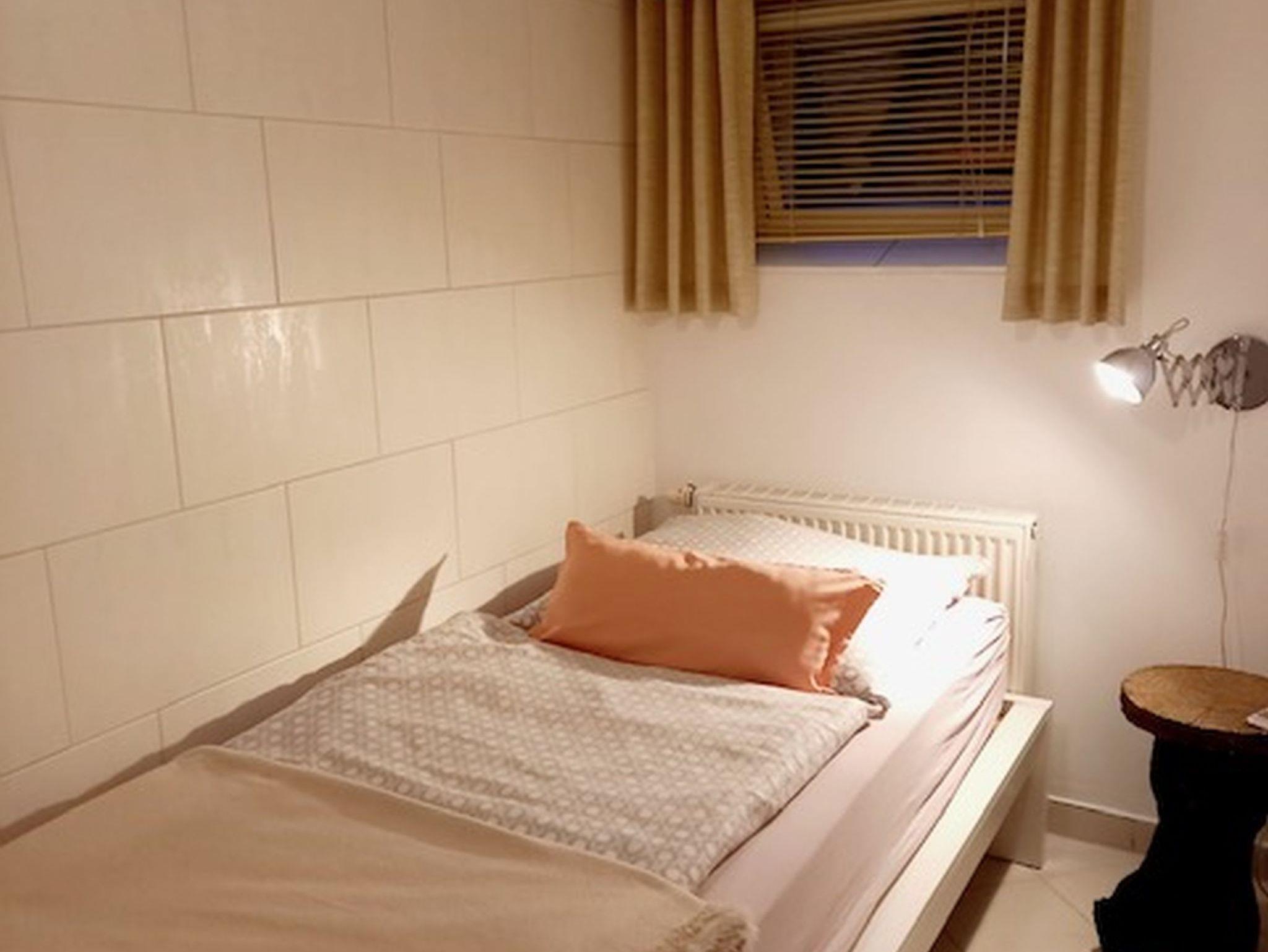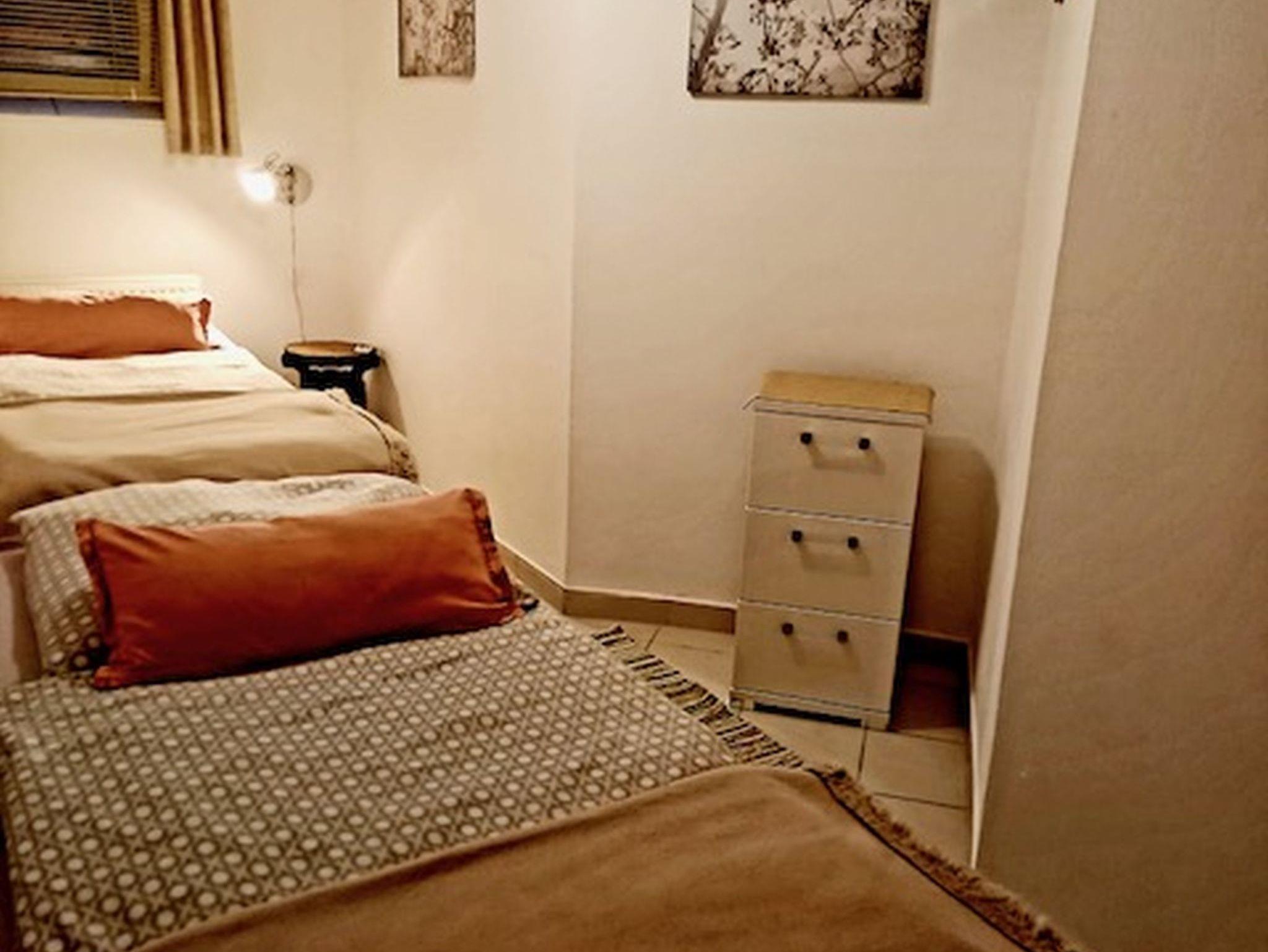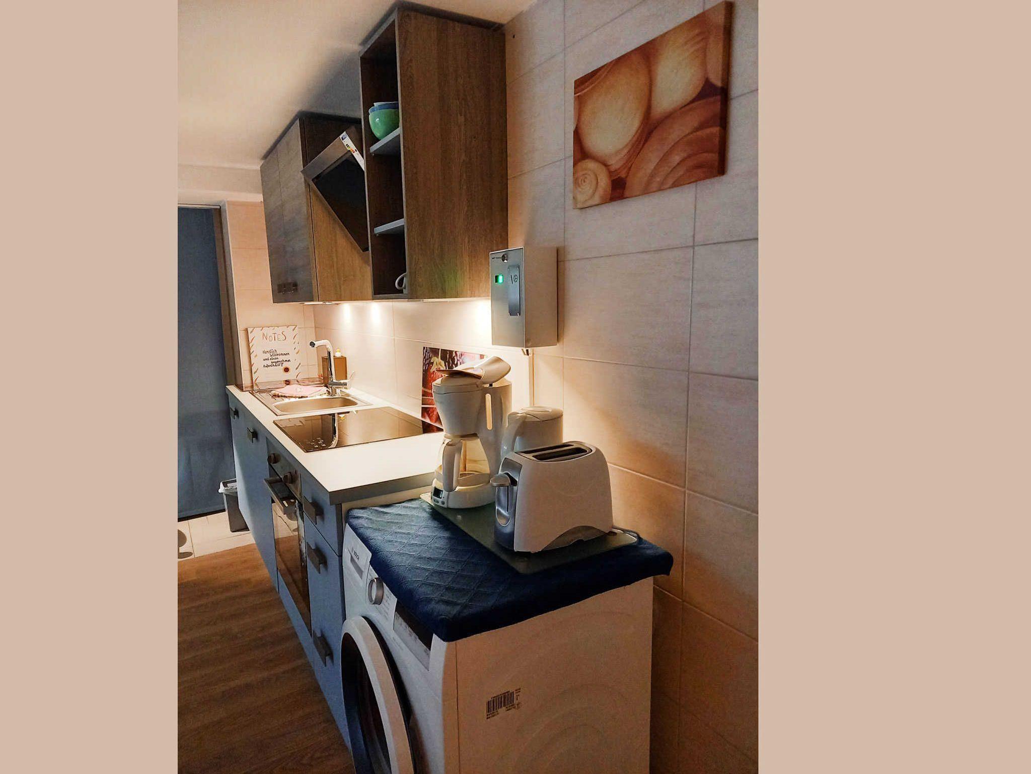 In der Ferienwohnung 2 im Souterrain gibt es ein Schlafzimmer mit getrennt stehenden Betten sowie eine Küchenzeile mit Geschirrspülmaschine und Münzwaschmaschine im Wohnbereich integriert.