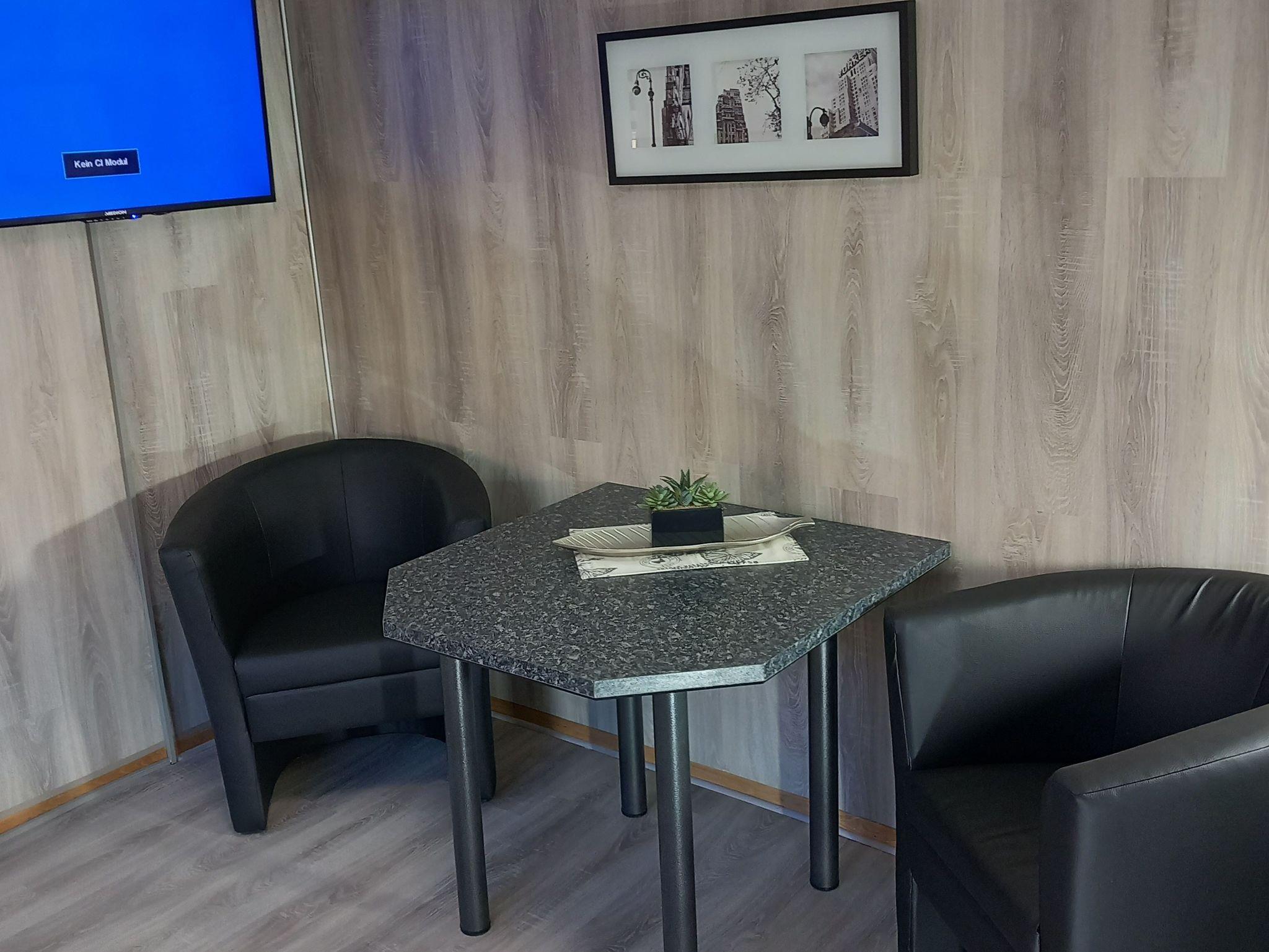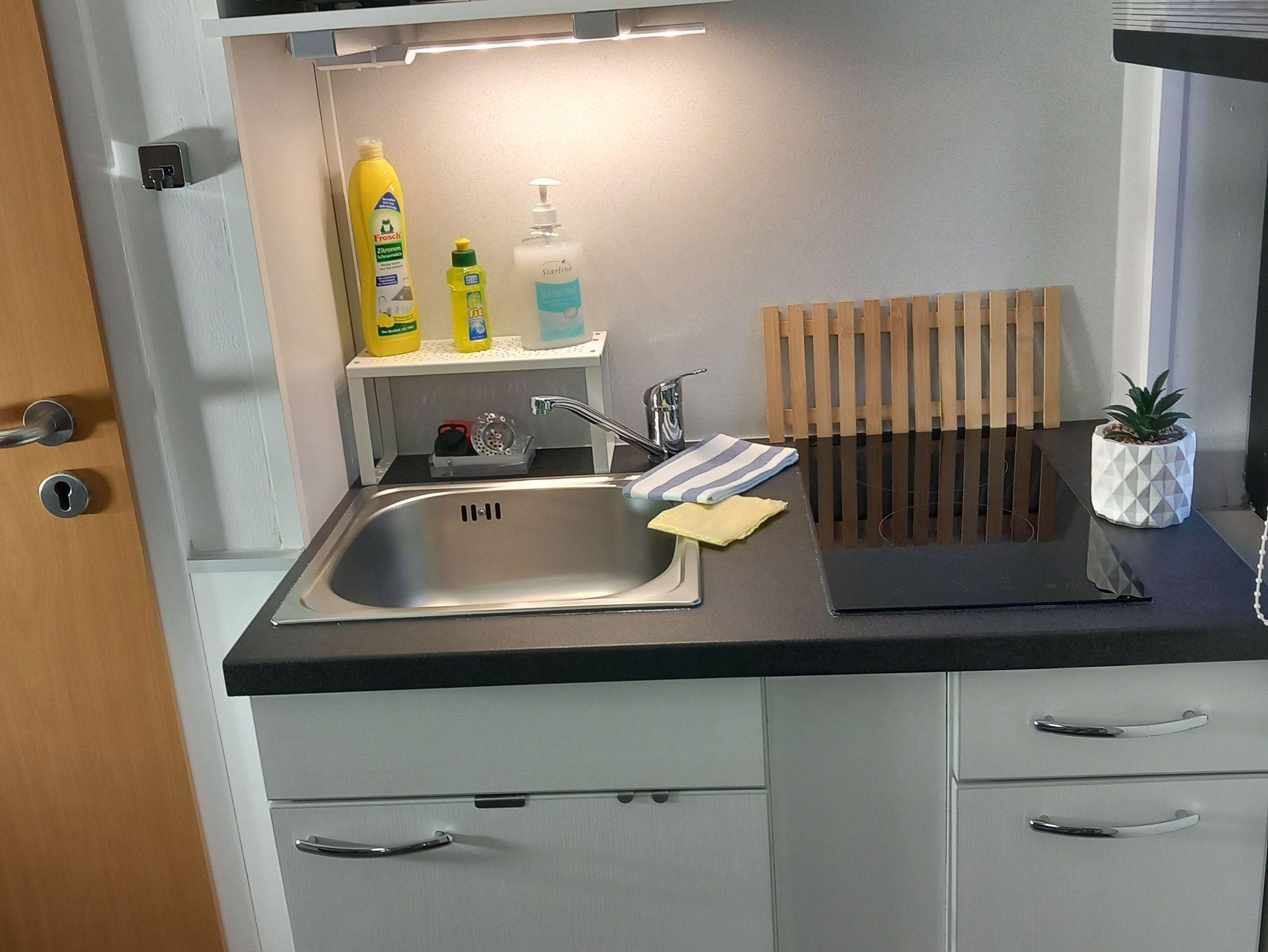 Komb. Wohnraum mit neuer Einbauküche (Kühlschrank mit Gefriermöglichkeit), 2 Clubsessel und Tisch, Fenster im Wohn- und Küchenbereich, moderner Waschtisch, neue Dusche-2023, WC mit Fenster