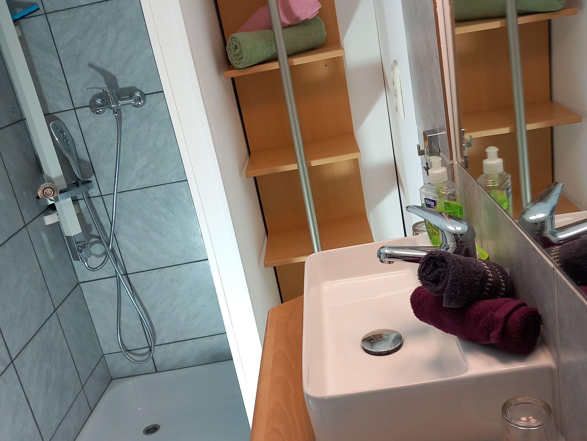 Ferienwohnung mit separatem Eingang ebenerdig auf eigenem Grundstück. (alle Räume haben Fenster und sind mit Insektenschutz), sep. Schlafraum mit Ehebetten und 2 Nachttischen, separate Dusche(neue Duschsäule-Überkopfbrause-Handdusche) und WC mit Fenster, Wohnraum mit Fenster, neue Einbauküche (Fenster im Küchenbereich) mit doppelter Cerankochstelle, Spüle, Kühlschrank mit Gefriermöglichkeit, kompl. Ausstattung Geschirr-Töpfe-Besteck, Toaster, Wasserkocher, Filterkaffeemaschine, Eierkocher, Mikrowelle