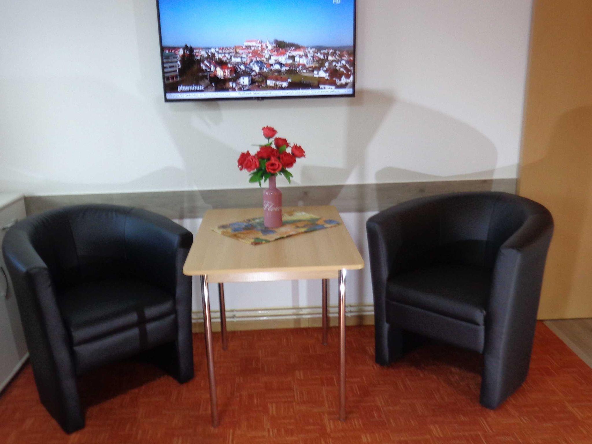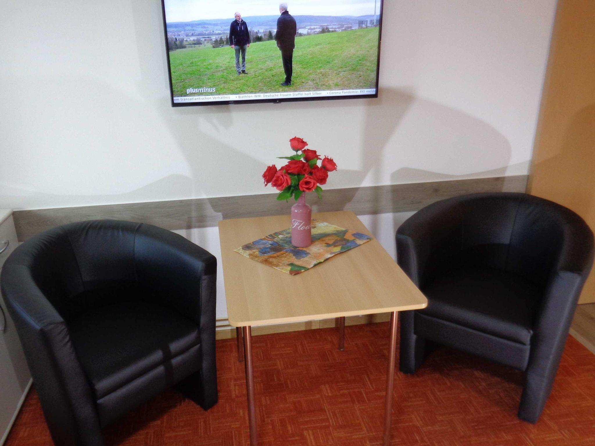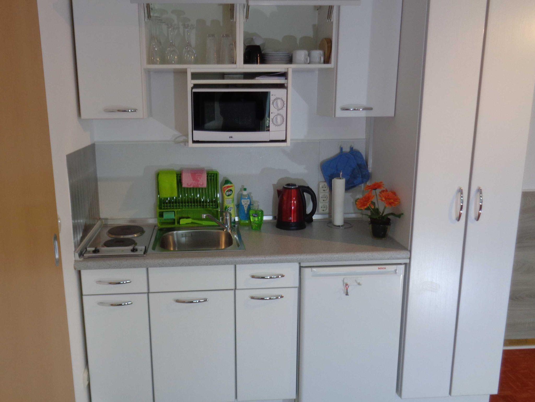 Kleine Ferienwohnung mit sep. Eingang auf eigenem Grundstück, in ruhiger, aber doch zentraler Lage im Grünen mit Terrasse und Gartenmöbel (Grillmöglichkeit), ebenerdig., WLAN-kostenfrei, Kombination aus Wohn- und Schlafraum mit zwei Einzelbetten 90x200 (können auch zusammen gestellt werden), moderne Einbauküche, Mikrowelle, Kühlschrank, doppelte Kochstelle, Eierkocher, Toaster, Kaffeemasch. und Wasserkocher, Tisch mit 2 Cocktailsessel, Dusche und WC mit modernem Waschtisch