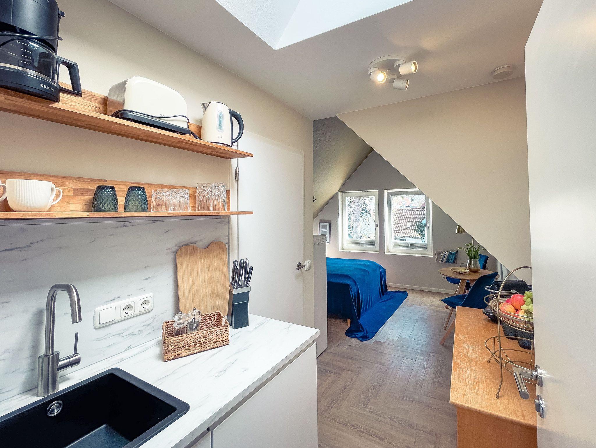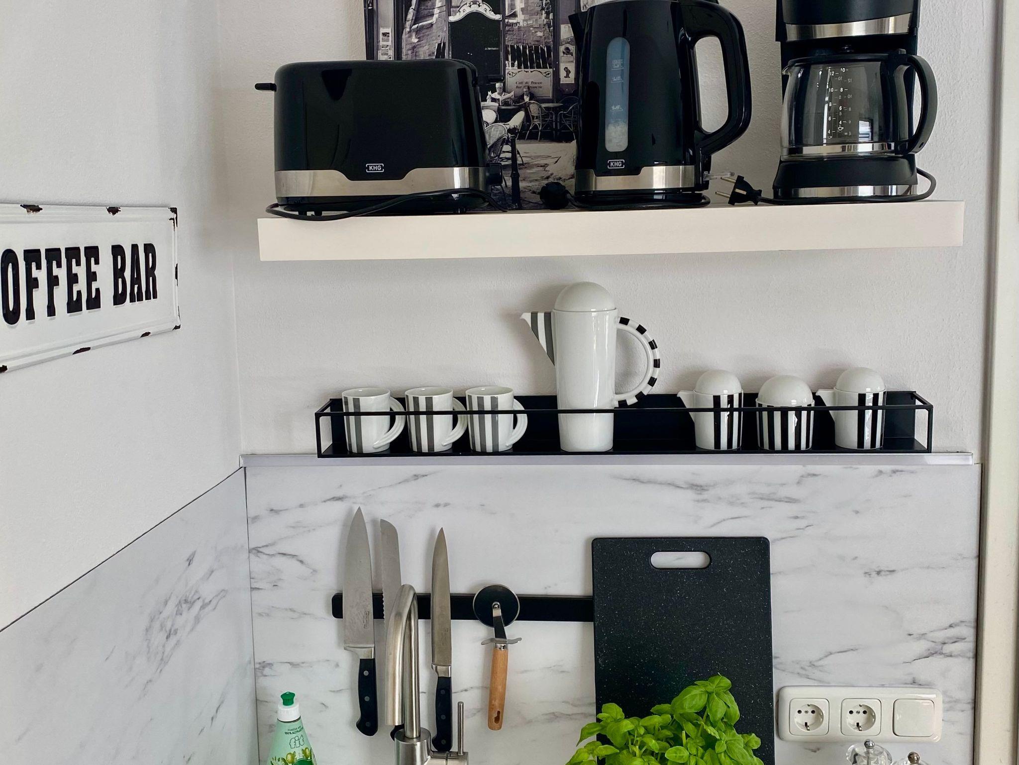 Doppelbett, Bettwäsche, Pantry Küche mit Kühlschrank & Herd, Duschbad mit Fön & Handtüchern, Smart - TV und Internet. Die Pantryküche ist mit Geschirr, Gläsern, Besteck, Töpfen und einer Pfanne, einer Kaffee- und einer Nespressomaschine, Toaster, Wasserkocher und anderen Gebrauchsgegenständen ausgestattet.