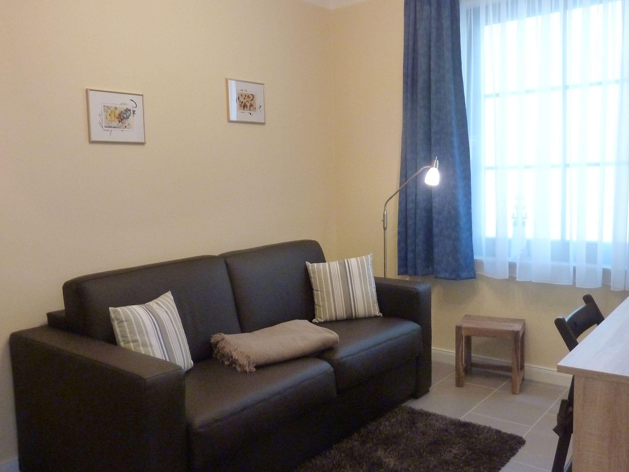 Die helle Ferienwohnung verfügt über ein schönes Schlafzimmer mit erhöhtem Doppelbett. Und ein weiteres kleines Schlafzimmer mit ausziehbarem Sofa auf dem zwei Personen schlafen können und Schreibtisch. WLAN-Anschluss sowie ein zweiter Fernseher sind vorhanden.