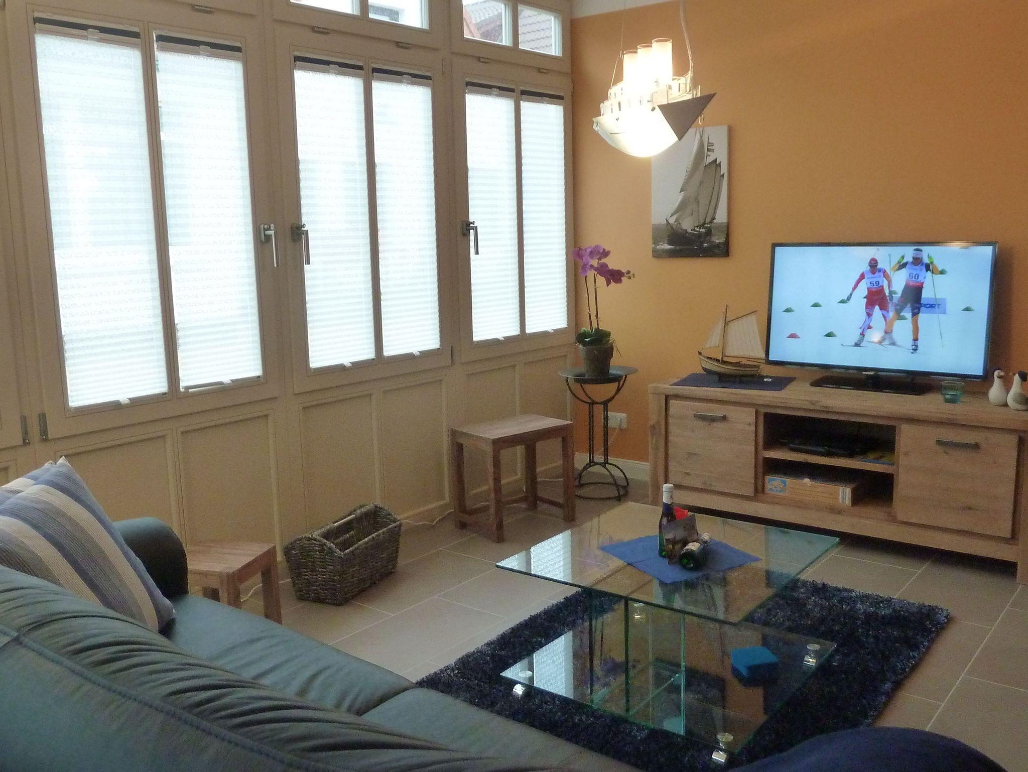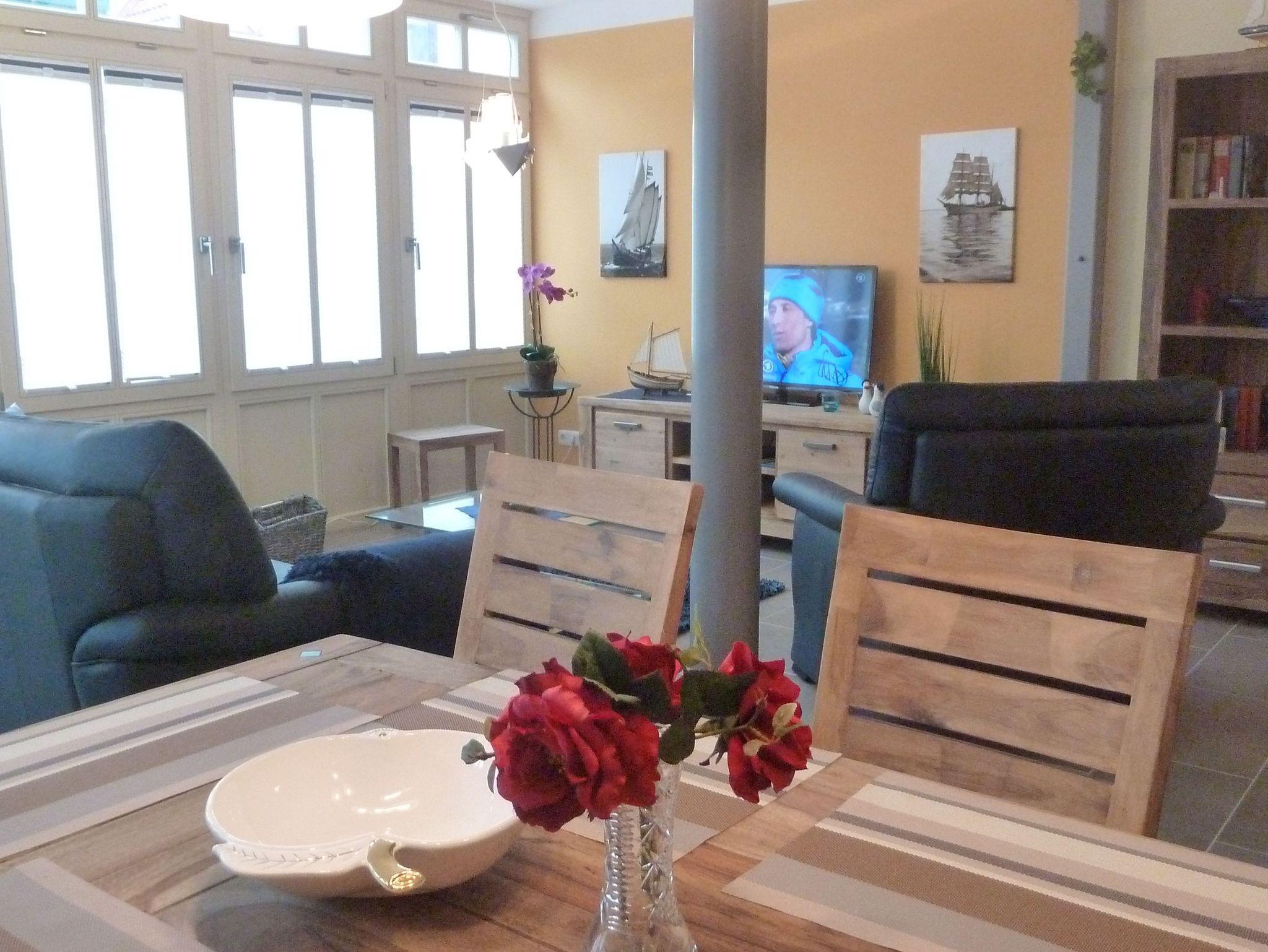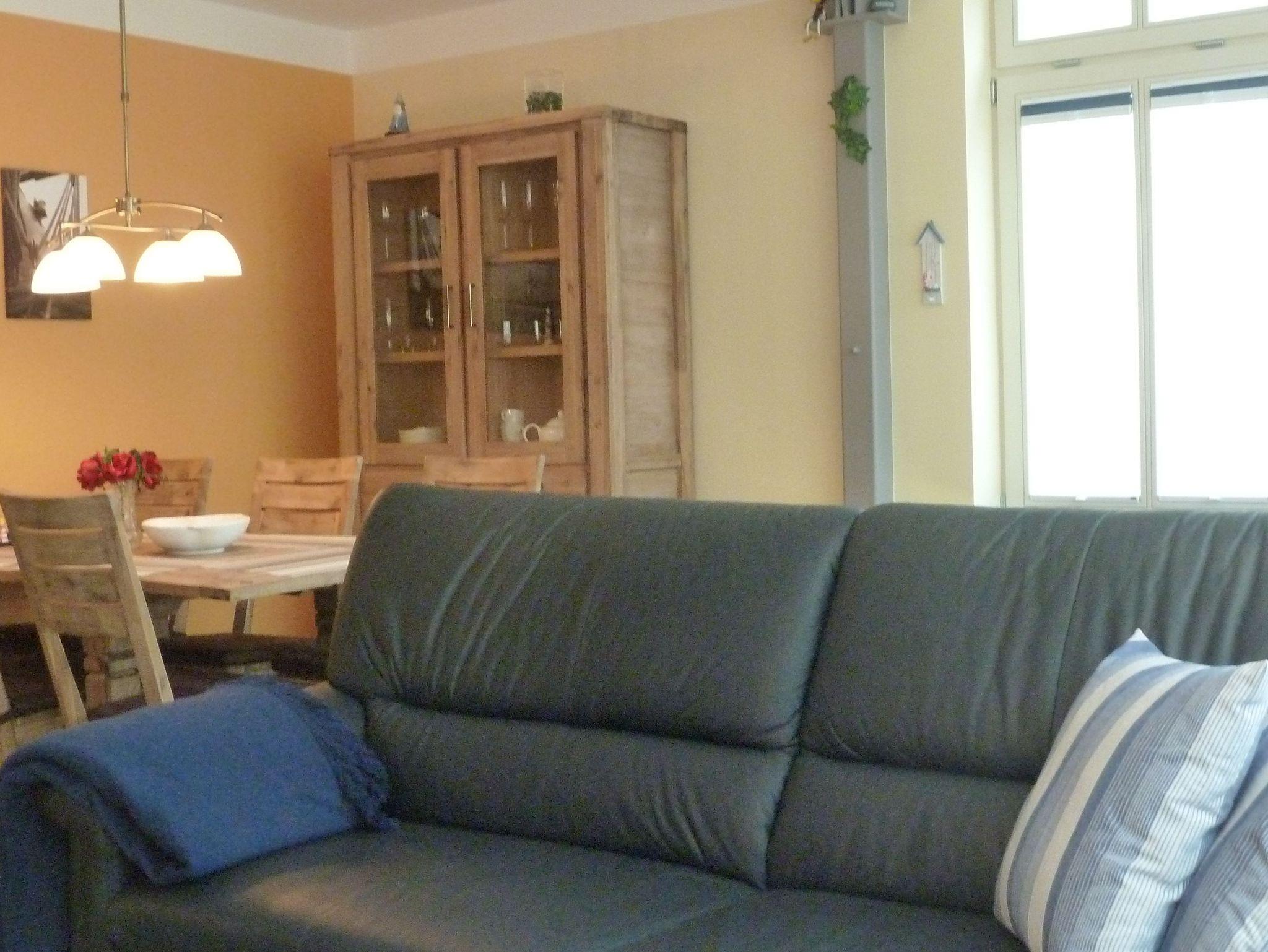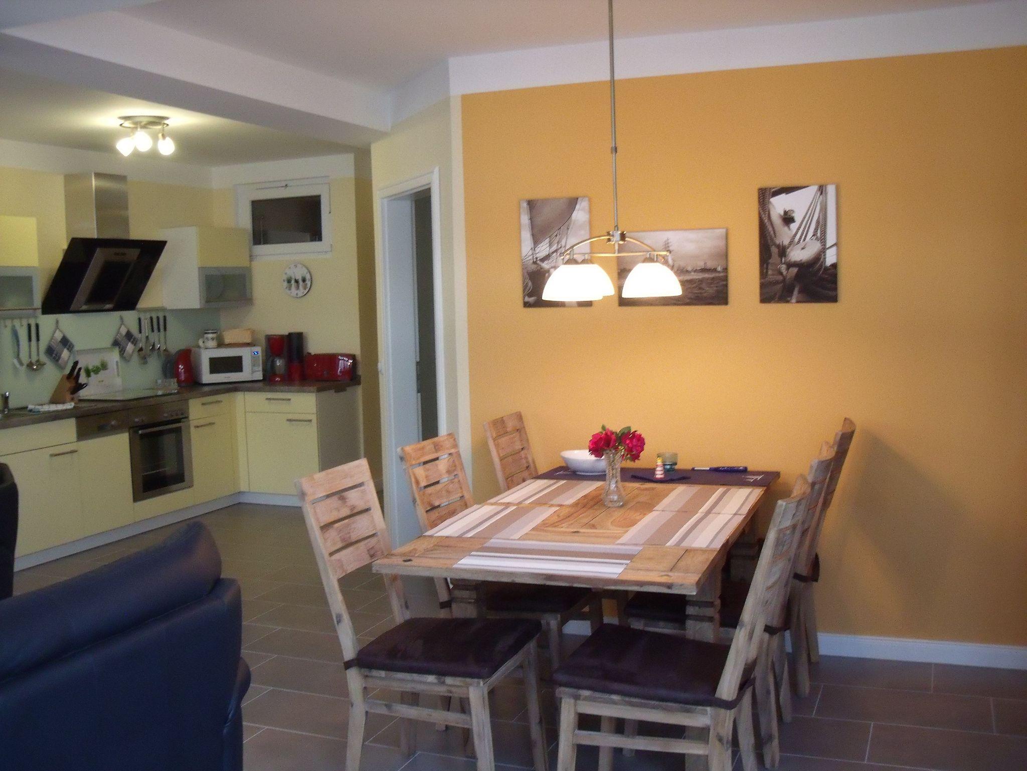 Die ebenerdige 69qm große Wohnung für 2 bis 4 Personen ist gemütlich eingerichtet und verfügt über eine großzügiges Wohn-/ Esszimmer mit integrierter, voll ausgestatteter Küchenzeile. Hier stehen ihnen ein Esstisch für Ihre Mahlzeiten und eine gemütliche Sofaecke mit Flachbildfernseher und Blue Ray Player zur Verfügung.