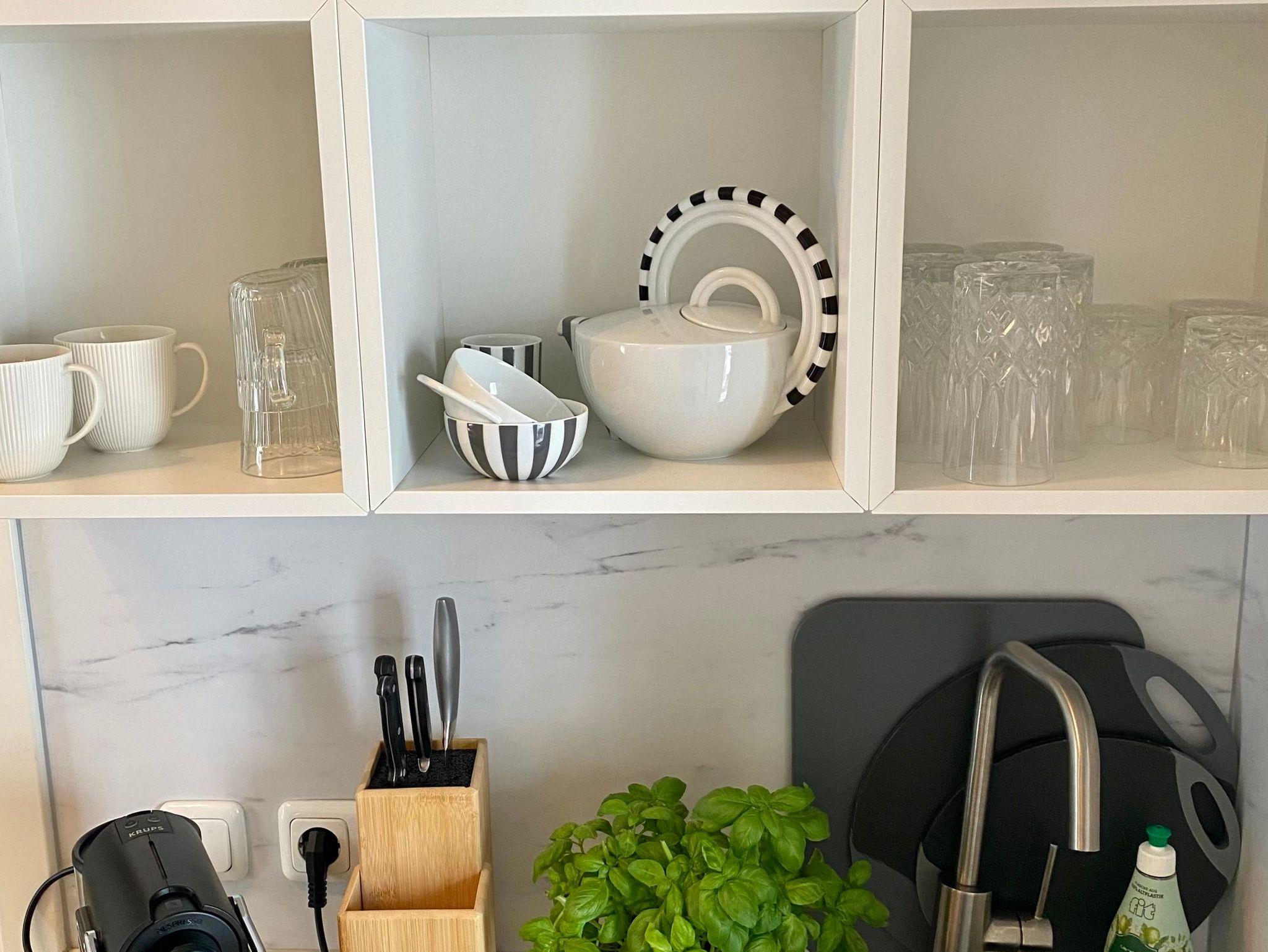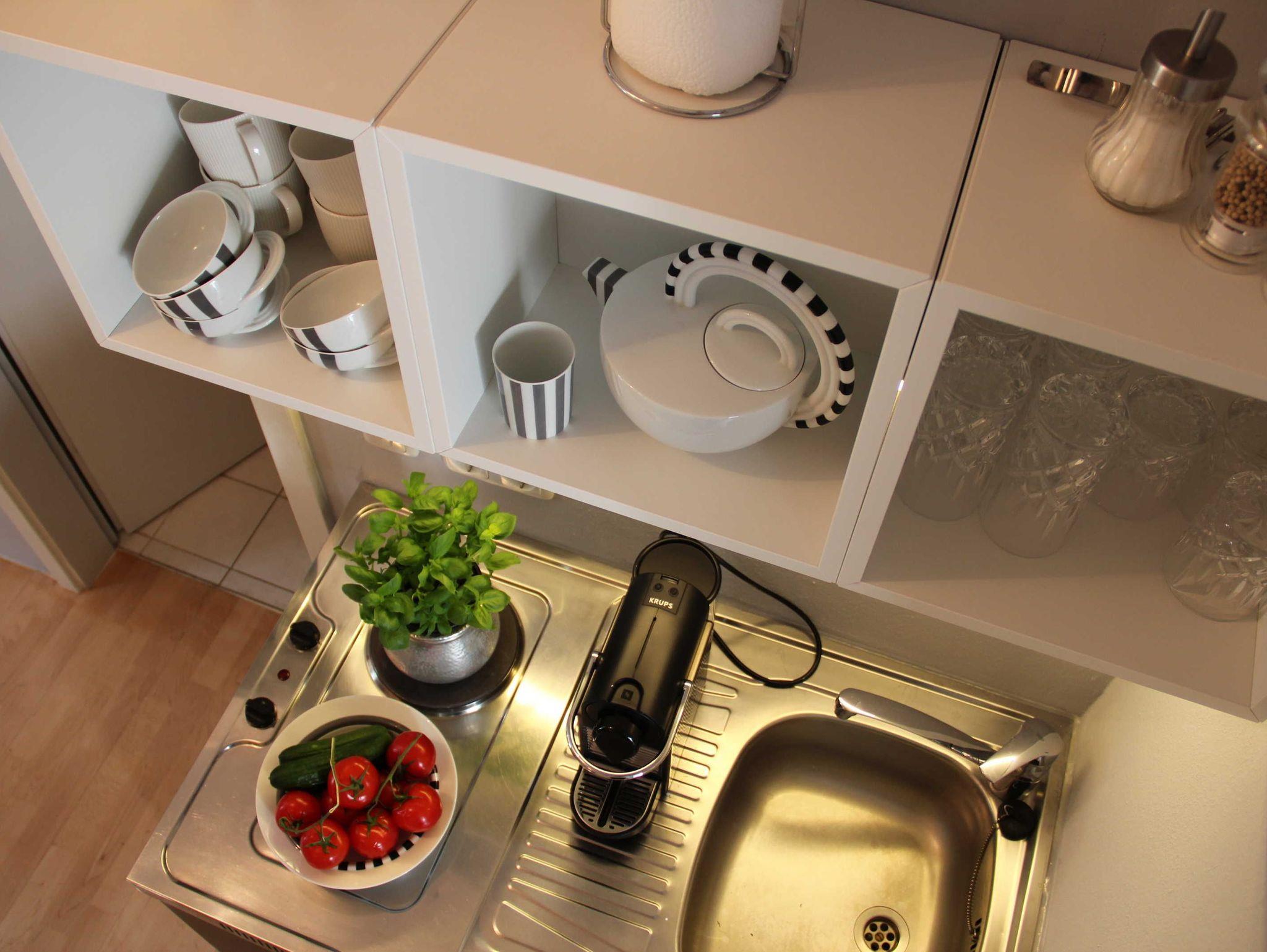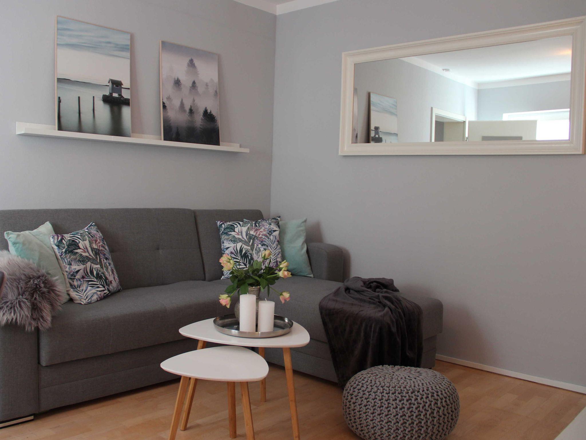 Doppelbett mit Bettwäsche, Pantry - Küche mit kleinem Kühlschrank & Herd, Bad mit Dusche/WC, Fön und Handtüchern. Es gibt einen Smart TV, WLan, einige Bücher und Spiele. Die Pantry-Küche ist mit Geschirr, Besteck, Gläsern, einer Filterkaffee- und Nespressomaschine, einem Toaster, Wasserkocher und anderen Gebrauchsgegenständen ausgestettet. Im Wohnzimmer befindet sich eine Schlafcouch.