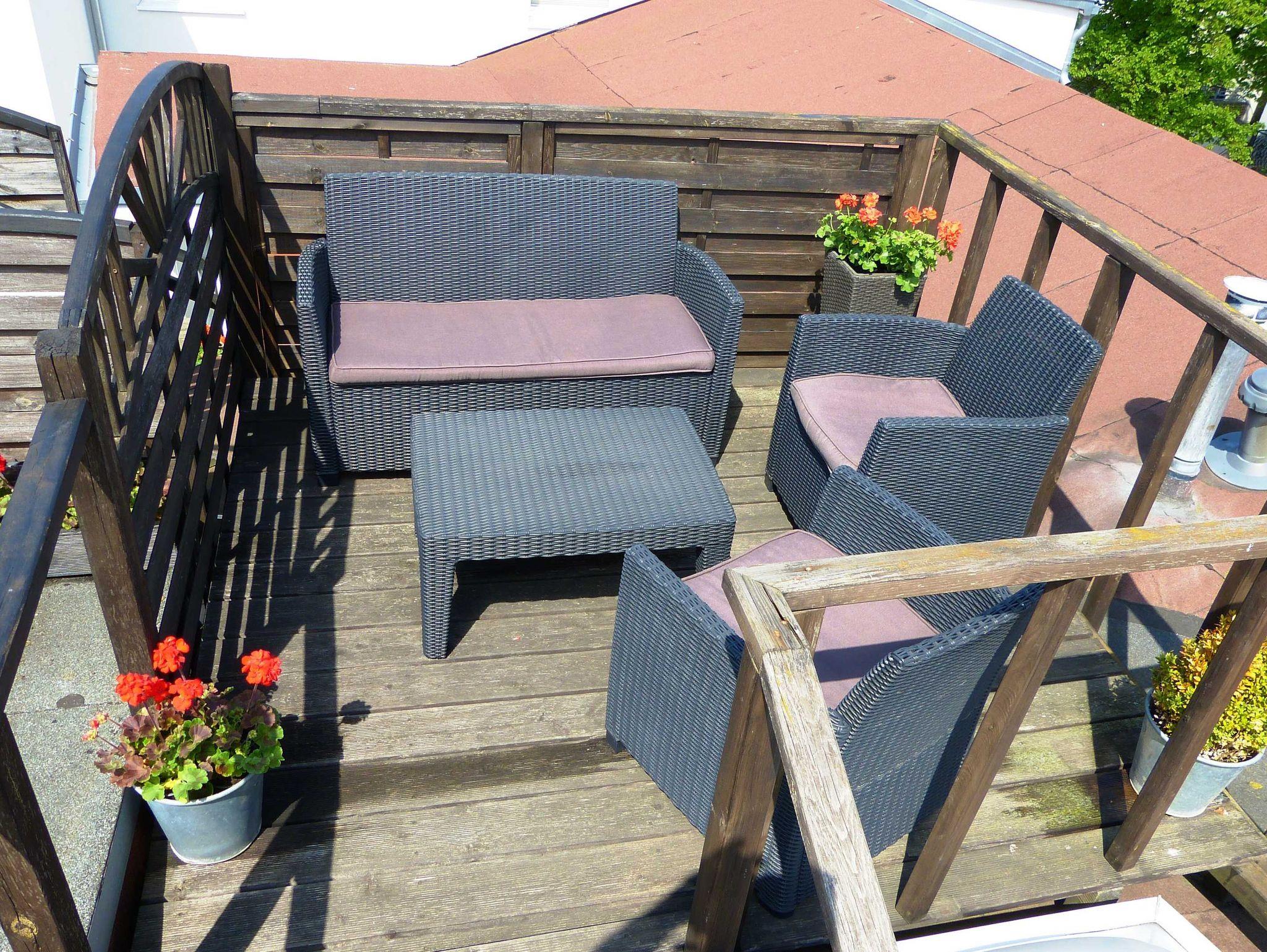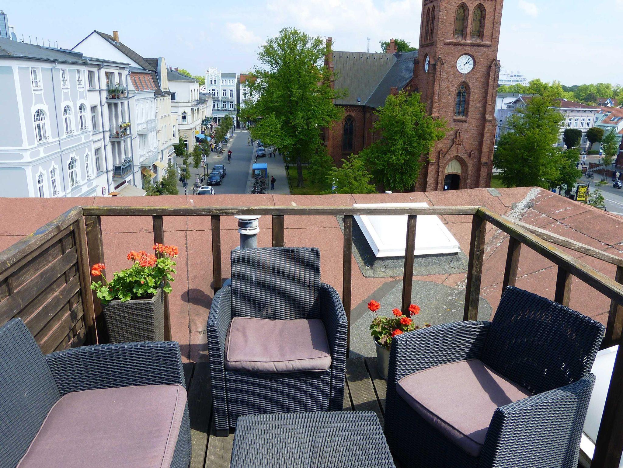 Über einen Dachausstieg (steile Treppe) gelangen Sie zu einer kleinen Terrasse mit Sitzmöglichkeiten für 2 Personen. Von hier aus haben Sie einen herrlichen Blick über Warnemünde und auf die Kreuzfahrtschiffe.