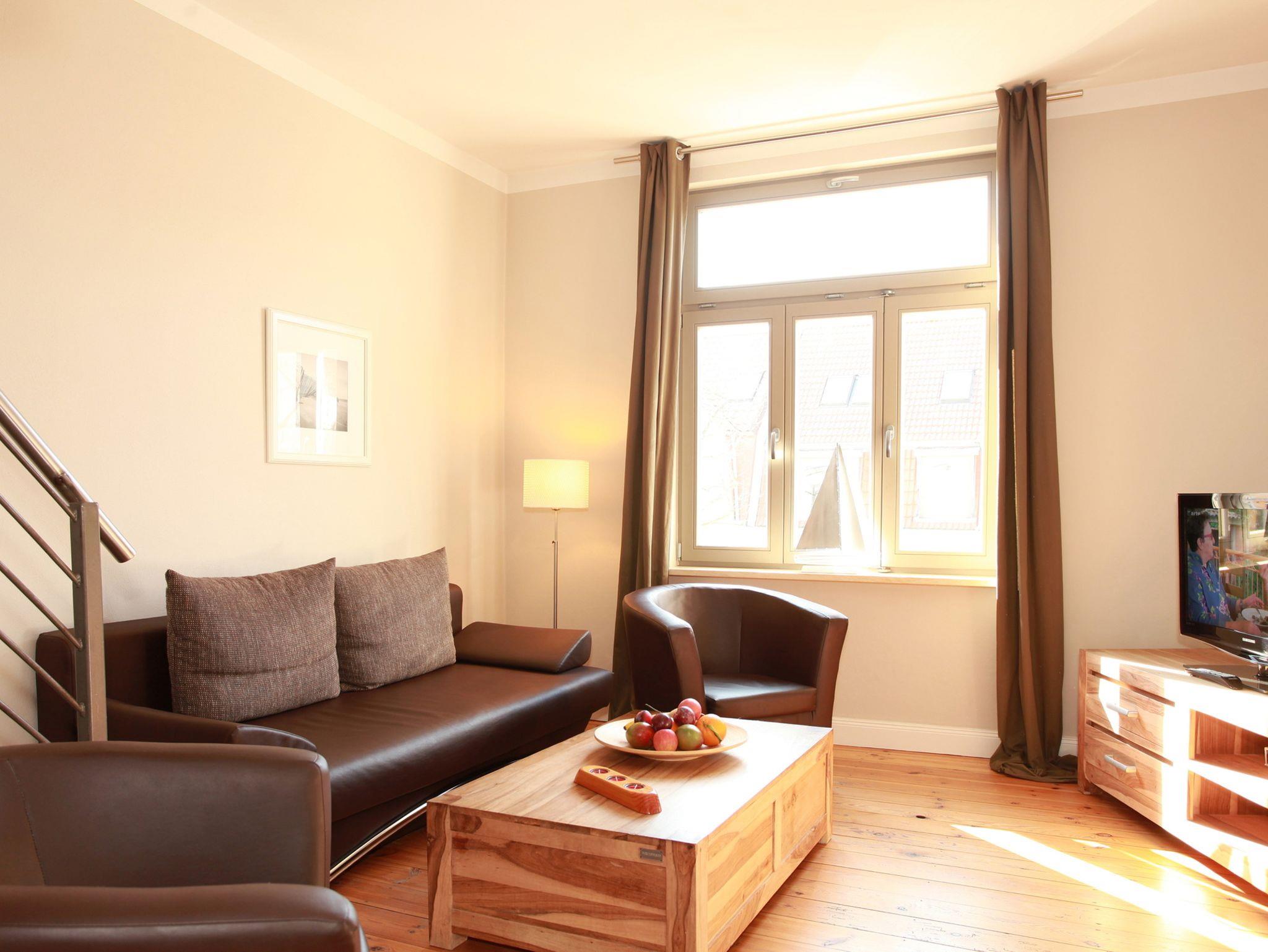 Das Wohnzimmer verfügt über einen Flachbildschirm, Radio und CD-Anlage. Die Wohnung hat einen separaten Zugang zur großen Dachterrasse, mit stilvollen Terrassenmöbeln ausgestattet, können Sie hier mit den ersten Sonnenstrahlen frühstücken oder den Blick über Warnemünde und dem Kreuzfahrtterminal schweifen lassen.