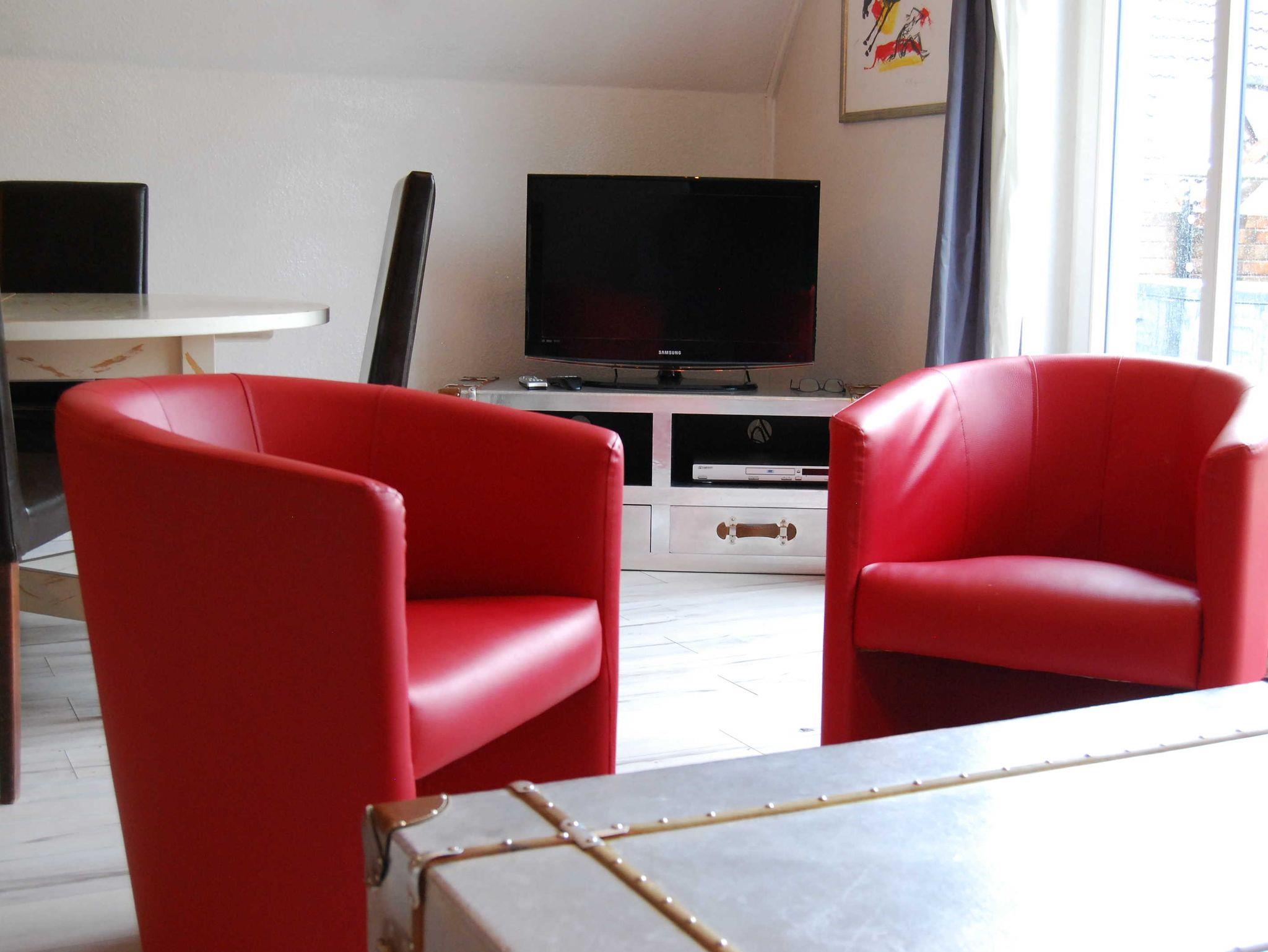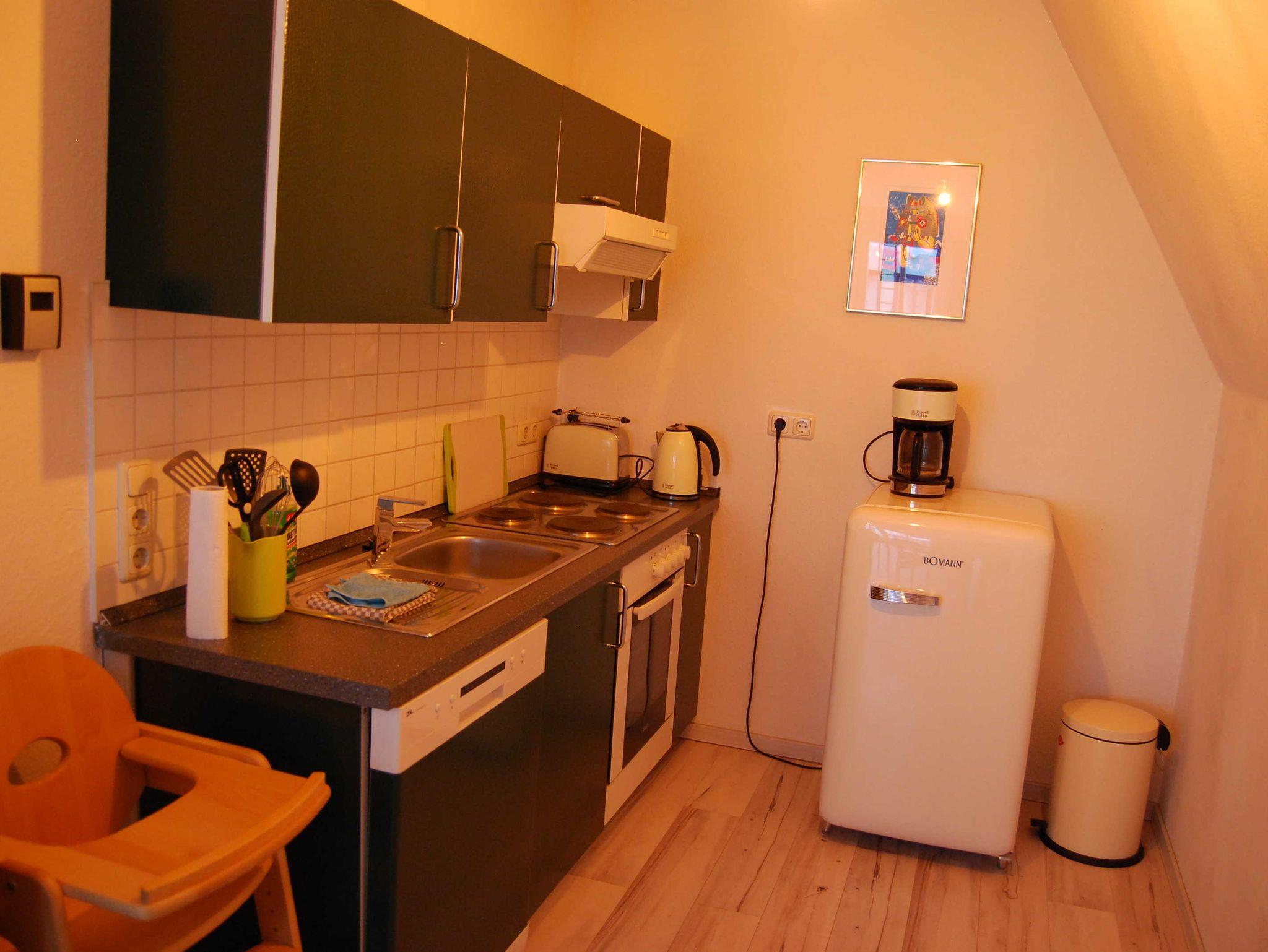 Die Ferienwohnung ist eine Maisonette-Wohnung, besitzt große, lichtdurchflutete Fenster und ist 2011 renoviert worden. Sie ist mit allem Wichtigen für eine Ferienwohnung ausgestattet. In das Obergeschoss führt eine steile Raumspartreppe.