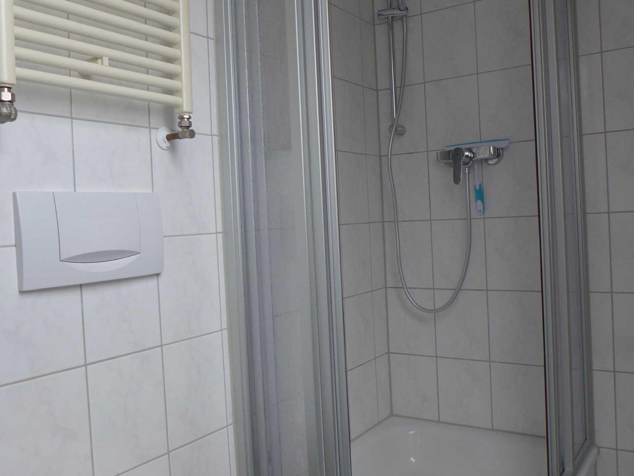 Das Badezimmer ist mit Dusche, Waschbecken und WC ausgestattet. Zwei Parkplätze am Haus sind im Mietpreis inbegriffen.