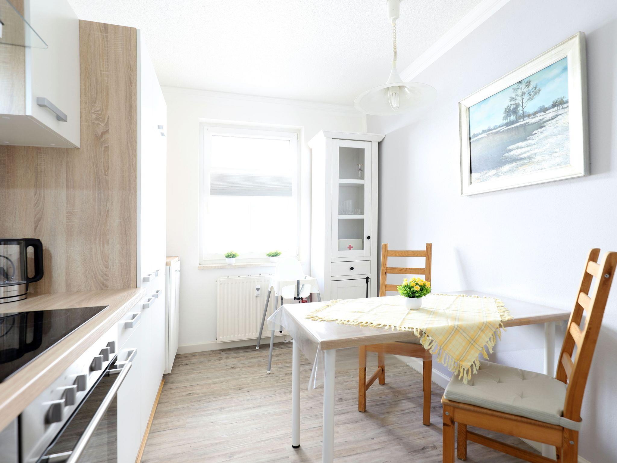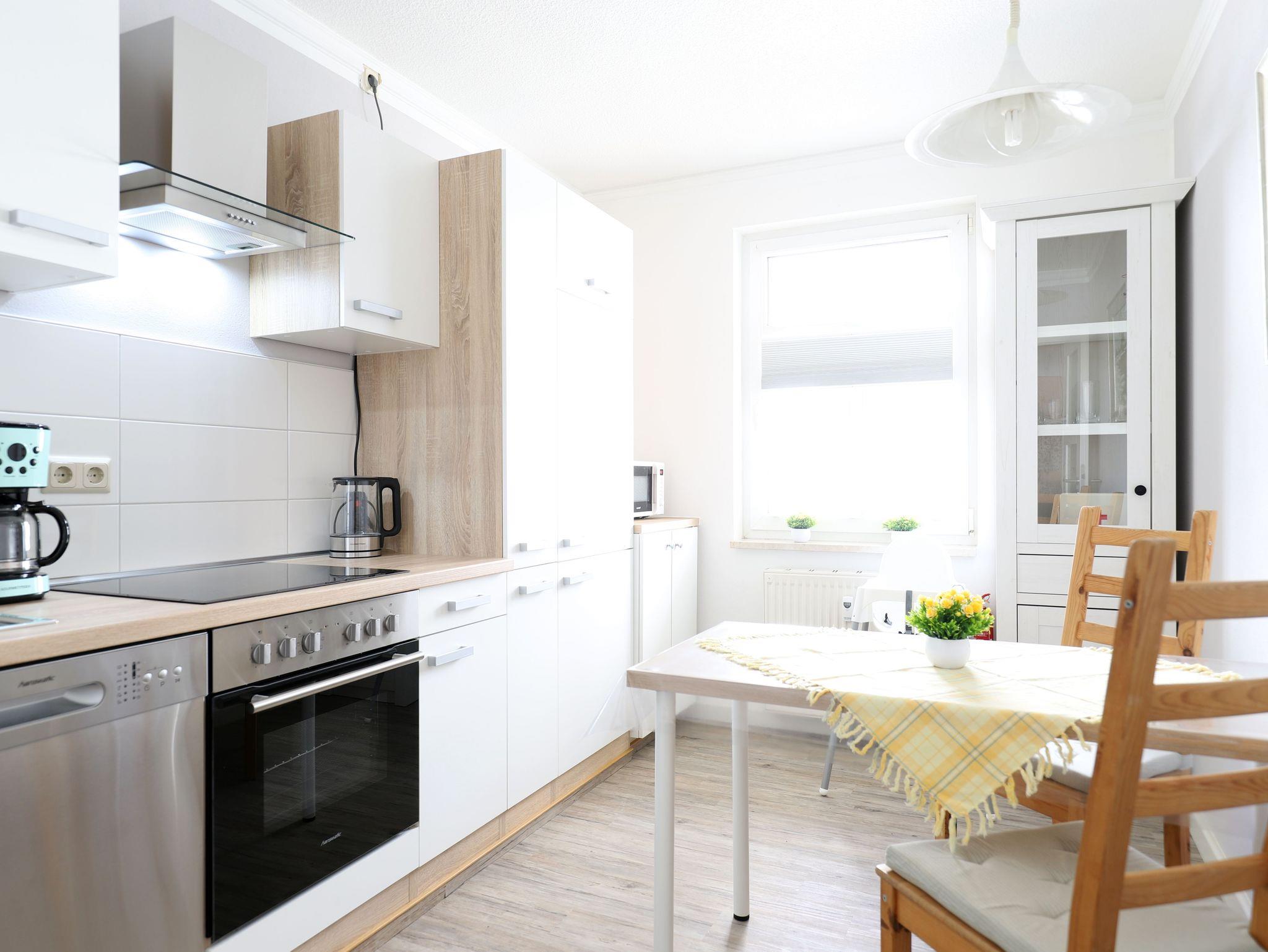 Die Ferienwohnung hat eine separate und voll ausgestattete Küche mit Ceranherd, Spülmaschine, Kühlschrank mit Gefrierfach. Alles an Geschirr, Töpfen und Pfannen sowie Besteck, Microwelle, Kaffeemaschine, Babystuhl, viele verschiedene Gläser, Tisch mit Stühlen und einiges mehr sind vorhanden.