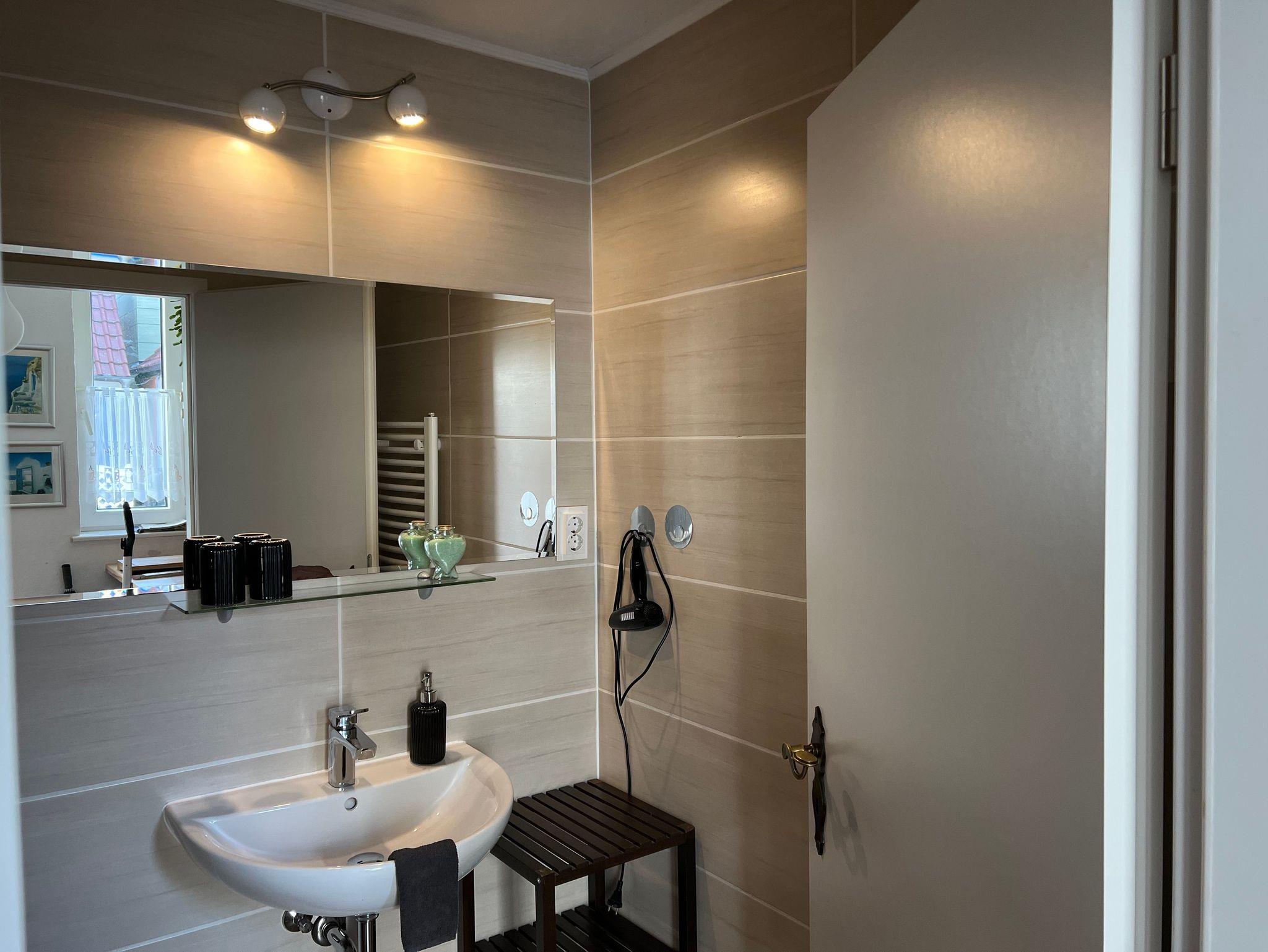 Diese Ferienwohnung ist eine 2 -Raum-Wohnung, die über ein extra Schlafzimmer verfügt. Eine dritte Person kann auf der Schlafcouch im Wohnzimmer übernachten. Ferienwohnung bietet genug Stauraum für alle Urlaubssachen sowie Kabel-TV und Radio. Die Küche mit Tisch und Stühlen ist komplett ausgestattet, das Bad verfügt über Dusche/WC. Zur Wohnung gehört auch eine 12qm große Terrasse im schönen und gemütlichen Innenhof mit Tisch und Stühlen.