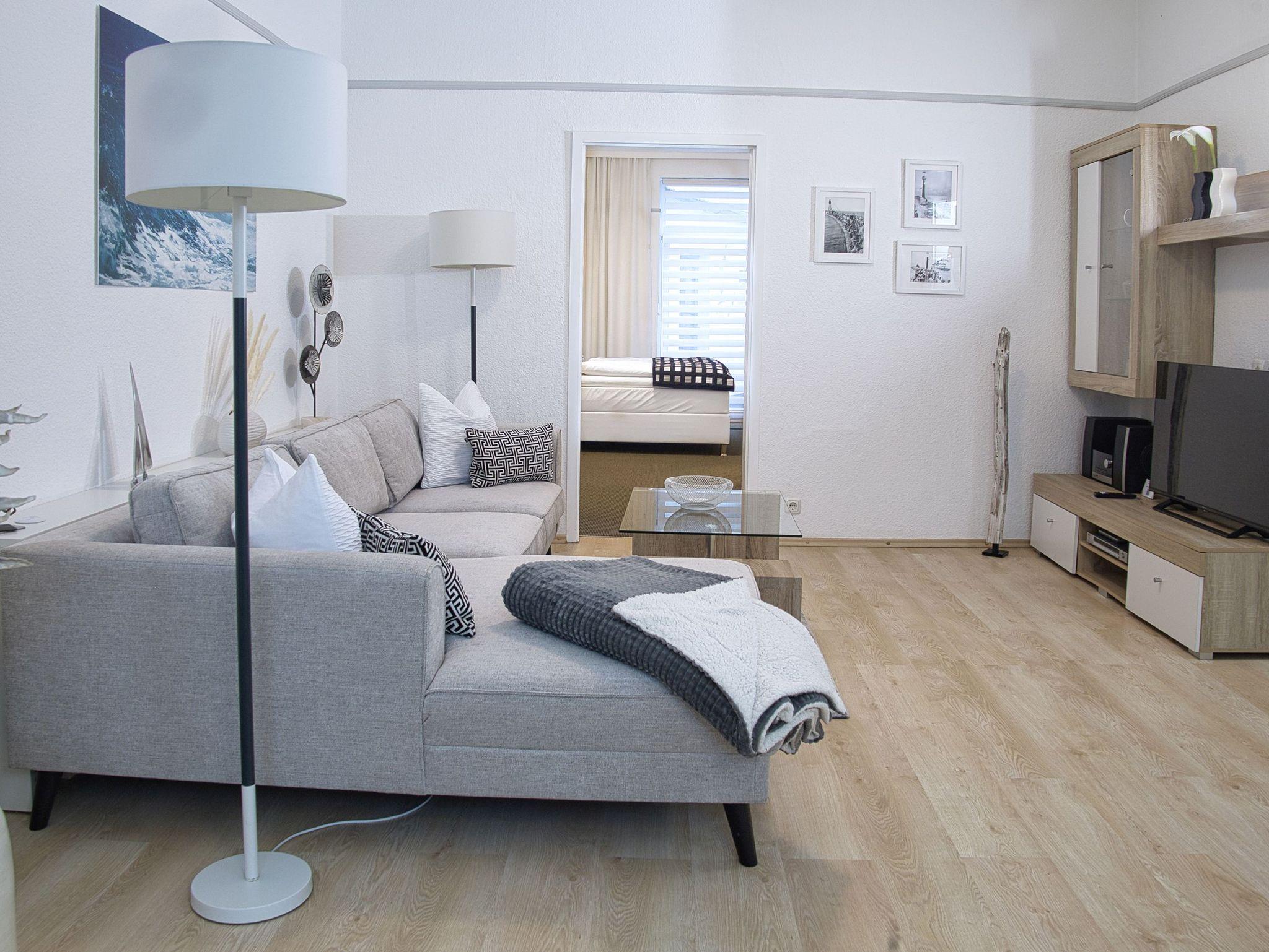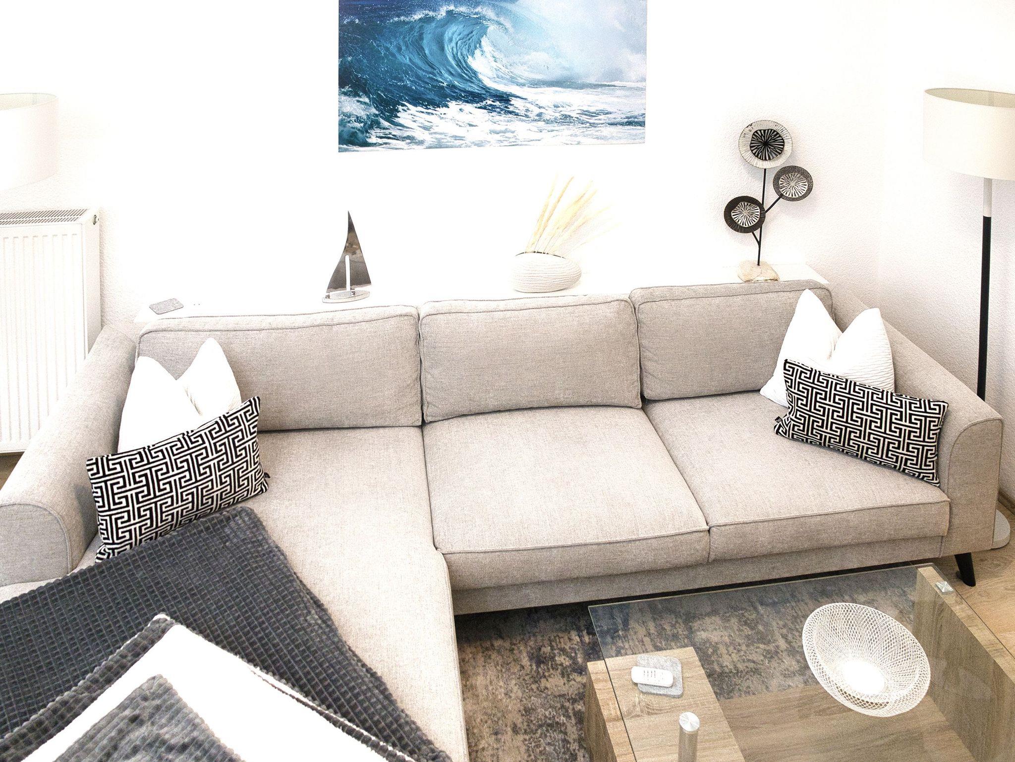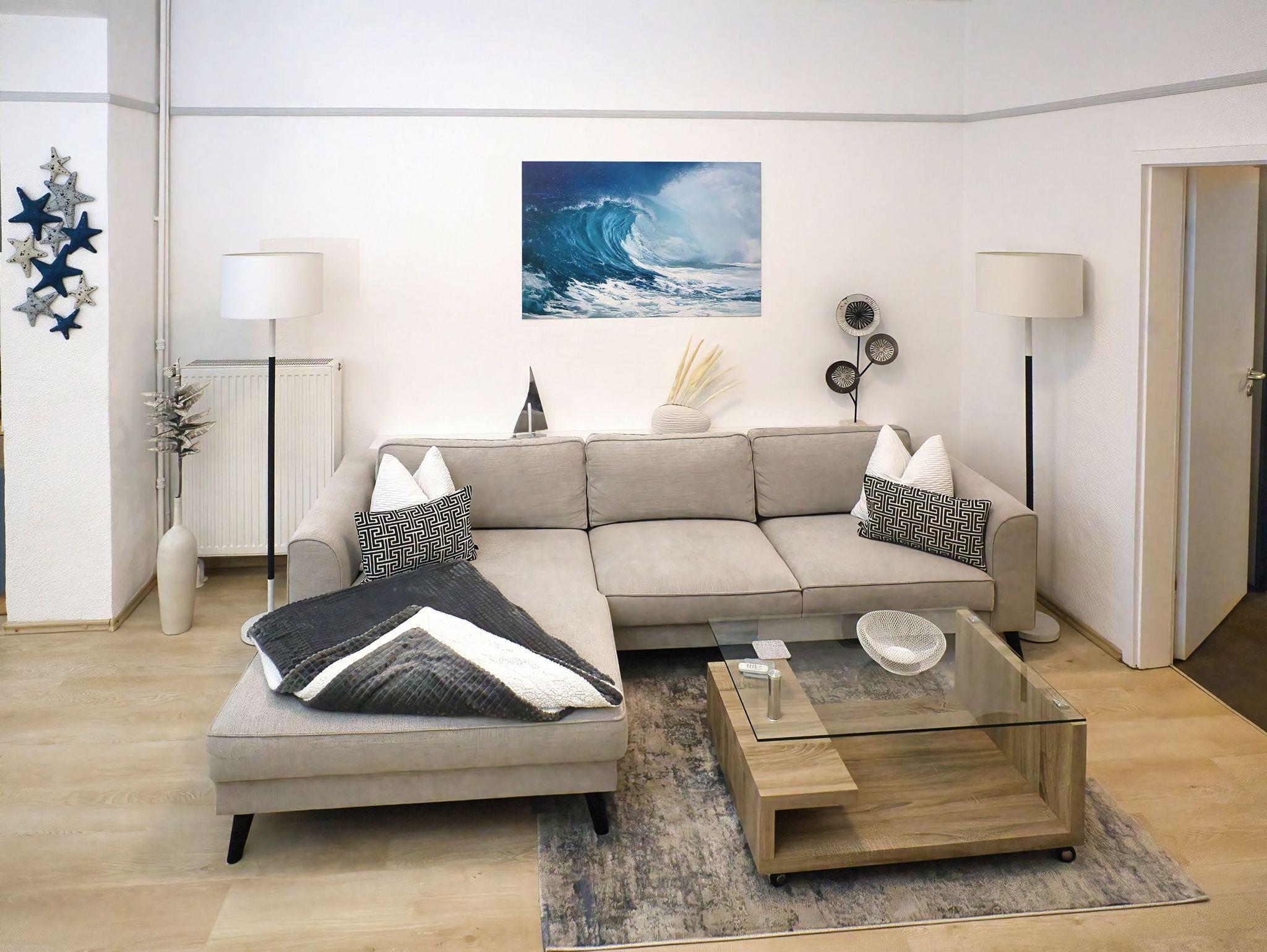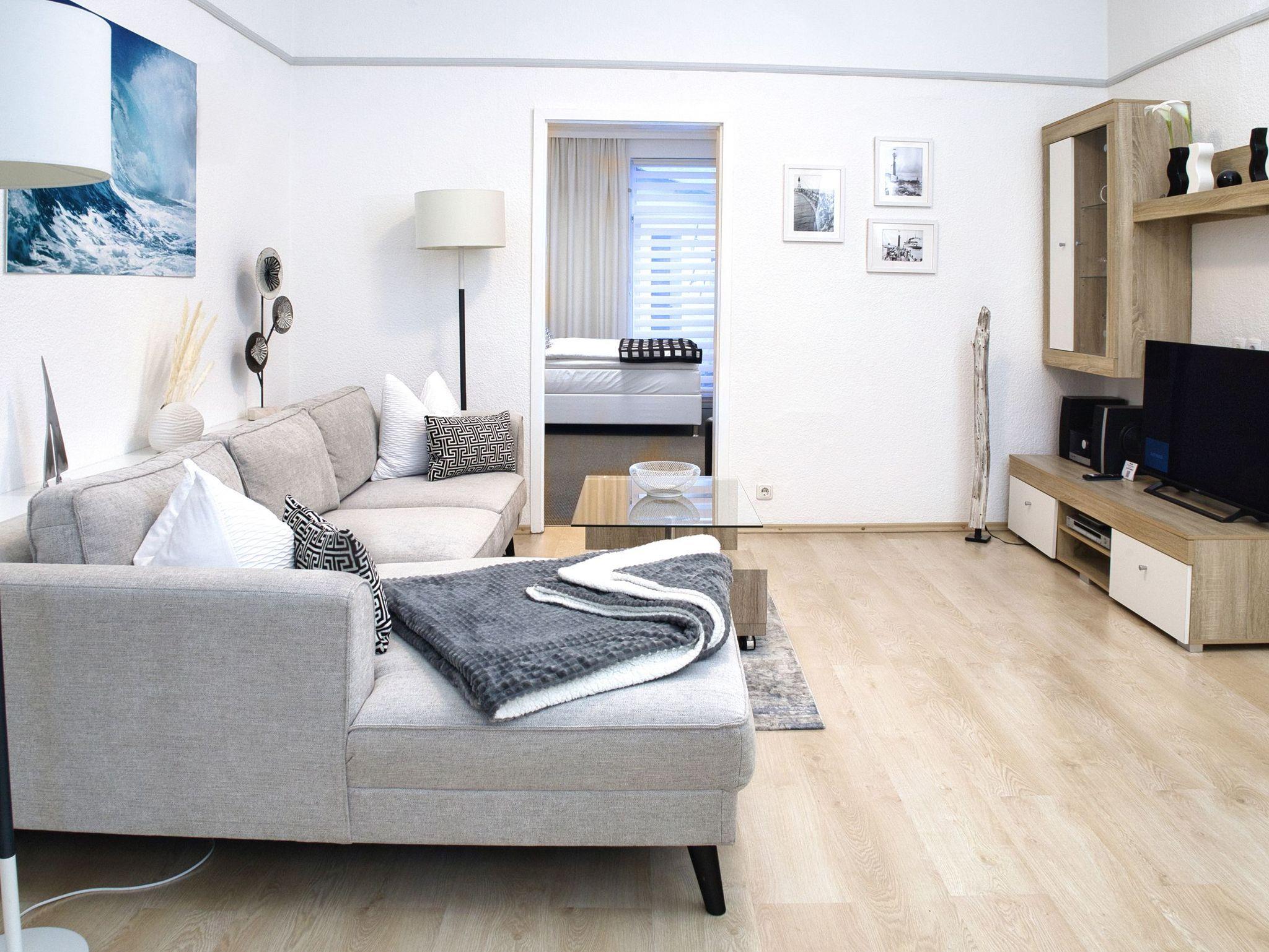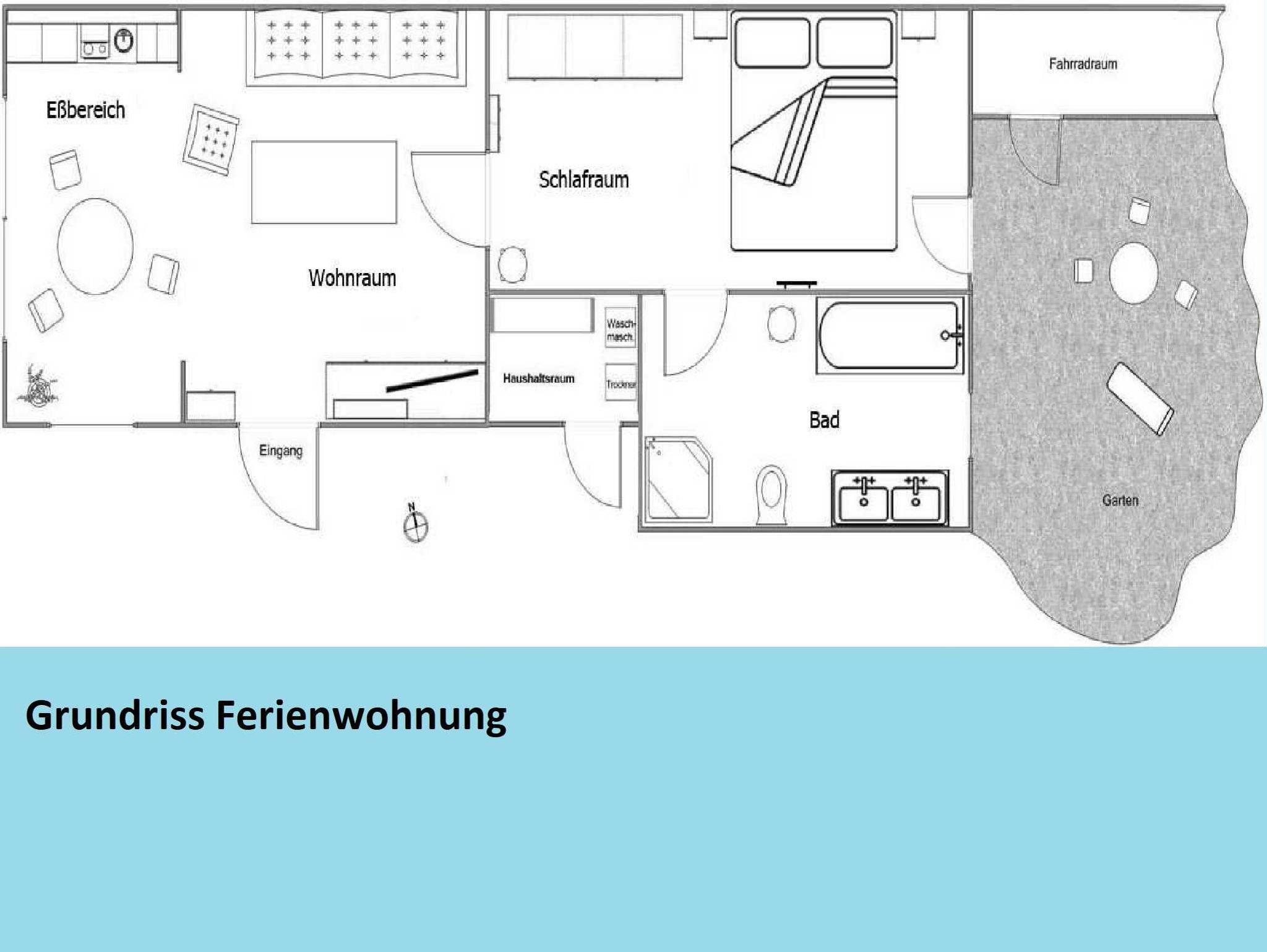 Unsere helle, moderne, 75 qm große Ferienwohnung „Ferienhaus der kurzen Wege bietet Ihnen diverse Möglichkeiten, Ihren Urlaub in optimaler Lage zu verbringen. Sie ist eine Oase der Ruhe mit schöner Terrasse zur Entspannung. Die Wohnung ist komfortabel, hell und hochwertig eingerichtet. Die Küchenzeile grenzt an den Wohn-/Essbereich und bietet Ihnen alles, was sie benötigen. Hier finden sie: Ceranfeld , Geschirrspülmaschine, Wasserkocher, Toaster, Kaffeemaschine, Kombi-Mikrowelle, Delonghi Nespresso-Maschine und natürlich genügend Geschirr und Besteck. Der Esstisch lädt schon am Morgen zum gemütlichen Frühstück ein. Ein sep. Schlafzimmer ist mit einem Doppelbett und rückengerechten Wohlfühlmatratzen, einem geräumigen Kleiderschrank und einem zweiten Flatscreen-TV ausgestattet. Im Wohnzimmer befindet sich eine moderne Sofalandschaft. Nach einem langen Strandtag finden Sie hier Erholung und können die Beine hochlegen und sich mit dem großen Flatscreen-TV wie zu Hause fühlen. Vom Schlafzimmer aus gelangen Sie auf die Terrasse mit dem idyllischen Garten (Alleinnutzung). Ein großes Bad mit Badewanne und Dusche sorgt für den richtigen Erholungs- und Wellnessfaktor. Waschmaschine und elektrischer Wäschetrockner sind vorhanden. Im Haushaltsraum finden sie Bügelbrett, Bügeleisen, Standwäschetrockner und vieles mehr. WLAN können sie bei uns kostenlos nutzen.