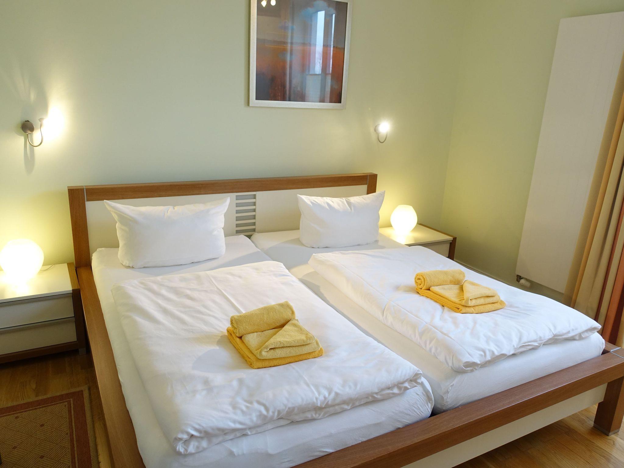 Neben dem gemütlichen Doppelschlafzimmer befindet sich das Badezimmer mit einer begehbaren Dusche.