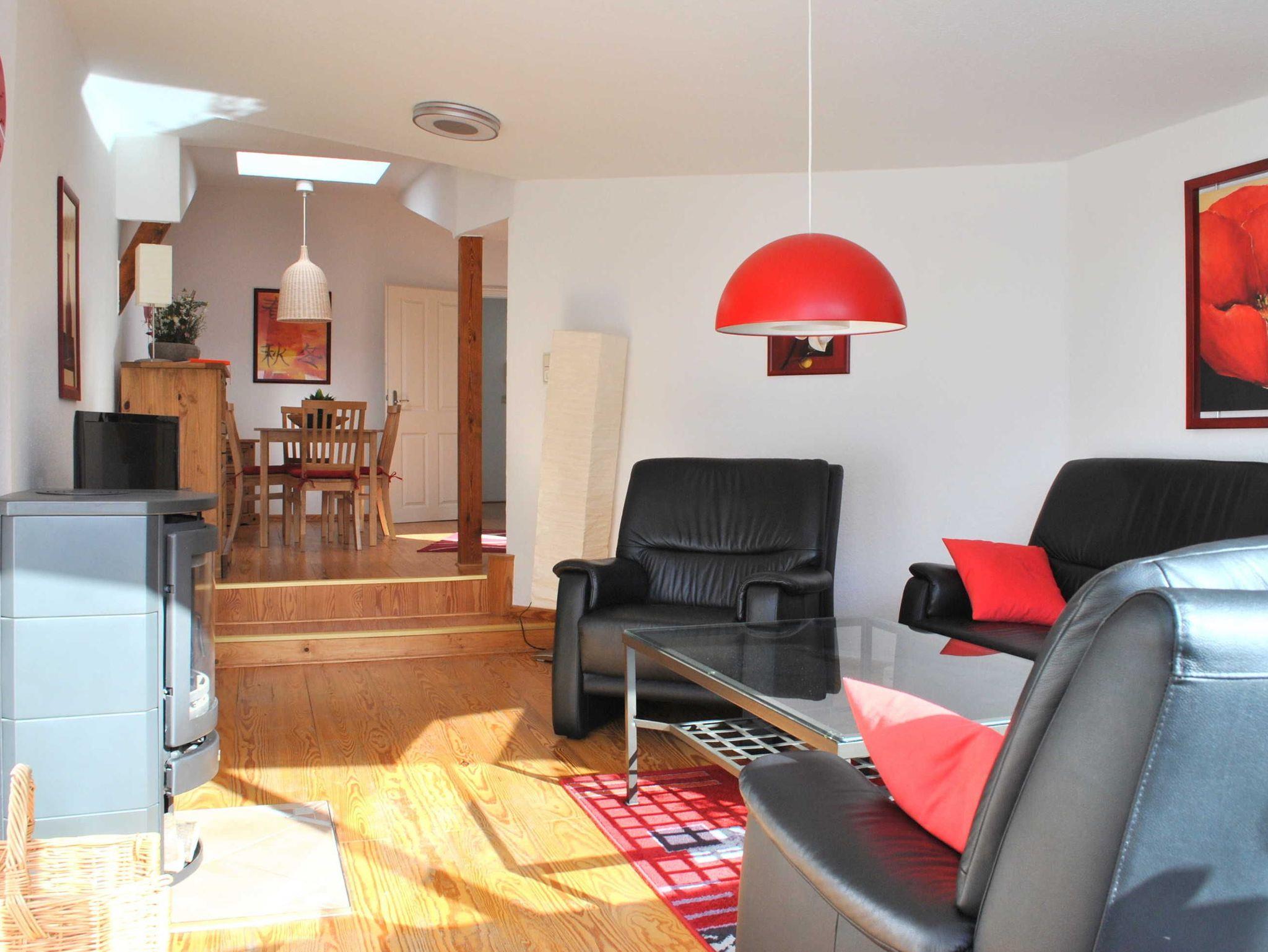 Vom modern eingerichteten Wohnbereich mit Sofalandschaft, großem TV und Radio sowie dem gemütlichen Kaminofen gelangen Sie in den offenen Essbereich mit einem Esstisch für 4 Personen und einer komplett ausgestatteten Küchenzeile. Hier finden Sie u.a. 4-Plattenherd, Ceranfeld, Kühlschrank mit Gefrierfach, Backofen, Mikrowelle, Geschirrspülmaschine, Kaffeemaschine, Toaster.