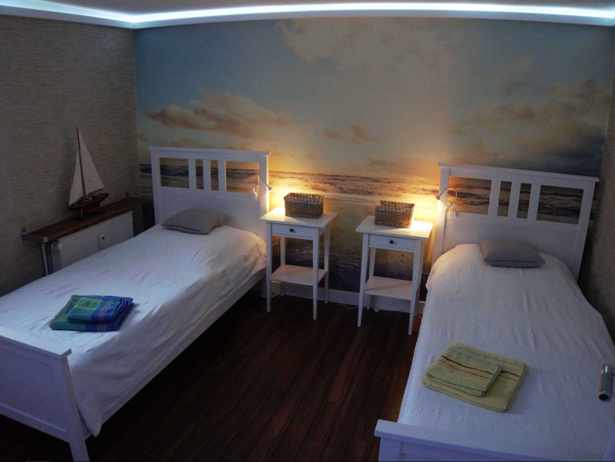 Die Ferienwohnung besteht aus einem Schlafzimmer mit getrennt stehenden Betten und einem Wohnzimmer mit einer Aufbettungsmöglichkeit. Eine komplett eingerichtete Küche mit Geschirrspüler, Herd, Kühlschrank und Mikrowelle ist vorhanden. Das Badezimmer besteht aus einer Dusche und einem WC. Im Hof kleine Raucherecke.