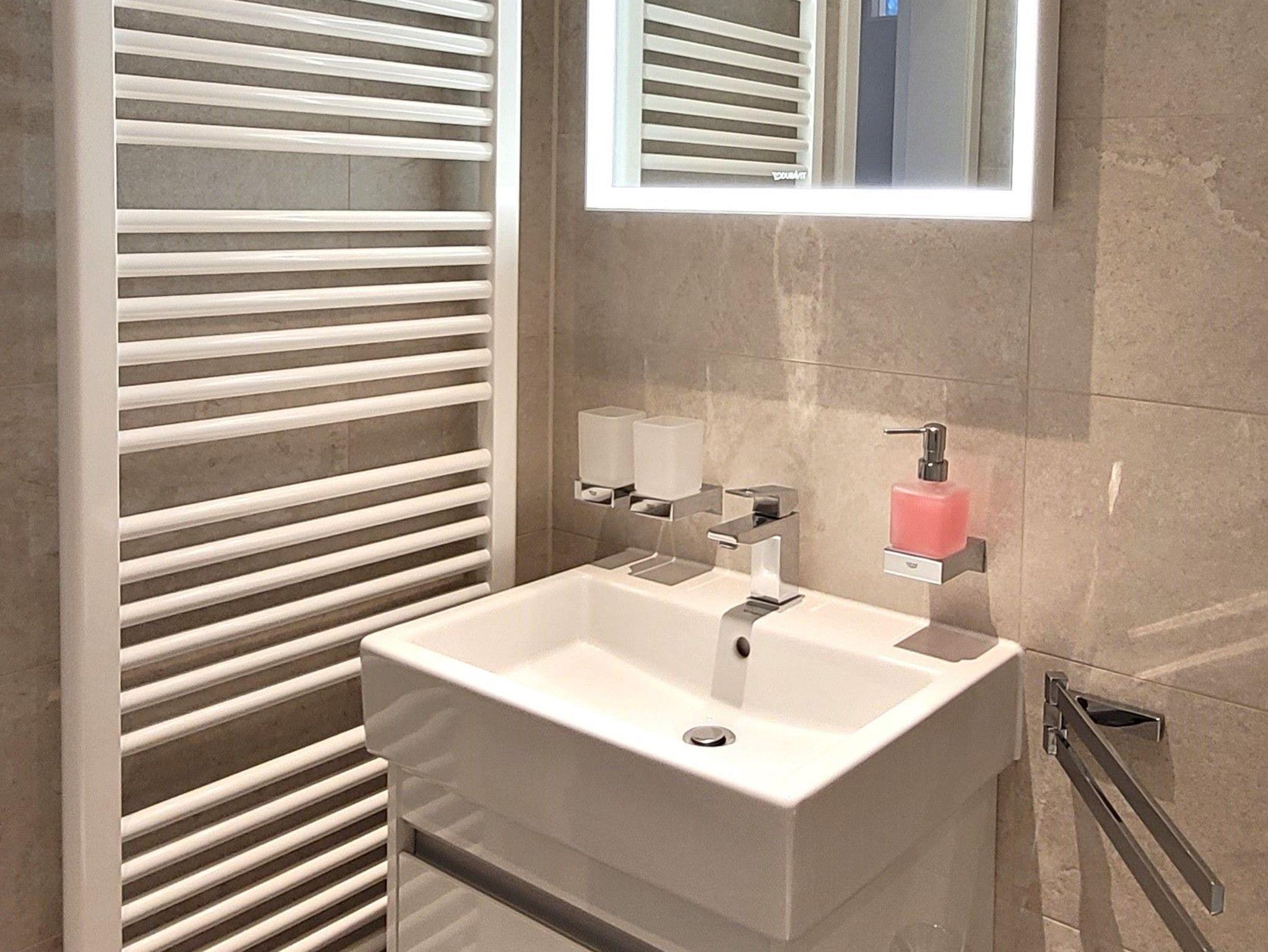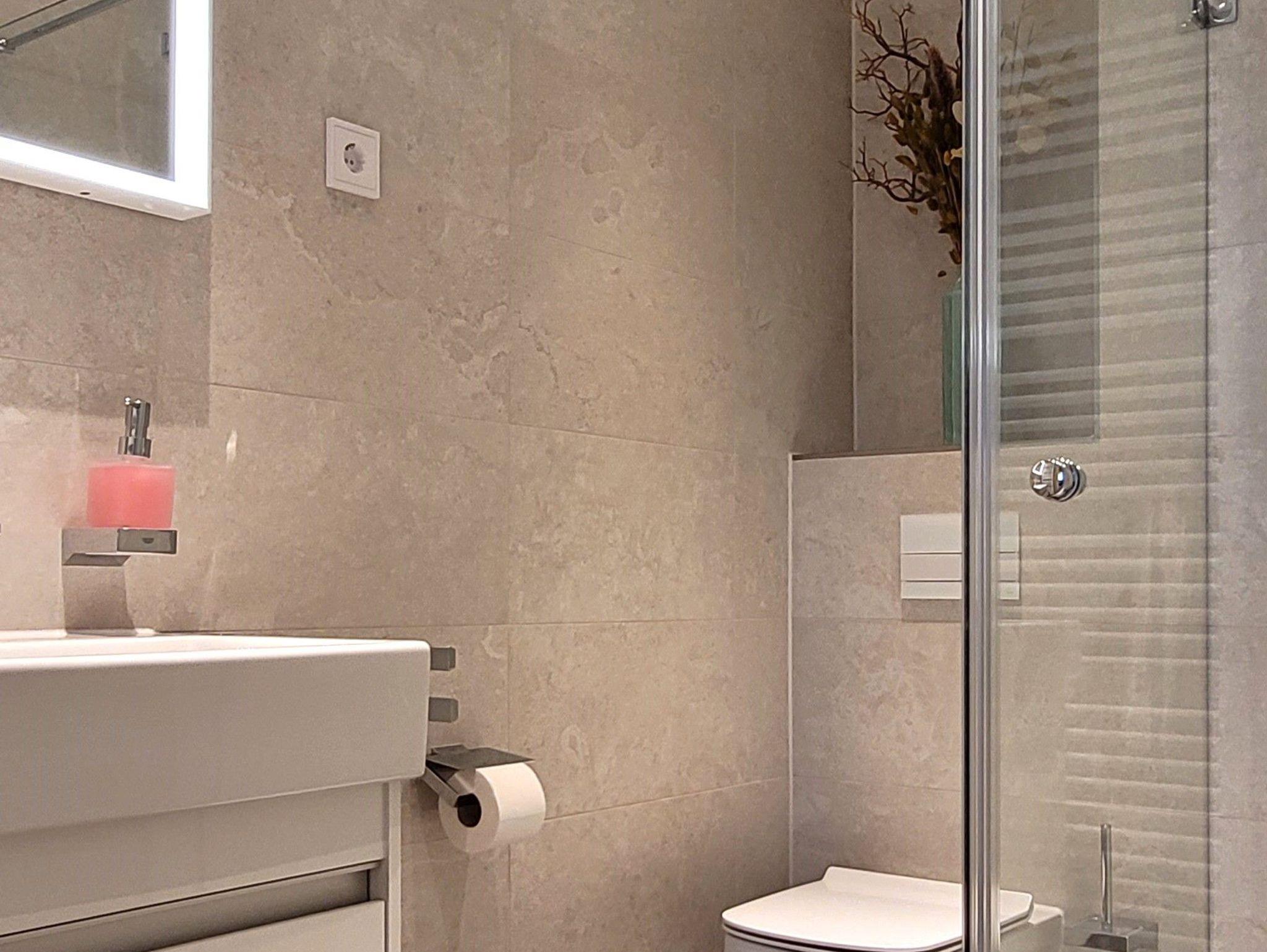 Die modern ausgestatte Einbauküche ist geschickt vom Wohnbereich abgetrennt und bietet alles, was Sie für die Zubereitung Ihrer Mahlzeiten benötigen. In der kleinen Essecke oder auf dem Balkon können Sie den Tag mit einem ausgiebigen Frühstück beginnen. Das helle Badezimmer ist mit einer Dusche ausgestattet.