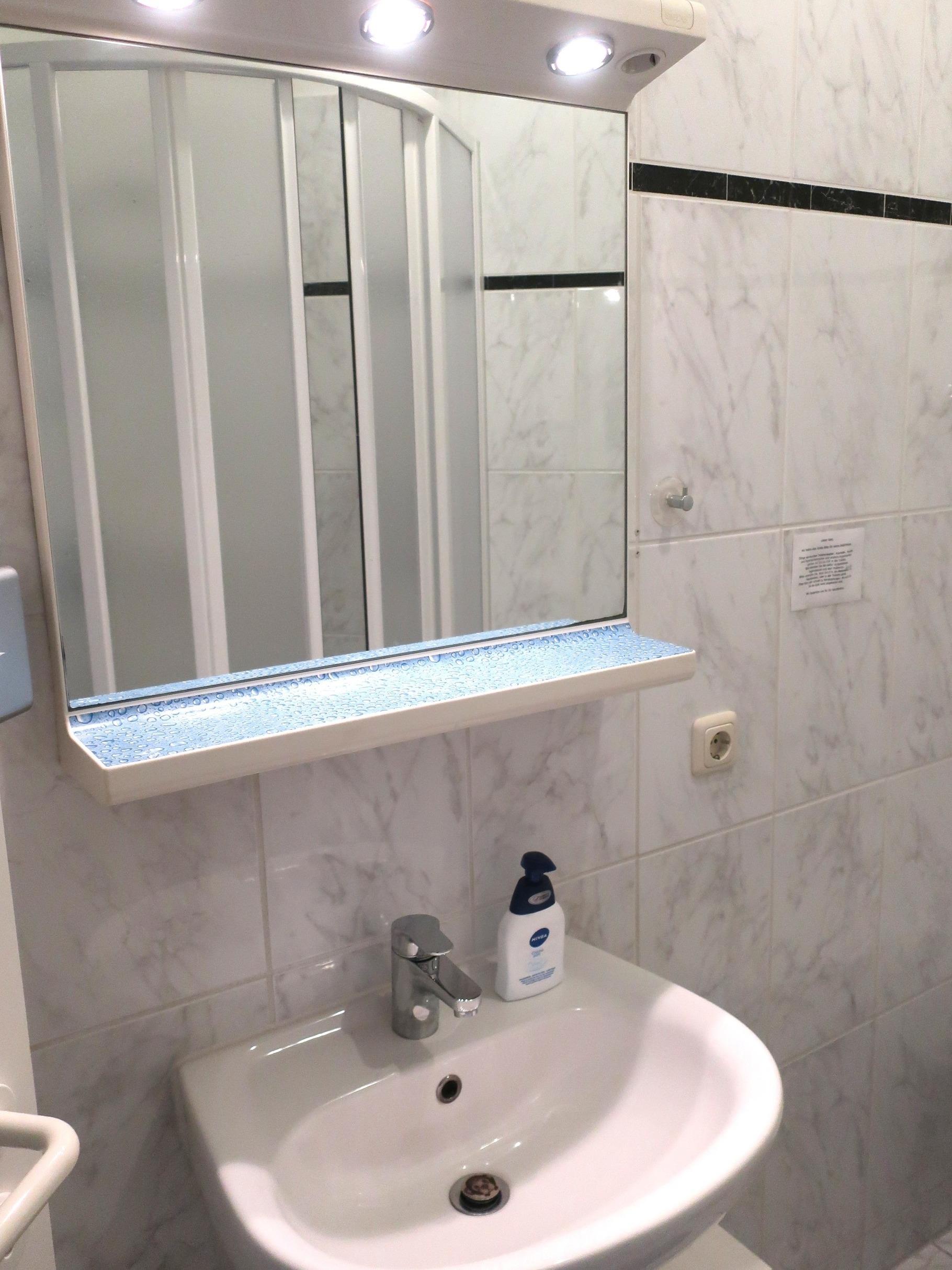 Das Doppelbett (180 cm x 200cm) und ein Kleiderschrank stehen separat im Zimmer. Das Bad ist mit einem Waschbecken, Toilette und Dusche ausgestattet. Seife und ein Fön sind vorhanden.