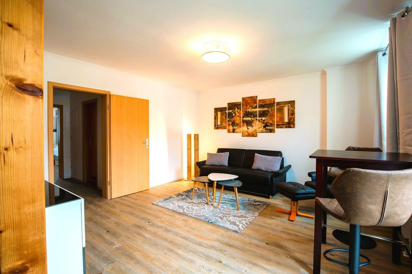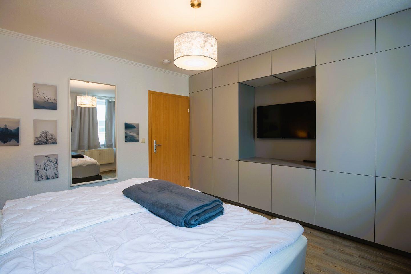 Im Wohnbereich haben Sie dank des komfortablen Sofas und dem großen Flachbild-TV alle Möglichkeiten zu entspannen und den Tag ausklingen zu lassen. Von hier aus erreichen Sie auch den Süd-Balkon, welcher auf der Innenhofseite liegt. In der halboffenen und voll ausgestatteten Küche finden Sie alles, was sie für einen angenehmen Aufenthalt benötigen. Im Schlafzimmer befindet sich neben dem Doppel-Boxspringbett und einer großzügigen Schrankwand ebenfalls ein großer Flachbild-TV. Abgerundet wird die Unterkunft durch ein geräumiges Badezimmer mit Duschbadewanne und großem Spiegel.
