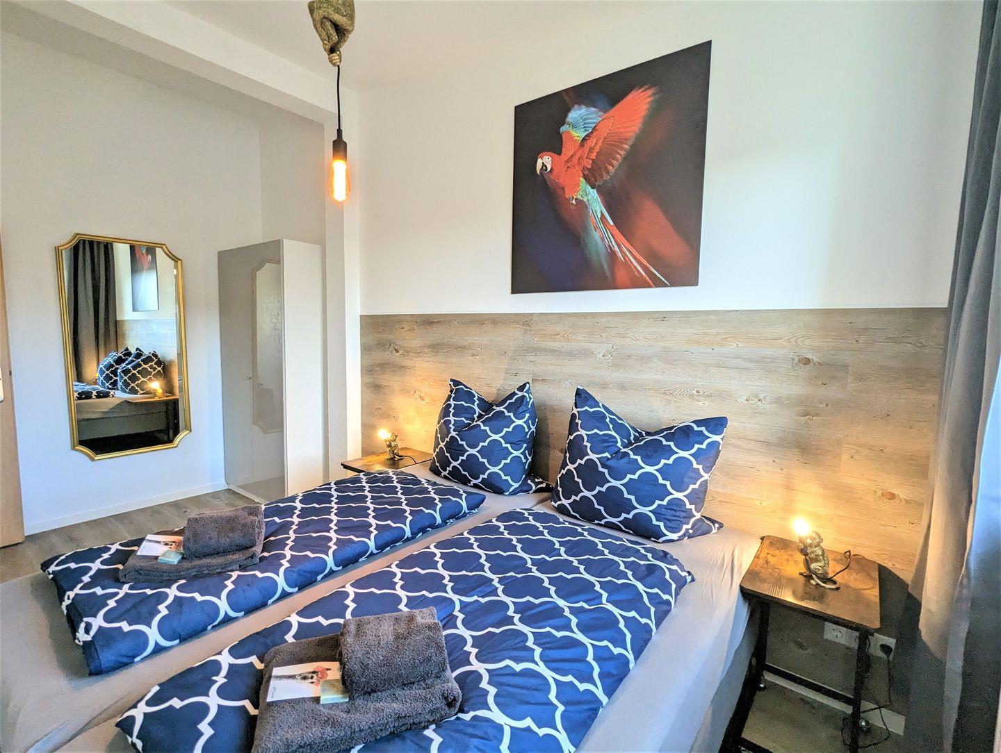 Das zweite Schlafzimmer, ebenfalls mit reichlich Stauraum verfügt über ein weiteres Doppel-Boxspringbett oder alternativ 2 Einzelbetten.