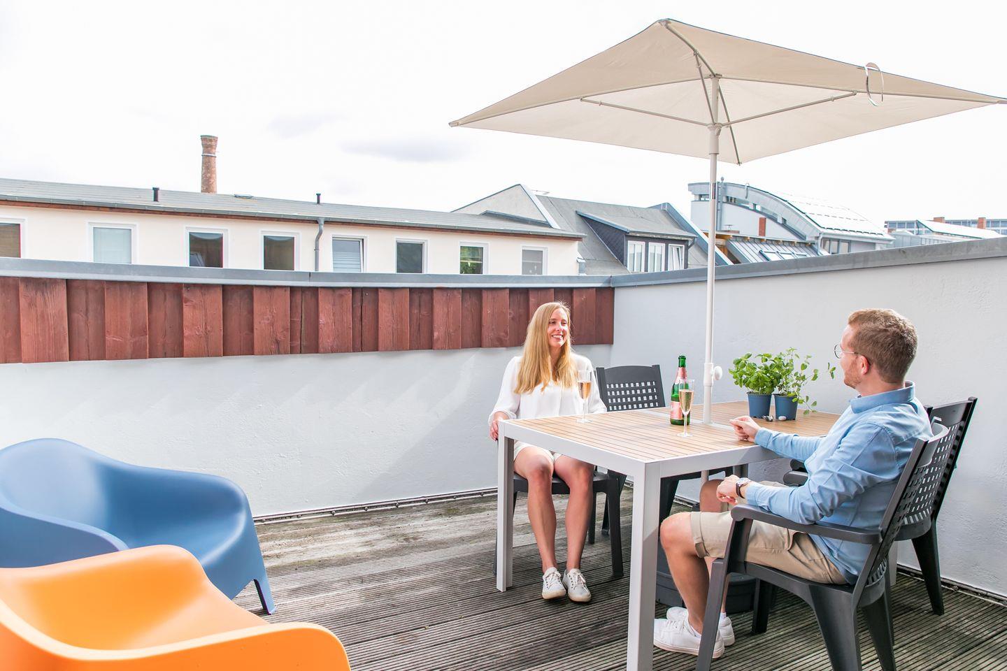 80m² Apartment mit 2 Schlafzimmern mit Doppelbett (oder Einzelbetten) und bequemen Schlafsofa im Wohnzimmer für 1-6 Personen mit herrlicher Dachterrasse und Süd-Balkon, voll eingerichteter Küche, modernem Wohnzimmer und Bad mit Badewanne und Dusche im Herzen des Szeneviertels.