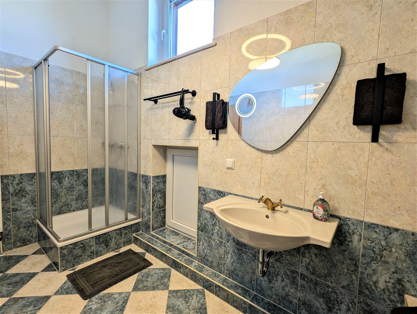 Abgerundet wird die Unterkunft durch ein geräumiges Badezimmer mit Dusche und Badewanne und großem Spiegel.