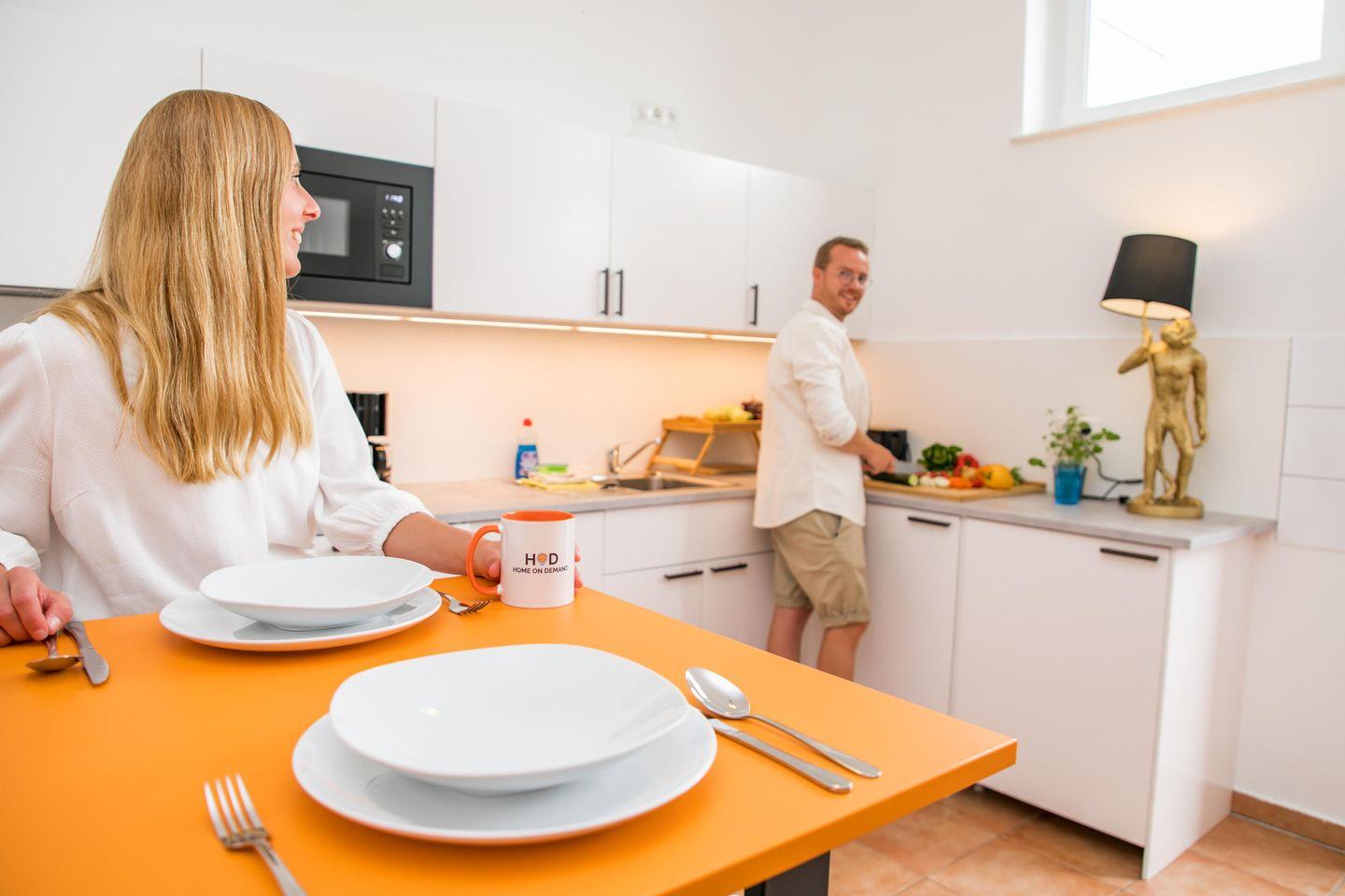 Im Wohnbereich haben Sie dank des komfortablen (Schlaf-)Sofas und dem großen Flachbild-TV alle Möglichkeiten zu entspannen und den Tag ausklingen zu lassen. Von hier aus erreichen Sie auch den Süd-Balkon, welcher auf der Innenhofseite liegt. In der voll ausgestatteten Küche finden Sie alles, was sie für einen angenehmen Aufenthalt benötigen.