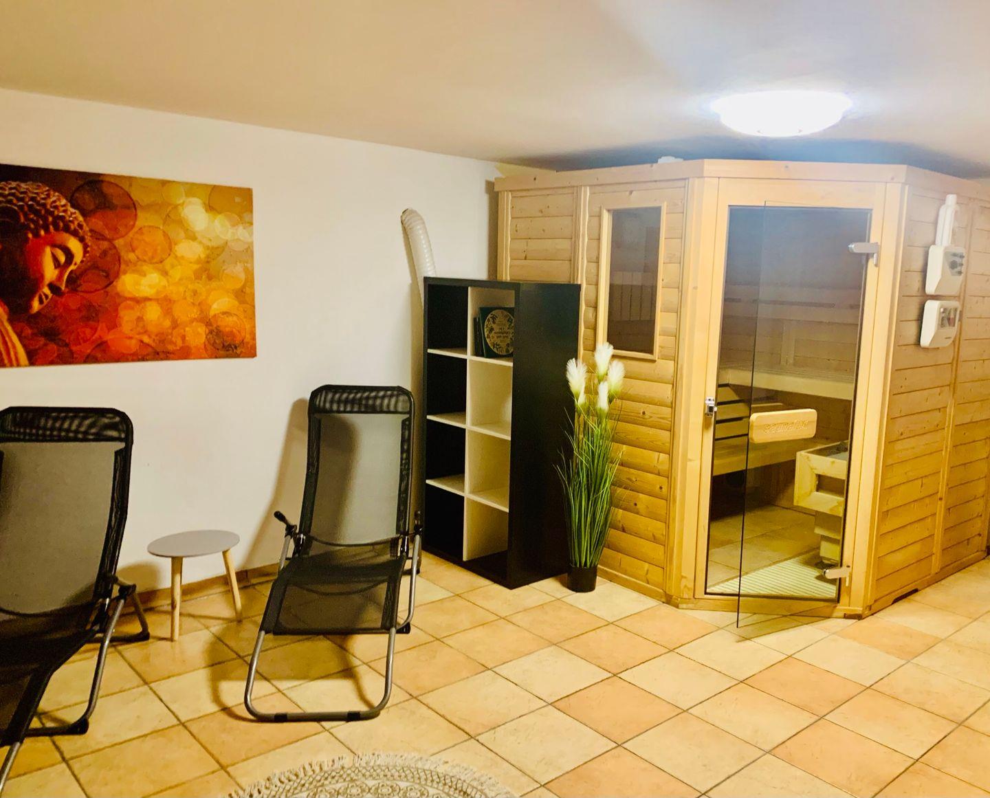 Im Erd-/Untergeschoss finden Sie eine Sauna und einen Ruheraum mit Kamin und Entspannungsmusik. Auch der Waschraum mit der Waschmaschine und allen Reinigungsgegenständen (Besen etc.). Außerdem finden sie hier ein großes Schlafzimmer mit einem Boxspringbett und einem Schlafsessel sowie ein Zustellbett. Das unten liegende Wohnzimmer ist mit Terassentür und einer offenen Wohnküche ausgestattet. Spülmaschine, Smart-TV, Eckcouch, Esstisch etc.. Angrenzend ist das kleine aber feine Badezimmer mit Dusche.
